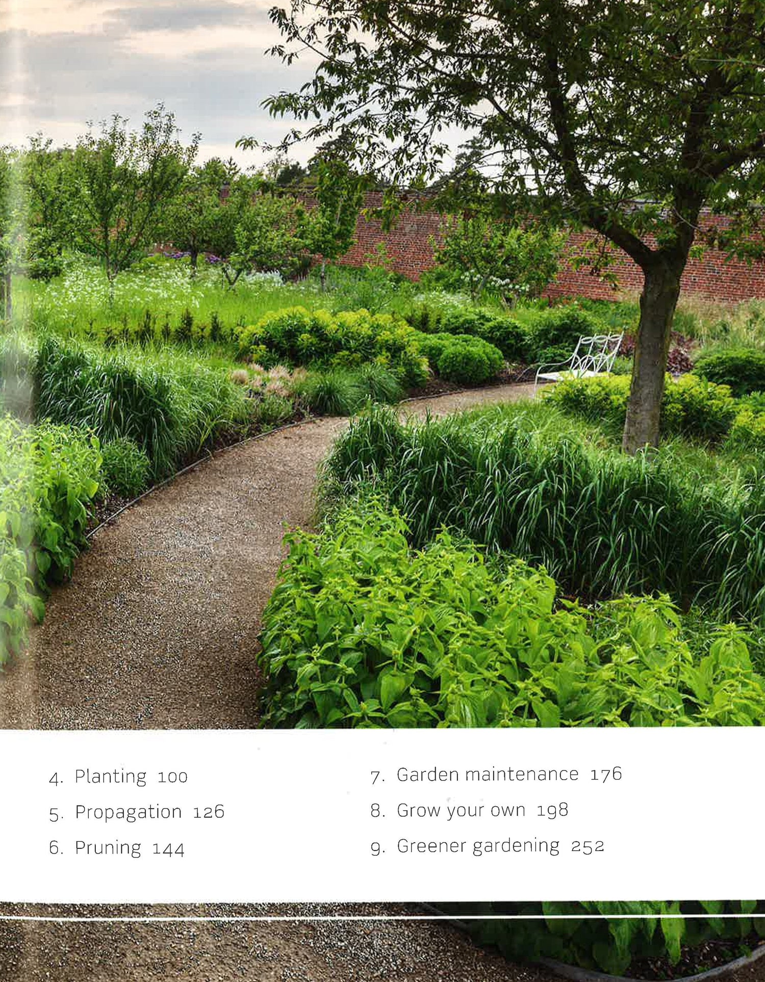 Garden basics - soil type, aspect, weeding and digging, plant picker guide of what to grow, where and when; Designing your garden - function vs aesthetics, landscaping, low-maintenance gardening, container gardening and a return to lost styles and techniques; Lawn care and alternatives to lawns; Planting; Propagation; Pruning; Garden maintenance; Grow your own - growing fruit, vegtables and herbs, crop rotation, advantages of growing your own; Greener gardening and wildlife gardening - natural alternatives, how to encourage wildlife, how to deter pests without damaging the environment, beehives and composting tips.