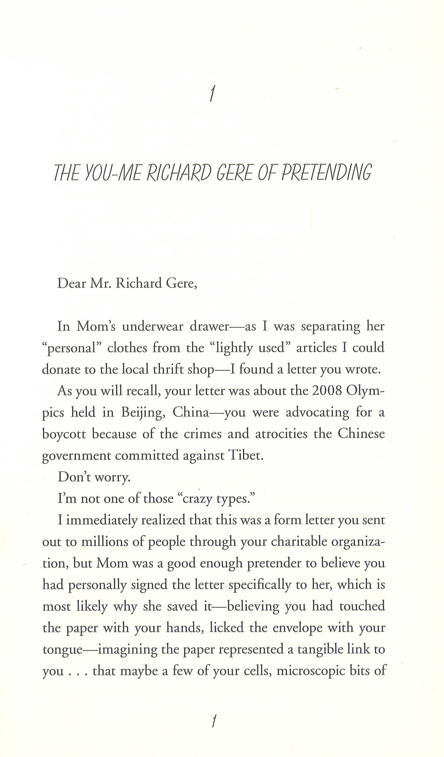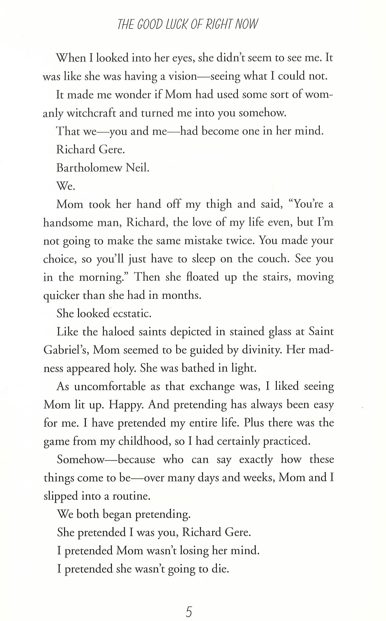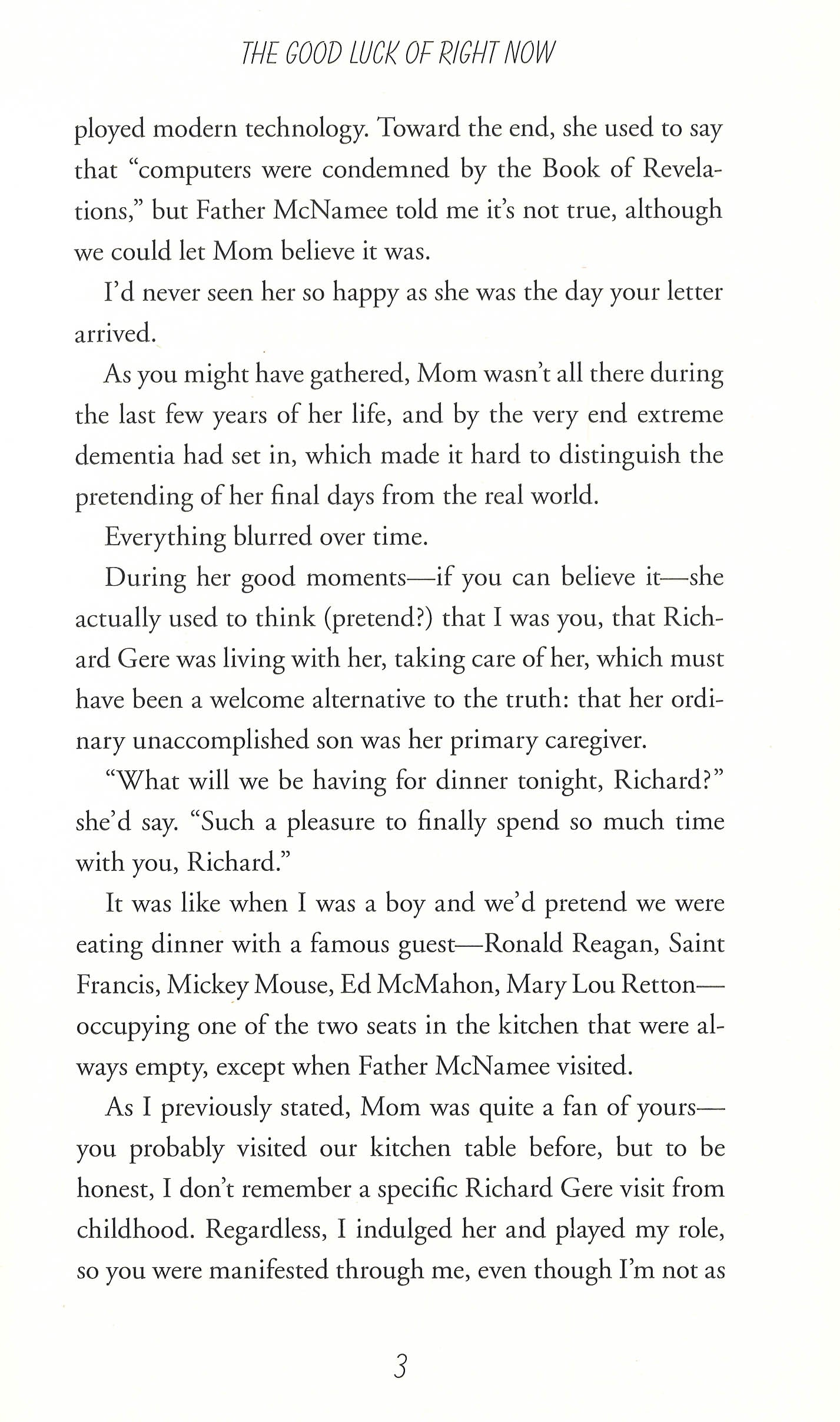 For thirty-eight years, Bartholomew Neil has lived with his mother. But when she dies, he has no idea how to be on his own. His grief counsellor, Wendy, says he needs to find his flock and leave the nest. But how does a man whose whole life has been grounded in his mom, Saturday mass, and the library learn how to fly? Bartholomew thinks he's found a clue when he discovers a "Free Tibet" letter from Richard Gere hidden in his mother's underwear drawer. Believing that the actor is meant to help him, Bartholomew awkwardly starts his new life, writing Richard Gere a series of highly intimate letters. Philosophy and faith, alien abduction and cat telepathy, the Catholic Church and the mystery of women, are all explored in his soul-baring epistles. But mostly the letters reveal one man's heart-breakingly earnest attempt to assemble a family of his own. Eventually a family of sorts assembles, and Bartholomew is joined by this unlikely crew of companions on his quest to find his biological father... but what they discover is so much more.