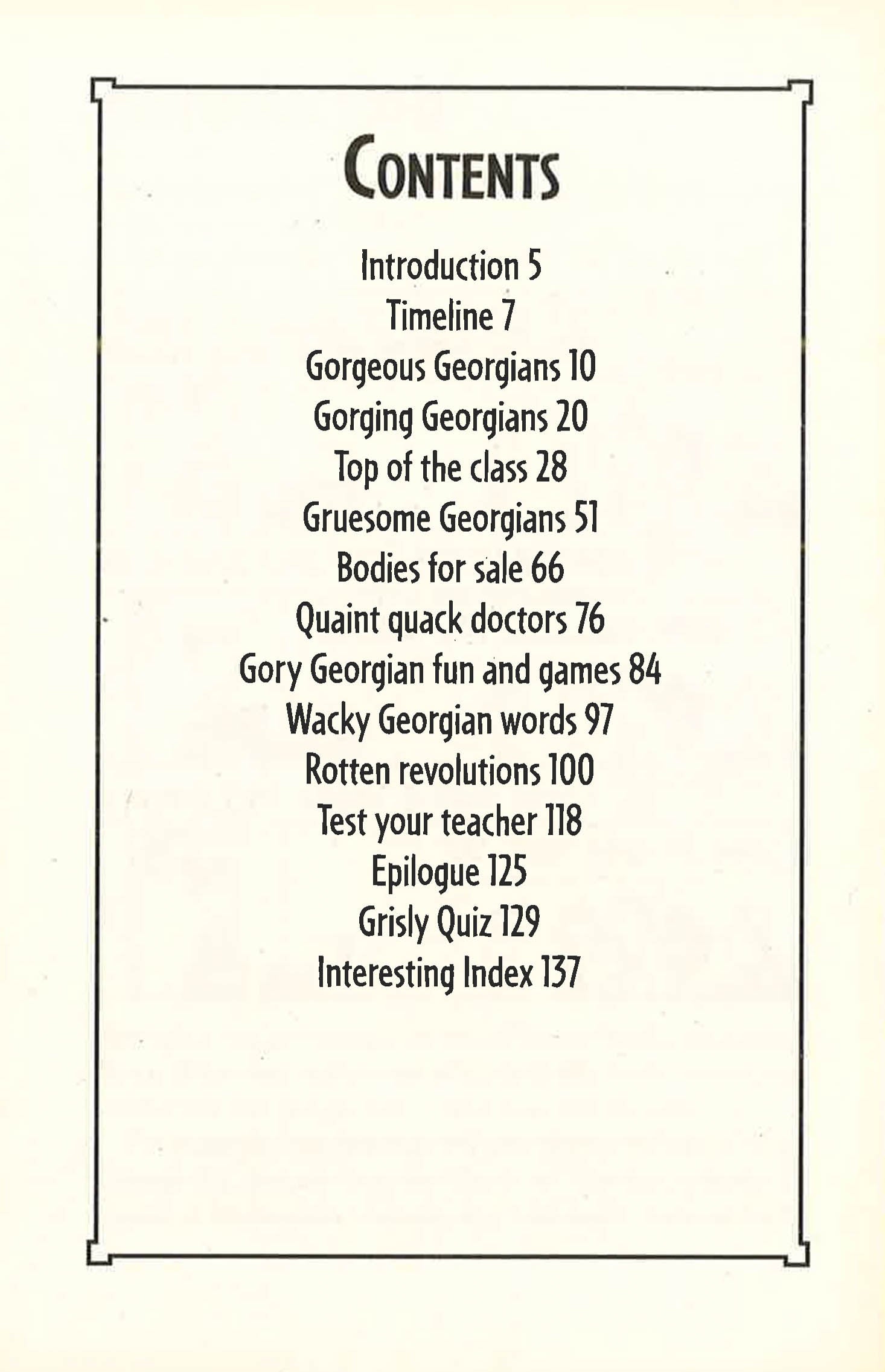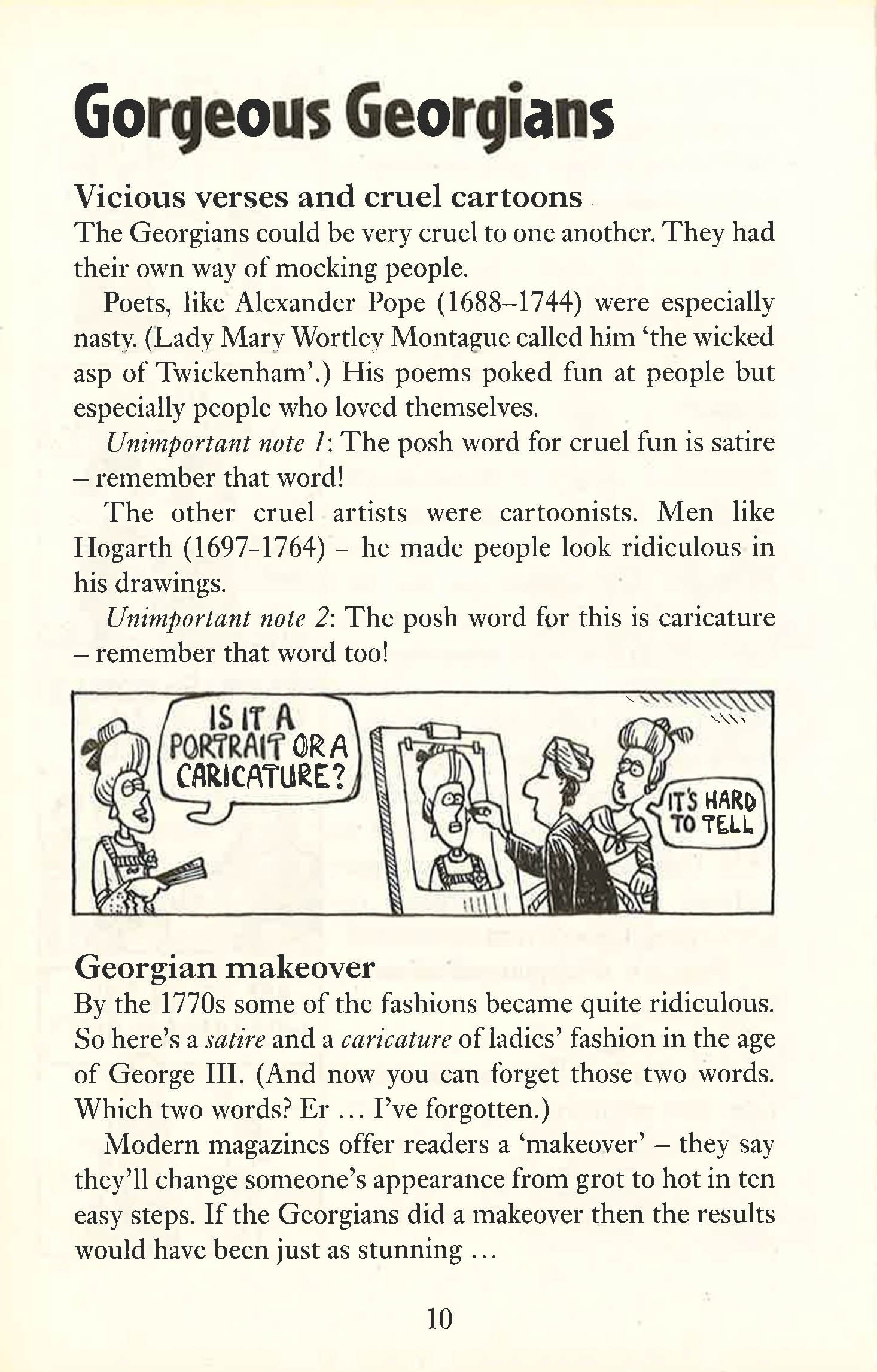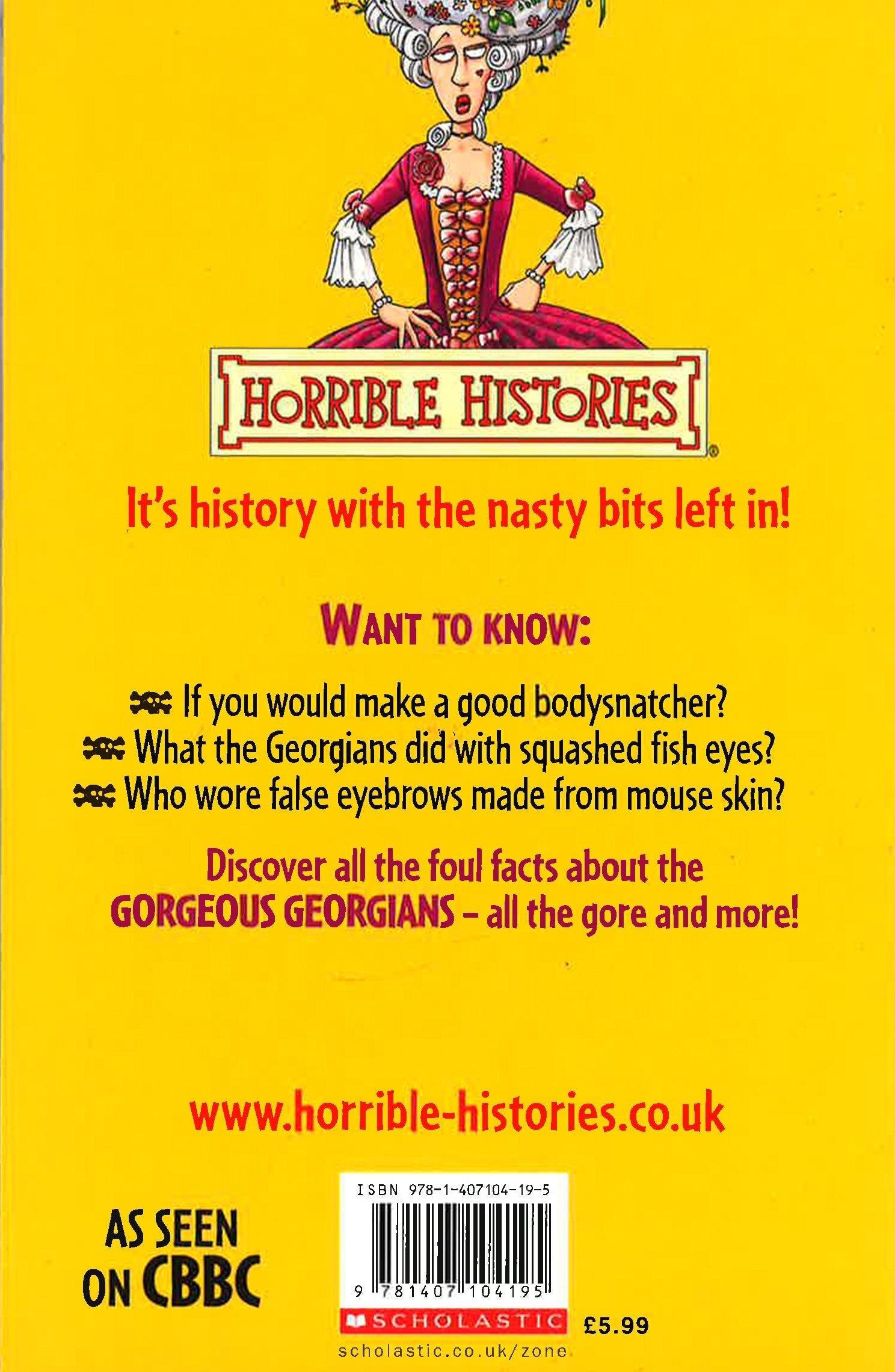 Learn all about the Gorgeous Georgians with all the nasty bits left in. You probably thought that Georgians just spent their time prancing about in powdered wigs and pantaloons. Find out the horrible truth, like their sneaky schemes for hiding personal hygiene problems and about the schoolchildren who went to war with their teachers! Includes a grisly quiz to test your knowledge. These bestselling titles are sure to be a huge hit with yet another generation of Terry Deary fans.