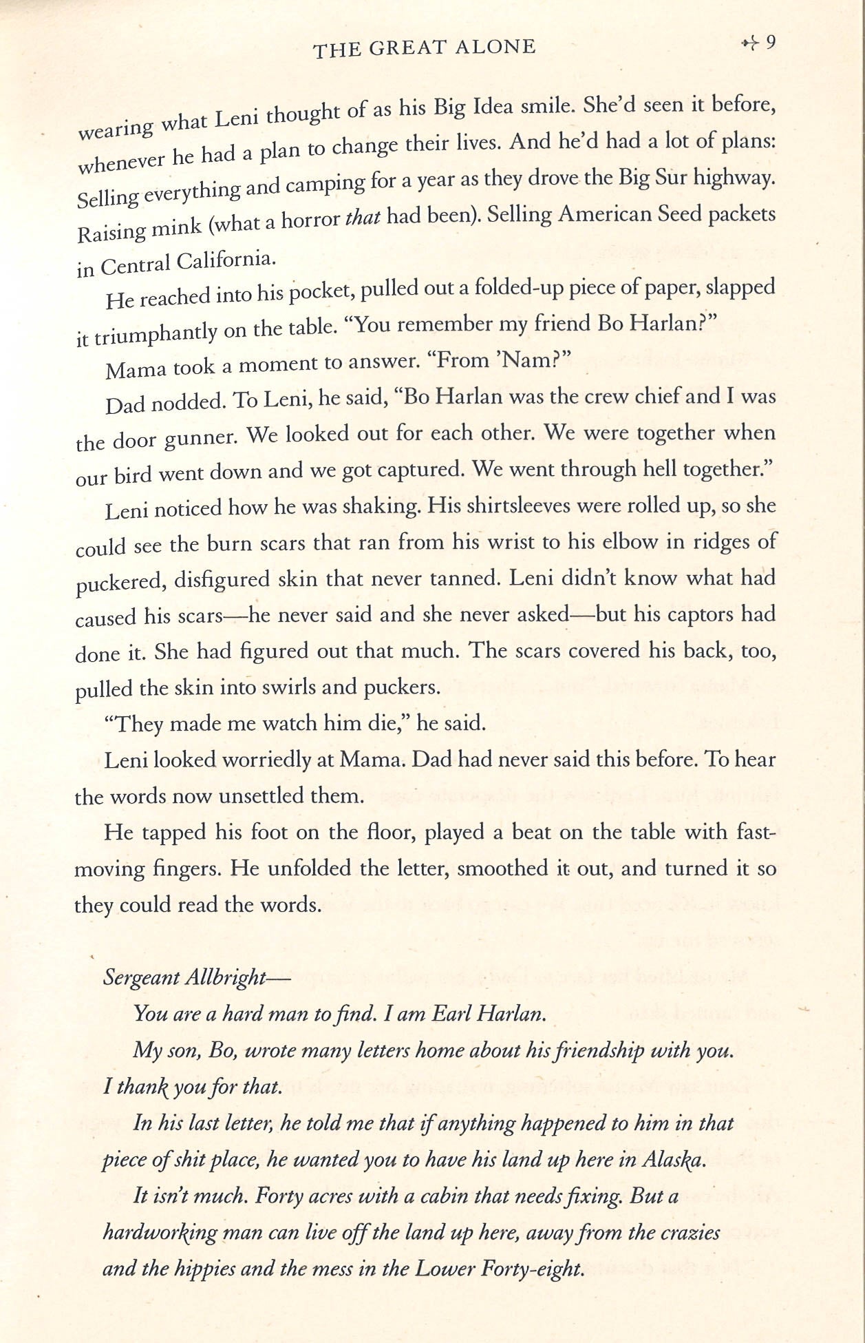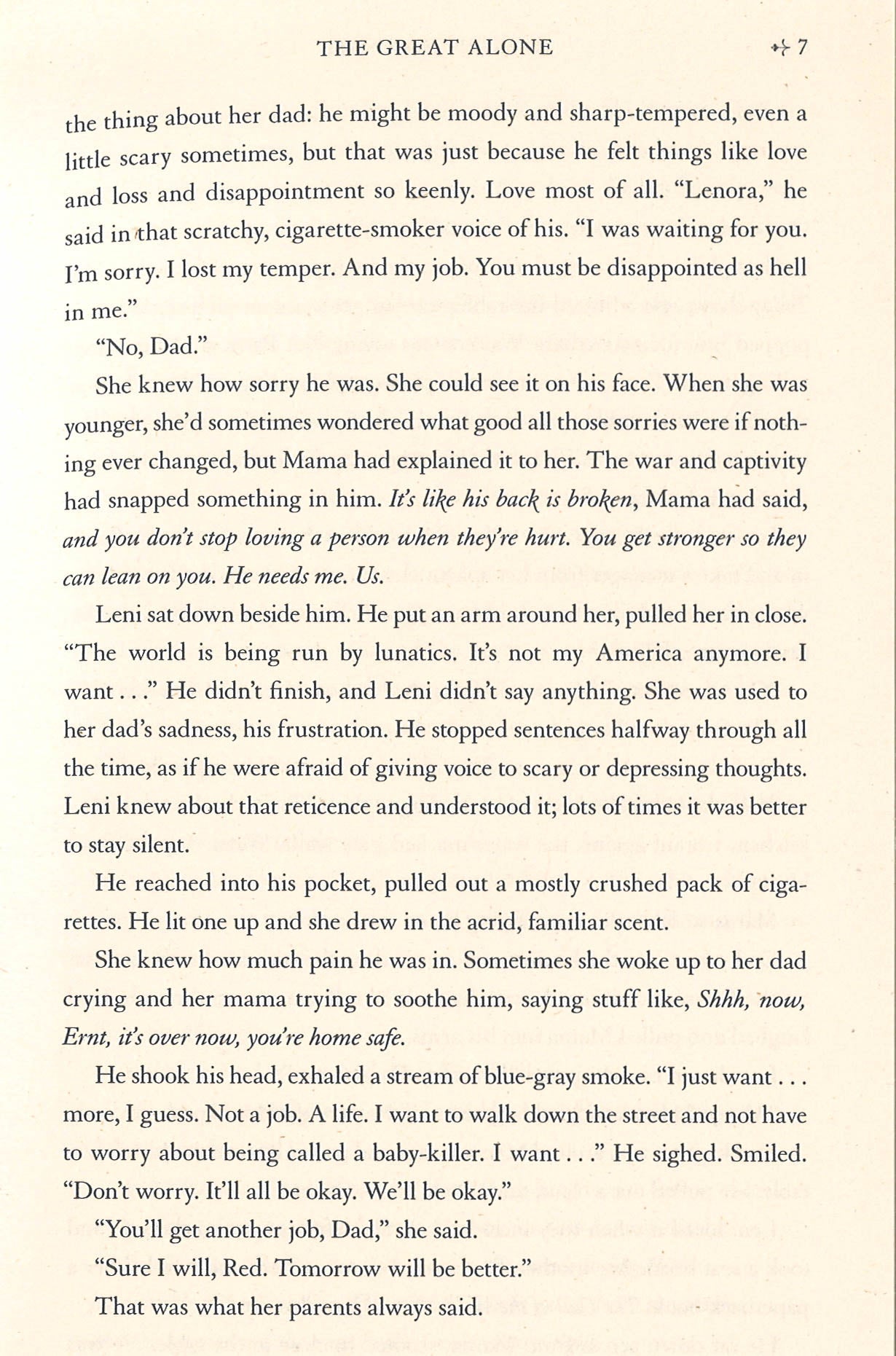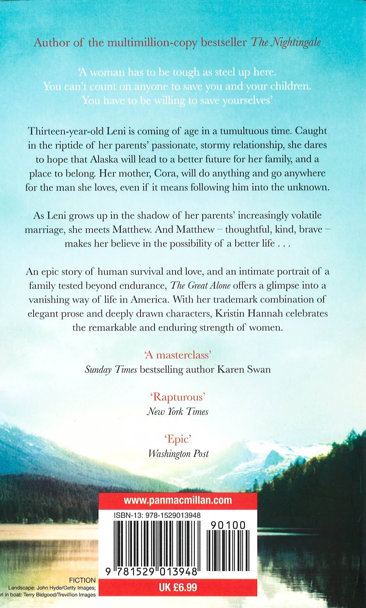A gripping novel of family dynamics, heartbreak and hope which tugs at the heartstrings, set against the beauty of the Alaskan wilderness, from the bestselling author of The Nightingale.A New York Times number one bestseller, The Great Alone by Kristin Hannah is a daring, beautiful, stay-up-all-night story about love and loss, the fight for survival, and the wildness that lives in both man and nature.Thirteen-year-old Leni, a girl coming of age in a tumultuous time, is caught in the riptide of her parents' passionate, stormy relationship, dares to hope that Alaska will lead to a better future for her family. She is desperate for a place to belong. Her mother, Cora, will do anything and go anywhere for the man she loves, even if means following him into the unknown. At once an epic story of human survival and love, and an intimate portrait of a family tested beyond endurance, The Great Alone offers a glimpse into a vanishing way of life in America. With her trademark combination of elegant prose and deeply drawn characters, Kristin Hannah has delivered an enormously powerful story that celebrates the resilience of the human spirit and the remarkable and enduring strength of women.The Great Alone is perfect for all those who loved The Light Between Oceans, and fans of Jodi Picoult, Victoria Hislop and Diane Chamberlain.'Compelling. Moving. Unforgettable' Sunday Times bestselling author Karen Swan