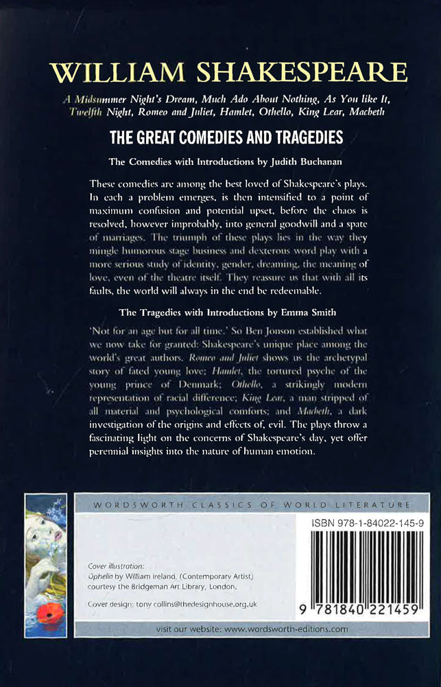 The Comedies with Introductions by Judith Buchanan These Comedies are among the best loved of Shakespeare's plays. In each a problem emerges, is then intensified to a point of maximum confusion and potential upset, before the chaos is resolved, however improbably, into general goodwill and a spate of marriages. The triumph of these plays lies in the way they mingle humorous stage business and dexterous word play with a more serious study of identity, gender, dreaming, the meaning of love, even of the theatre itself. They reassure us that with all its faults, the world will always in the end be redeemable. The Tragedies with Introductions by Emma Smith 'Not for an age but for all time.' So Ben Jonson established what we now take for granted: Shakespeare's unique place among the world's great authors. Romeo and Juliet shows us the archetypal story of fated young love; Hamlet, the tortured psyche of the young prince of Denmark; Othello, a strikingly modern representation of racial difference; King Lear, a man stripped of all material and psychological comforts; and Macbeth, a dark investigation of the origins and effects of, evil. The plays throw a fascinating light on the concerns of Shakespeare's day, yet offer perennial insights into the nature of human emotion.