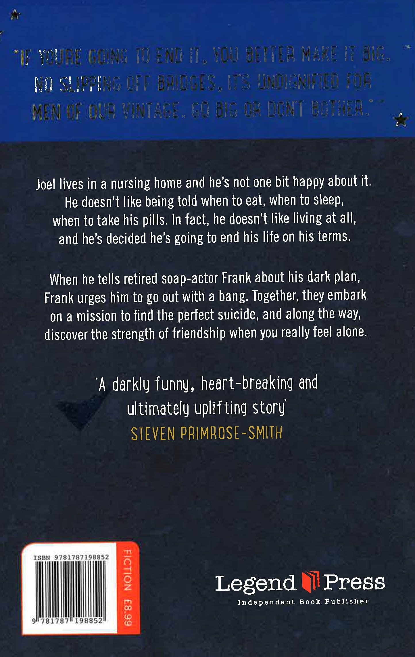 'Dan [...] introduces us to a shocking post-trauma world where everything and nothing makes perfect sense'. Annie West, award-winning illustrator 'I've never read anything quite like it ... funny, moving and terrifying all at once.' Rick O'Shea ? If you're going to end it, you better make it big. No slipping off bridges, it's undignified for men of our vintage. Go big or don't bother. Joel lives in a nursing home and he's not one bit happy about it. He doesn't like being told when to eat, when to sleep, when to take his pills. In fact, he doesn't like living at all, and he's decided he's going to end his life on his terms. When he tells retired soap-actor Frank about his dark plan, Frank urges him to go out with a bang. Together, they embark on a mission to find the perfect suicide, and along the way, discover the strength of friendship when you really feel alone. 'An engaging and poignant story that deserves to be read and enjoyed' Juliet Conlin 'A brilliantly rallying cry to society filled with wonderful characters and brilliant humour' The Bookbag 'A darkly funny, heart-breaking and ultimately uplifting story' Steven Primrose-Smith