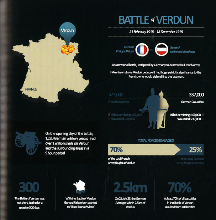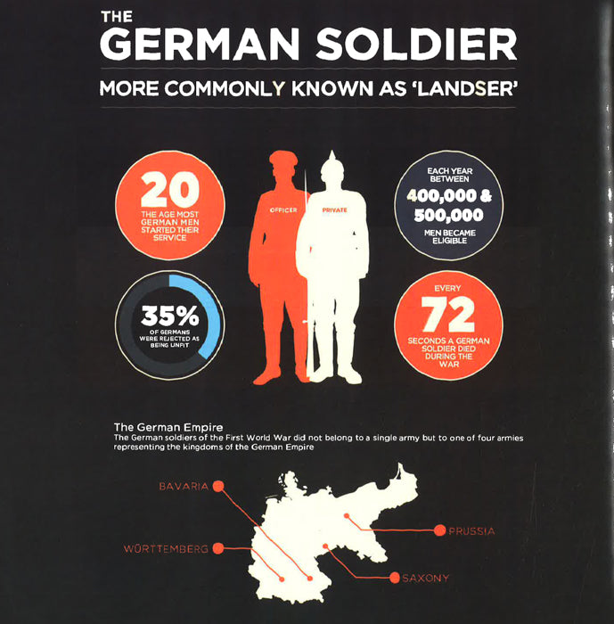 Explore the First World War as never before in stunningly designed infographics, and enjoy a unique way of finding out about all aspects of this grave conflict. From the weapons used to the men on the ground, this fascinating new approach offers informative, easy-to-digest facts about the Great War that can be understood and pored over by people of all ages. So delve into The Great War 100 today and be stunned as history comes alive as never before.
