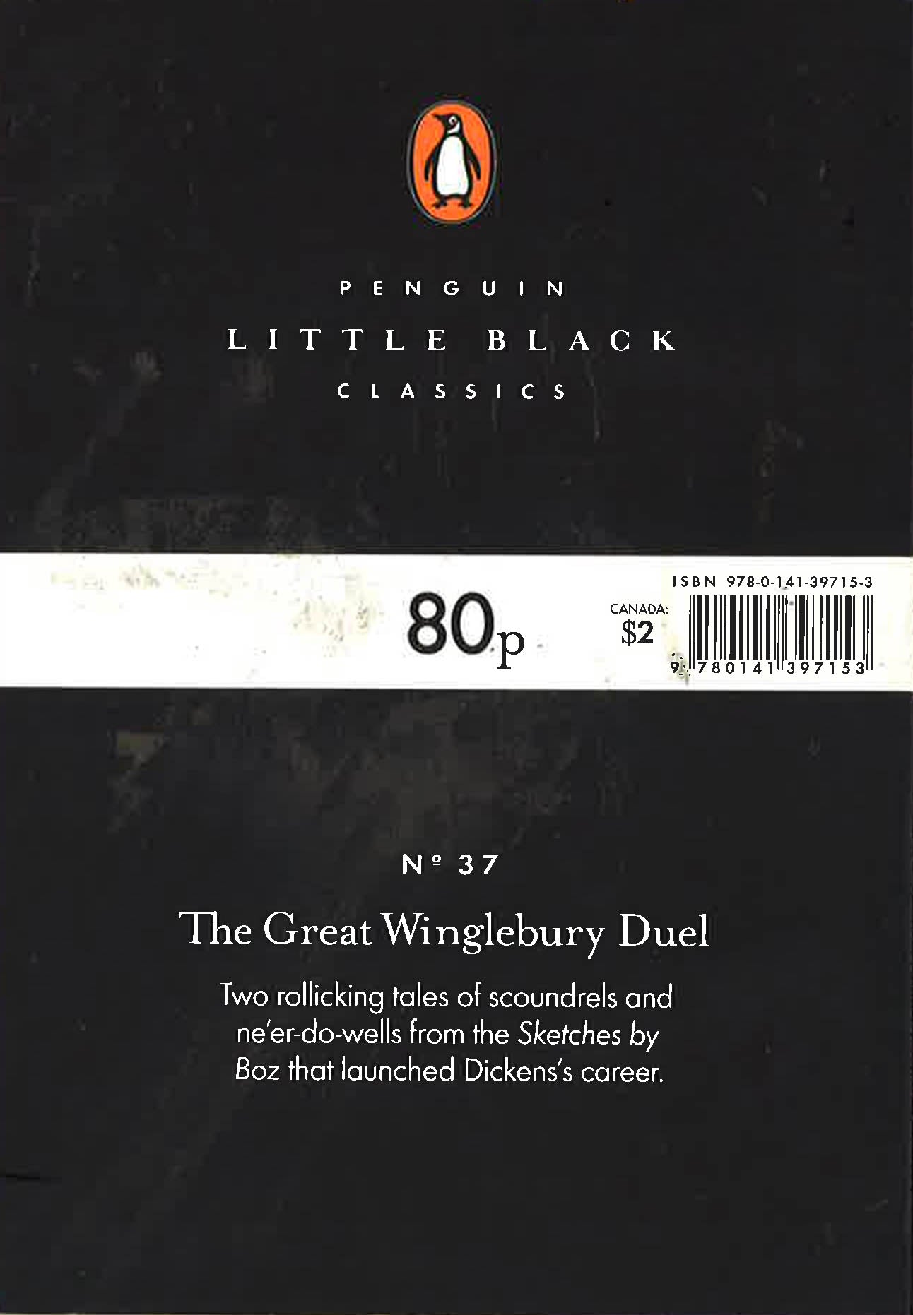 Includes stories from Sketches by Boz: 'The Great Winglebury Duel' and 'Bloomsbury Christening.' Desperate-minded villain!'Two of Dickens' hilarious early stories from Sketches by Boz: 'The Great Winglebury Duel' and 'Bloomsbury Christening'Introducing Little Black Classics: 80 books for Penguin's 80th birthday. Little Black Classics celebrate the huge range and diversity of Penguin Classics, with books from around the world and across many centuries. They take us from a balloon ride over Victorian London to a garden of blossom in Japan, from Tierra del Fuego to 16th century California and the Russian steppe. Here are stories lyrical and savage; poems epic and intimate; essays satirical and inspirational; and ideas that have shaped the lives of millions.Charles Dickens (1812-1870). All Dickens' novels and other major works are available in Penguin Classics.