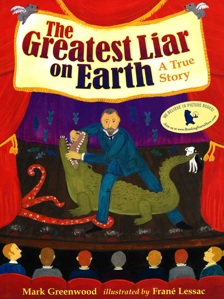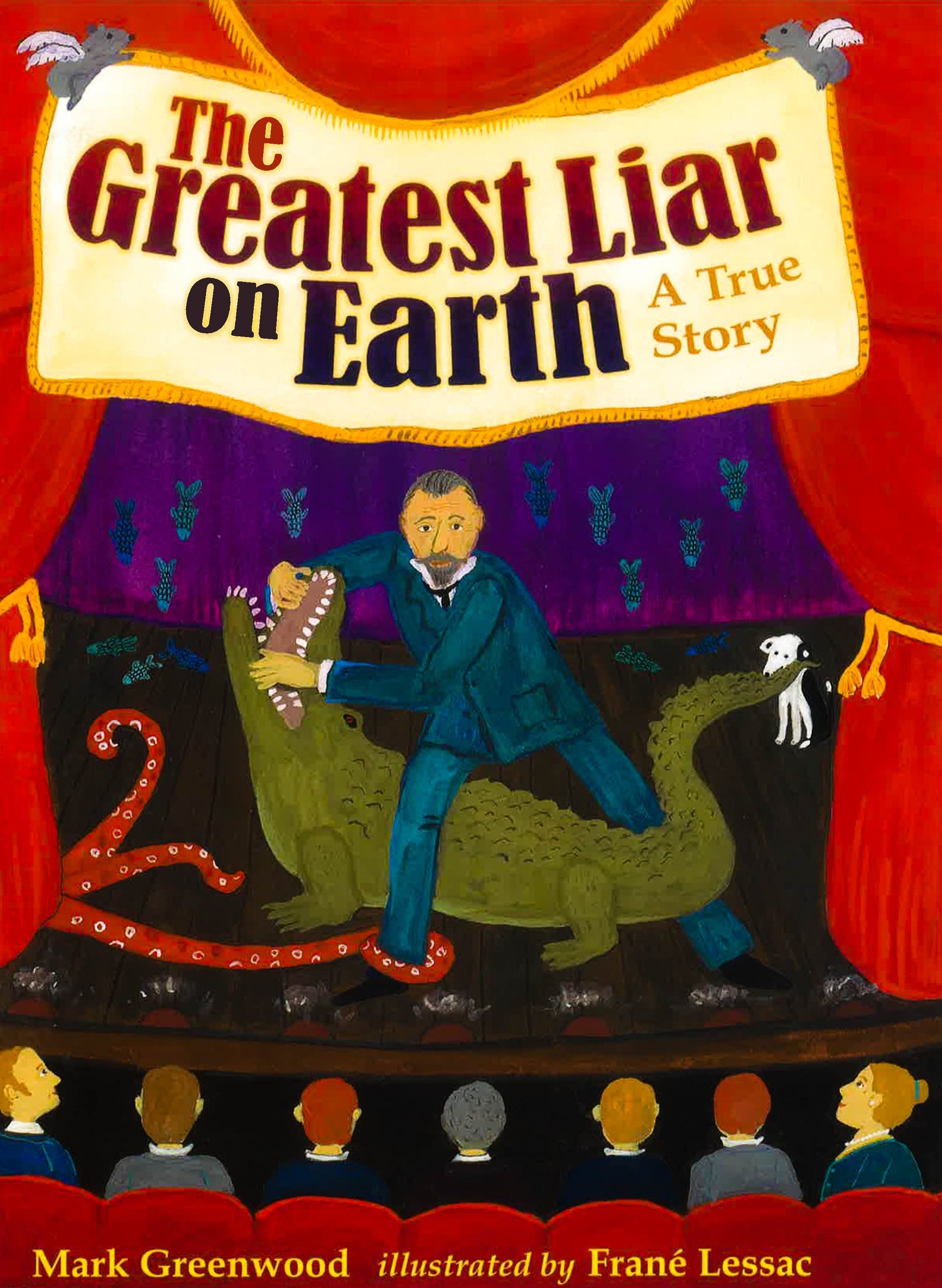 Lessac’s naïf gouache illustrations keep pace with de Rougemont’s tall tales…Greenwood’s story of a forgotten fabulasks whether the truth is all it’s cracked up to be—especially in show biz.