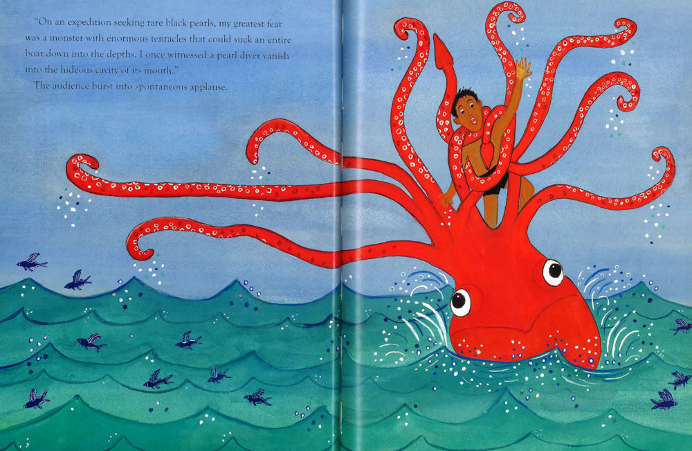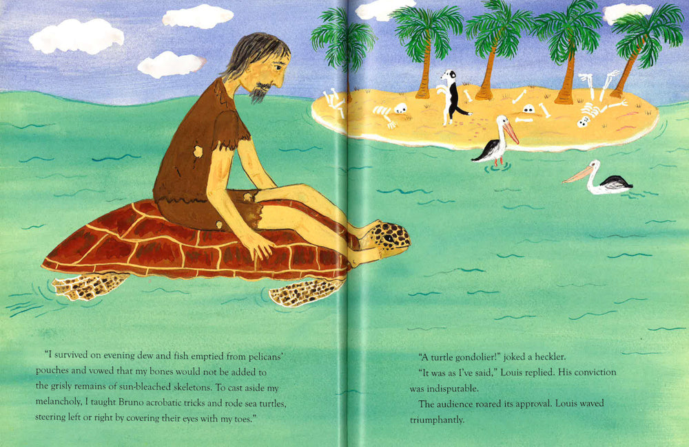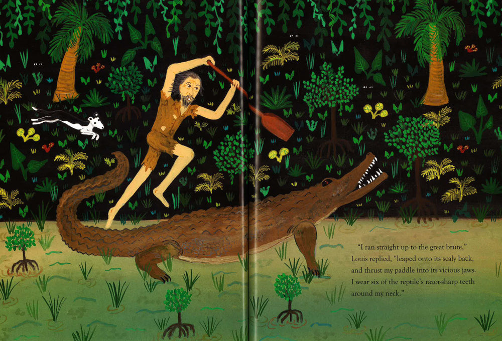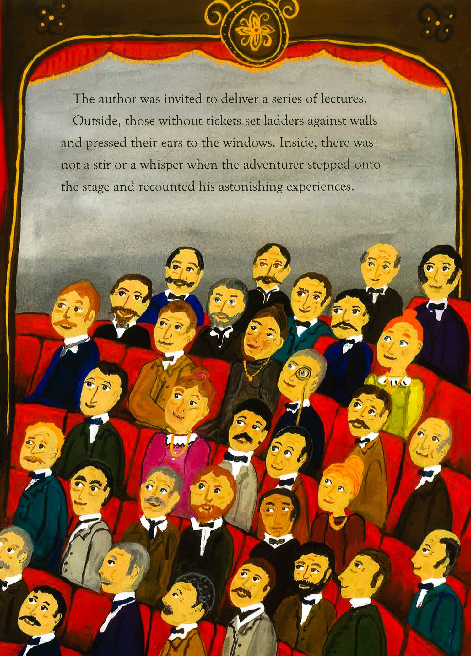 There is not a whisper when Louis de Rougemont steps onto the stage to recount his astonishing experiences on the sea and in lands far away. It is a breathtaking tale of catastrophe and miraculous events. A monster with enormous tentacles! A sea turtle big enough to ride! Fish raining from the sky! Cannibals! But critics say he is an imposter with a gift for spinning yarns. Are Louis’s tales true? Or is he the greatest liar on Earth? Bold, whimsical artwork brings to life the tale of an early-twentieth-century man who held audiences rapt while his critics dubbed him a hoaxer of the highest degree. A fun slice of history sure to inspire a lively discussion of truth, fabrication, and the gray areas in-between.