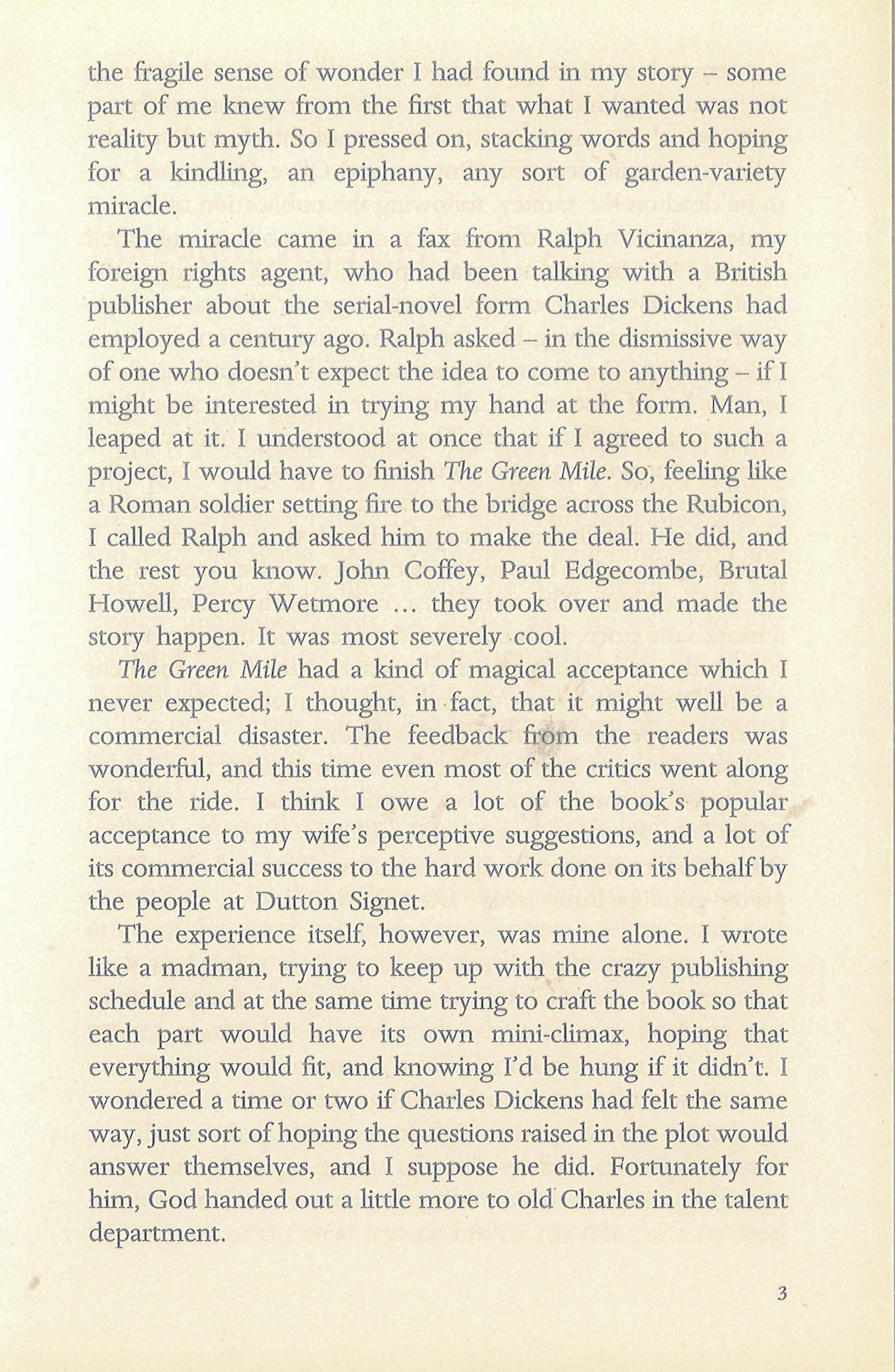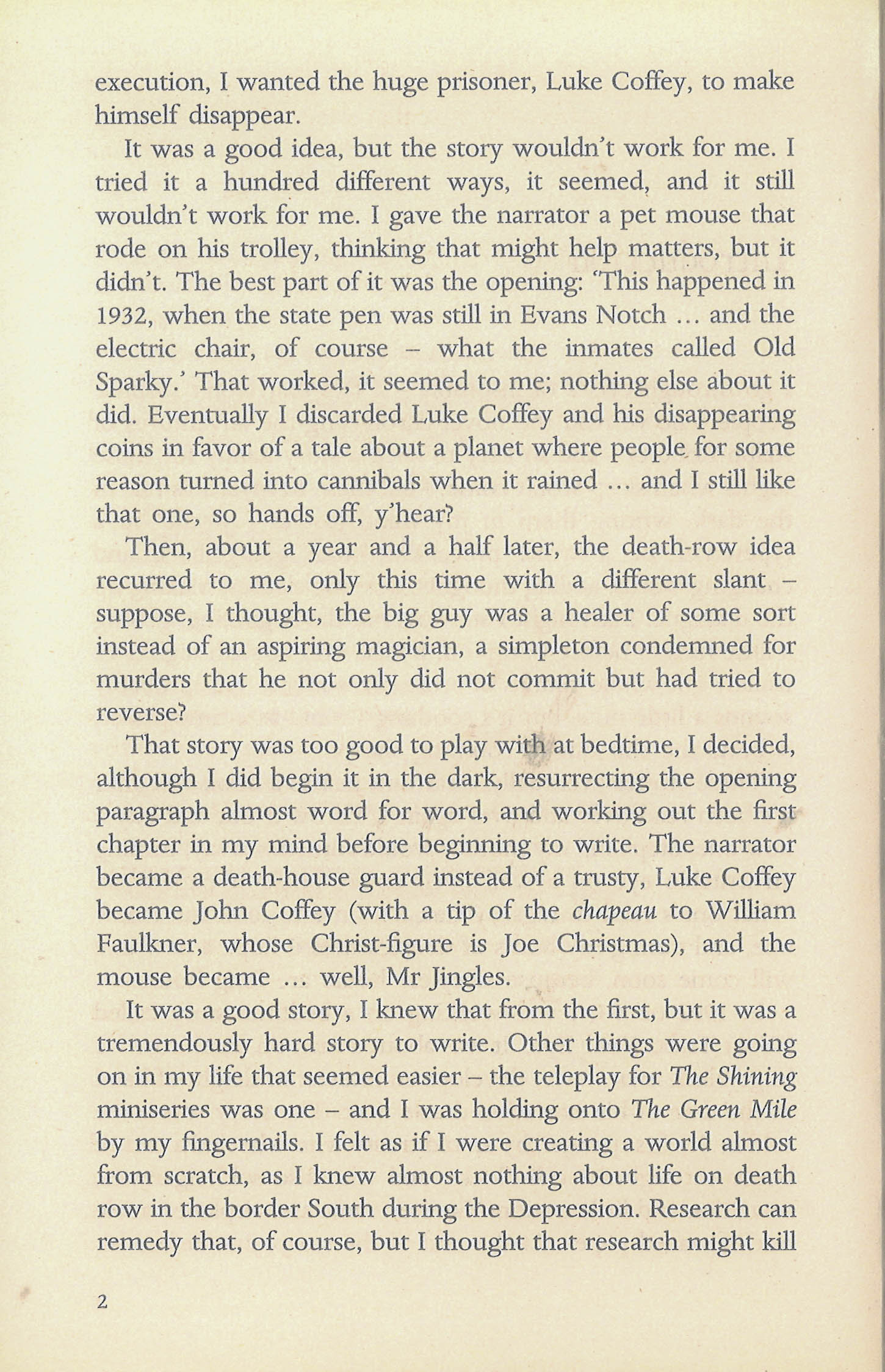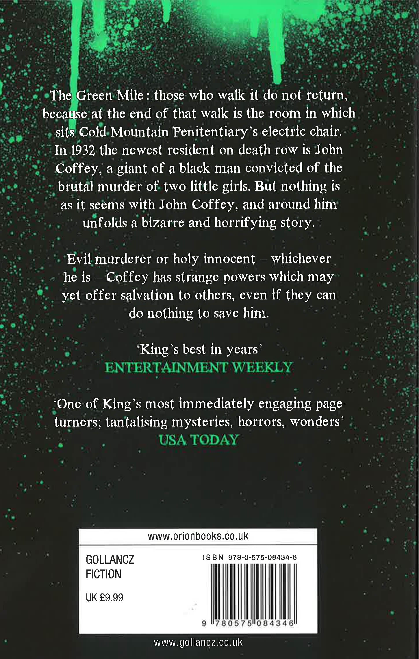 Stephen King's international bestselling and highly acclaimed novel, also a hugely successful film starring Tom Hanks The Green Mile: those who walk it do not return, because at the end of that walk is the room in which sits Cold Mountain penitentiary's electric chair. In 1932 the newest resident on death row is John Coffey, a giant black man convicted of the brutal murder of two little girls. But nothing is as it seems with John Coffey, and around him unfolds a bizarre and horrifying story. Evil murderer or holy innocent - whichever he is - Coffey has strange powers which may yet offer salvation to others, even if they can do nothing to save him.
