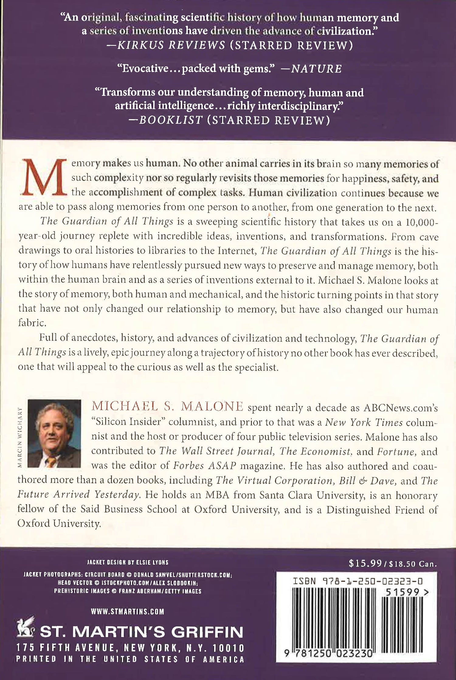 A fascinating exploration of the history of memory and human civilization Memory makes us human. No other animal carries in its brain so many memories of such complexity nor so regularly revisits those memories for happiness, safety, and the accomplishment of complex tasks. Human civilization continues because we are able to pass along memories from one person to another, from one generation to the next. The Guardian of All Things is a sweeping scientific history that takes us on a 10,000-year-old journey replete with incredible ideas, inventions, and transformations. From cave drawings to oral histories to libraries to the internet, The Guardian of All Things is the history of how humans have relentlessly pursued new ways to preserve and manage memory, both within the human brain and as a series of inventions external to it. Michael S. Malone looks at the story of memory, both human and mechanical, and the historic turning points in that story that have not only changed our relationship to memory, but have also changed our human fabric. Full of anecdotes, history, and advances of civilization and technology, The Guardian of All Things is a lively, epic journey along a trajectory of history no other book has ever described, one that will appeal to the curious as well as the specialist.
