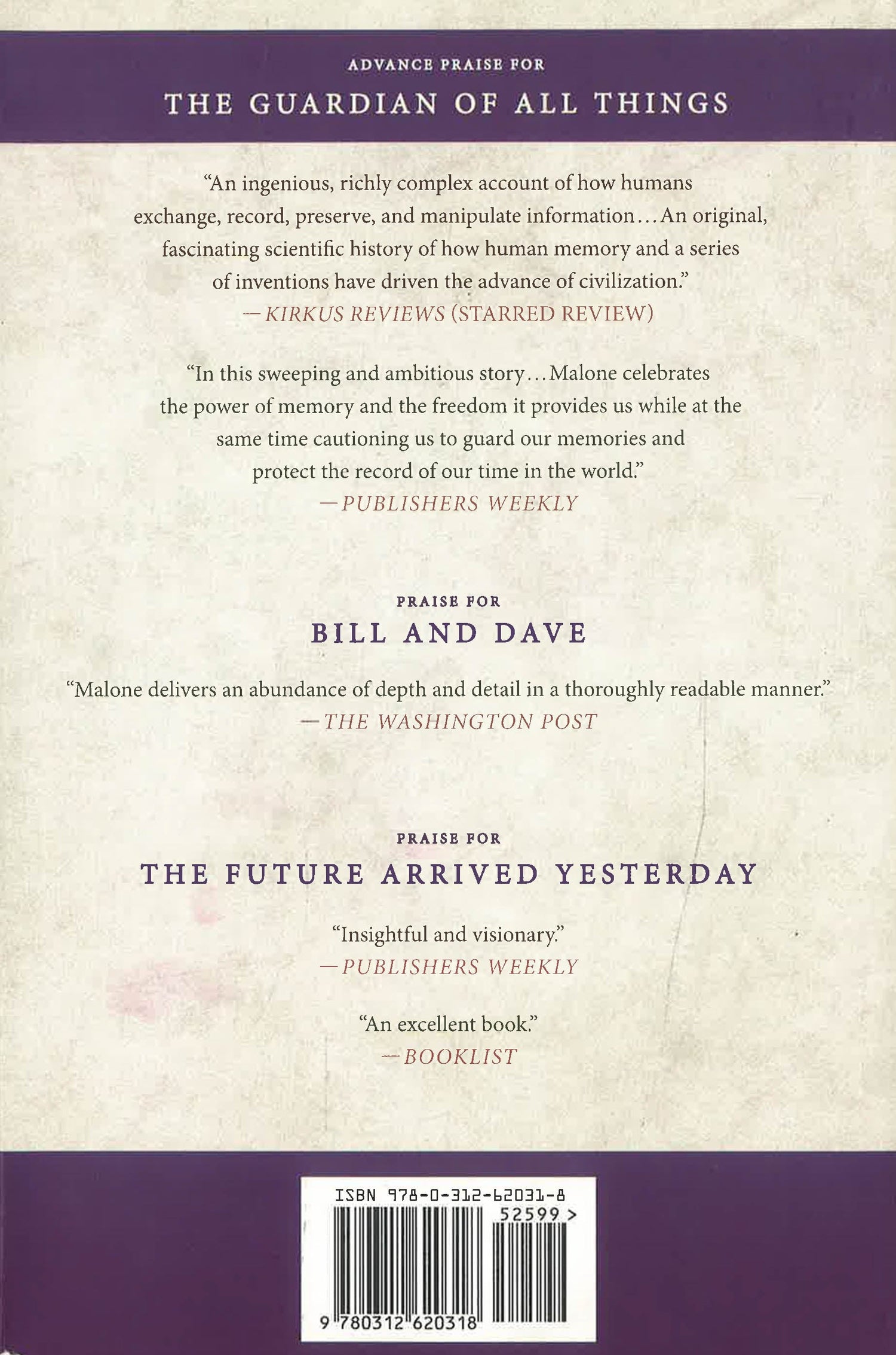 Memory makes us human. No other animal carries in its brain so many memories of such complexity nor so regularly revisits those memories for happiness, safety, and to accomplish complex tasks. Human civilization continues because we are able to pass along memories from one person to another, from one generation to the next. The "Guardian of All Things" is scientific history that takes us on a 10,000 year old journey replete with incredible ideas, inventions, and transformations. From cave drawings to oral histories to libraries to the internet, "The Guardian of All Things" is the history of how humans have relentlessly pursued new ways to preserve and manage memory, both within the human brain and in a series of inventions external to it. Michael Malone looks at the story of memory, both human and mechanical, and the historic turning points in that story that not only changed our relationship to memory, but also changed us as human beings. Full of anecdotes, history, and advances of civilization and technology, "The Guardian of All Things" is a lively, sweeping, and epic journey along a trajectory of history no other book has ever described, one that will appeal to the curious as well as the specialist.