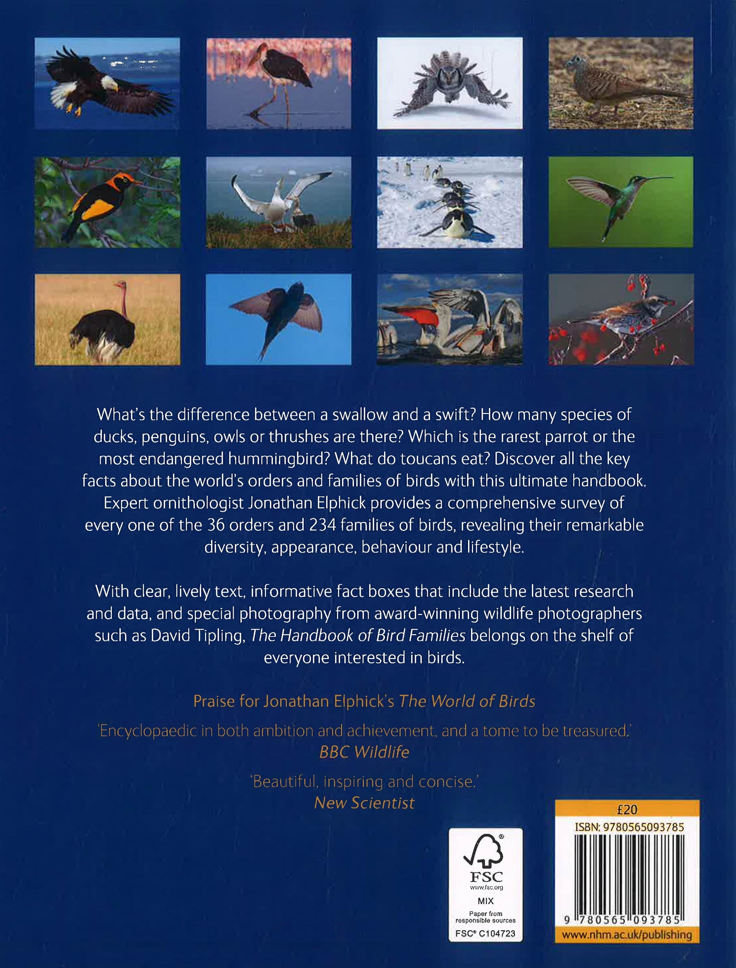 What's the difference between a swallow and a swift? How many species of ducks, penguins, owls or thrushes are there? Which is the rarest parrot or the most endangered hummingbird? What do toucans eat? Discover all the key facts about the world's orders and families of birds with this ultimate handbook. Expert ornithologist Jonathan Elphick provides a comprehensive survey of every one of the 36 orders and 234 families of birds, revealing their remarkable diversity, appearance, behaviour and lifestyle. With clear, lively text, informative fact boxes that include the latest research and data, and special photography from award-winning wildlife photographers such as David Tipling, The Handbook of Bird Families belongs on the shelf of everyone interested in birds.