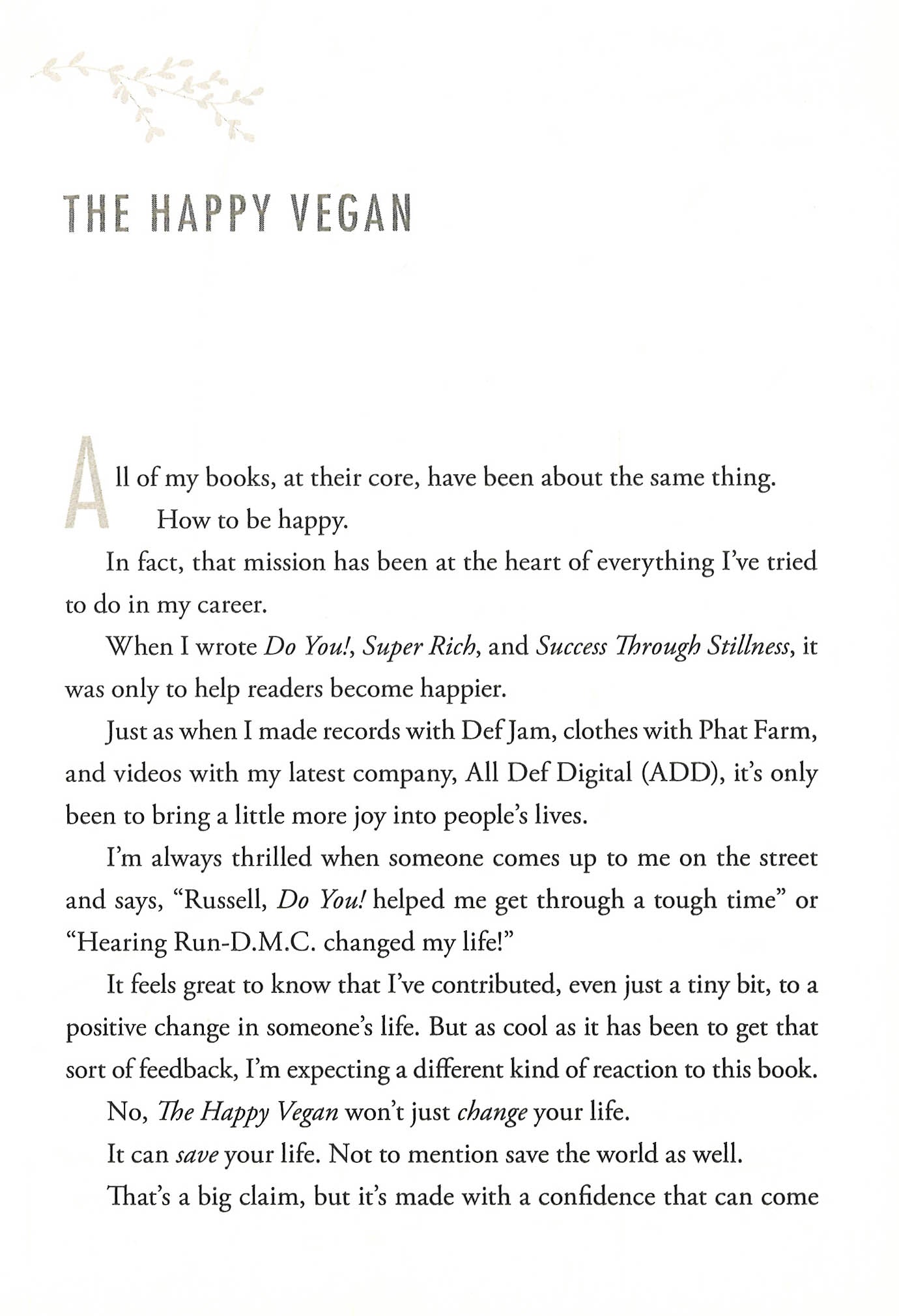 Master entrepreneur, original hip-hop mogul, and three-time New York Times bestselling author Russell Simmons offers an inspiring guide to the benefits of conscious eating and veganism. In the New York Times bestseller Success Through Stillness, Russell Simmons shared how meditation can be used as a powerful tool to access potential in all aspects of life, having seen himself how achieving inner peace led to outward success. In The Happy Vegan, Simmons shares how once he started practicing yoga and meditation, he became more conscious of his choices, particularly the choices he made regarding his diet. Simmons first adopted a vegetarian and then vegan diet, and almost immediately began to experience the physical, mental, and emotional benefits of eating green and clean. He delves into research about mindful eating, the links between stress and poor eating habits, the importance of listening to your body, the well-documented problems associated with eating animal products and processed foods, along with tips on how to transition to a vegan diet. Drawing on his own experience, the experiences of others, and science and research on the health benefits of conscious eating and veganism, The Happy Vegan is an accessible and inspiring guide to help others make the move toward a vegan diet and a more successful, focused, and purposeful life.