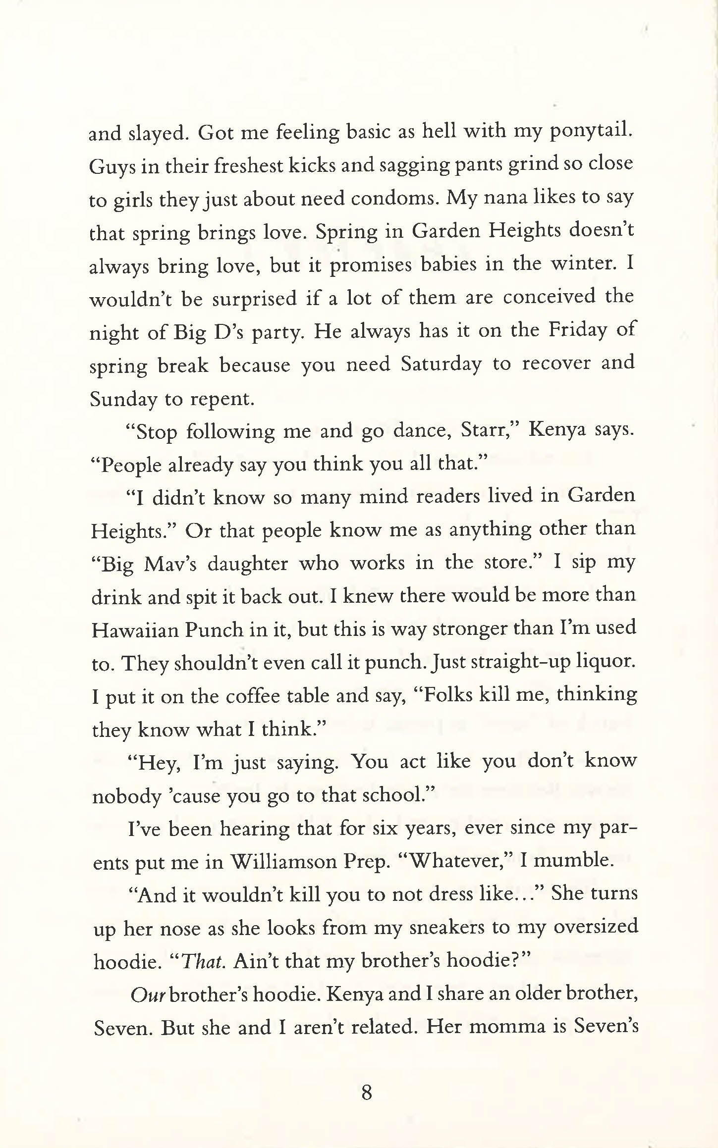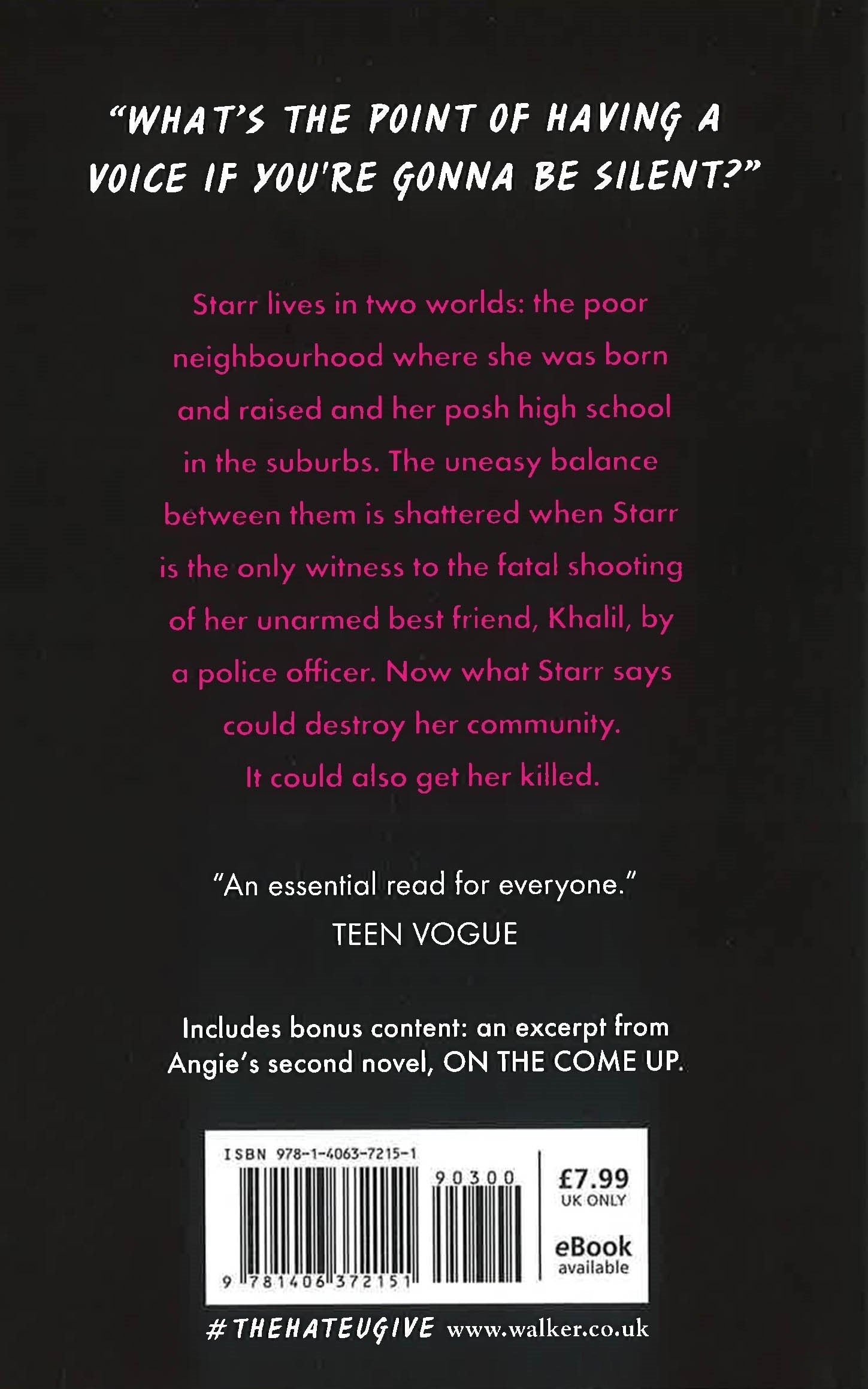 Sixteen-year-old Starr lives in two worlds: the poor neighbourhood where she was born and raised and her posh high school in the suburbs. The uneasy balance between them is shattered when Starr is the only witness to the fatal shooting of her unarmed best friend, Khalil, by a police officer. Now what Starr says could destroy her community. It could also get her killed.