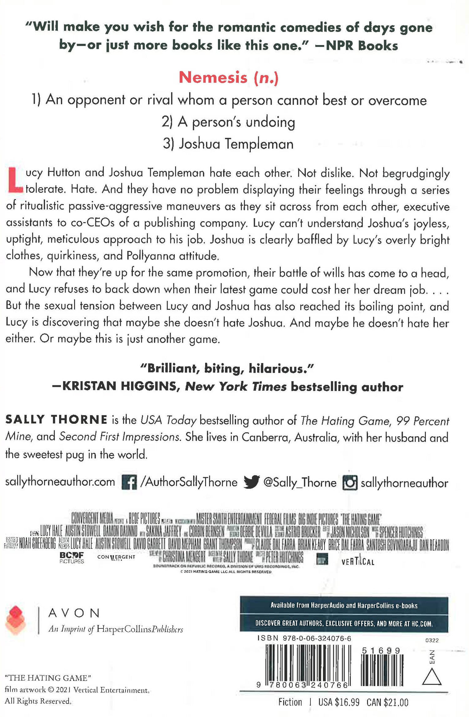 Now a movie starring Lucy Hale and Austin Stowell, USA Today bestselling author Sally Thorne’s hilarious and sexy workplace comedy all about that thin, fine line between hate and love.