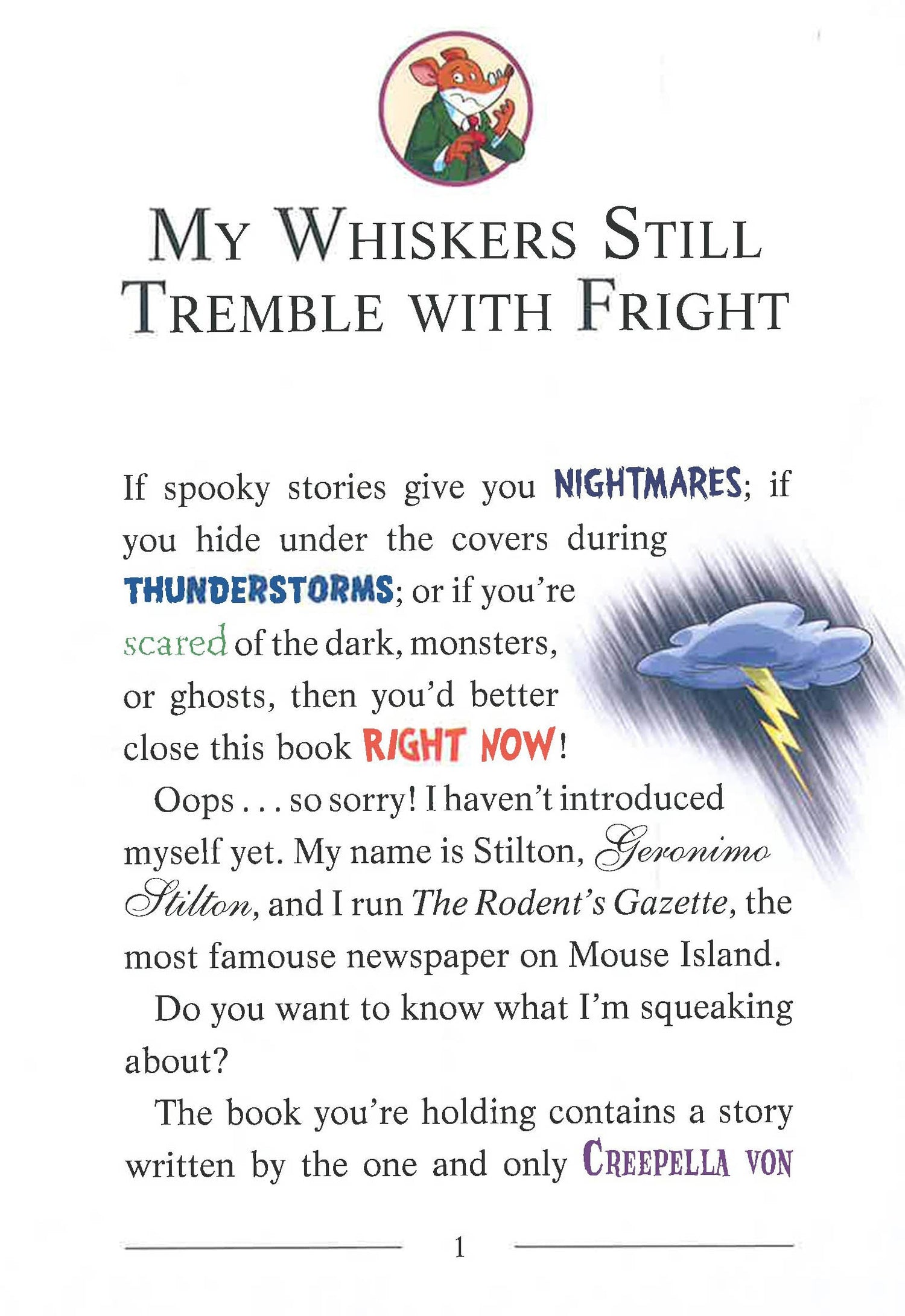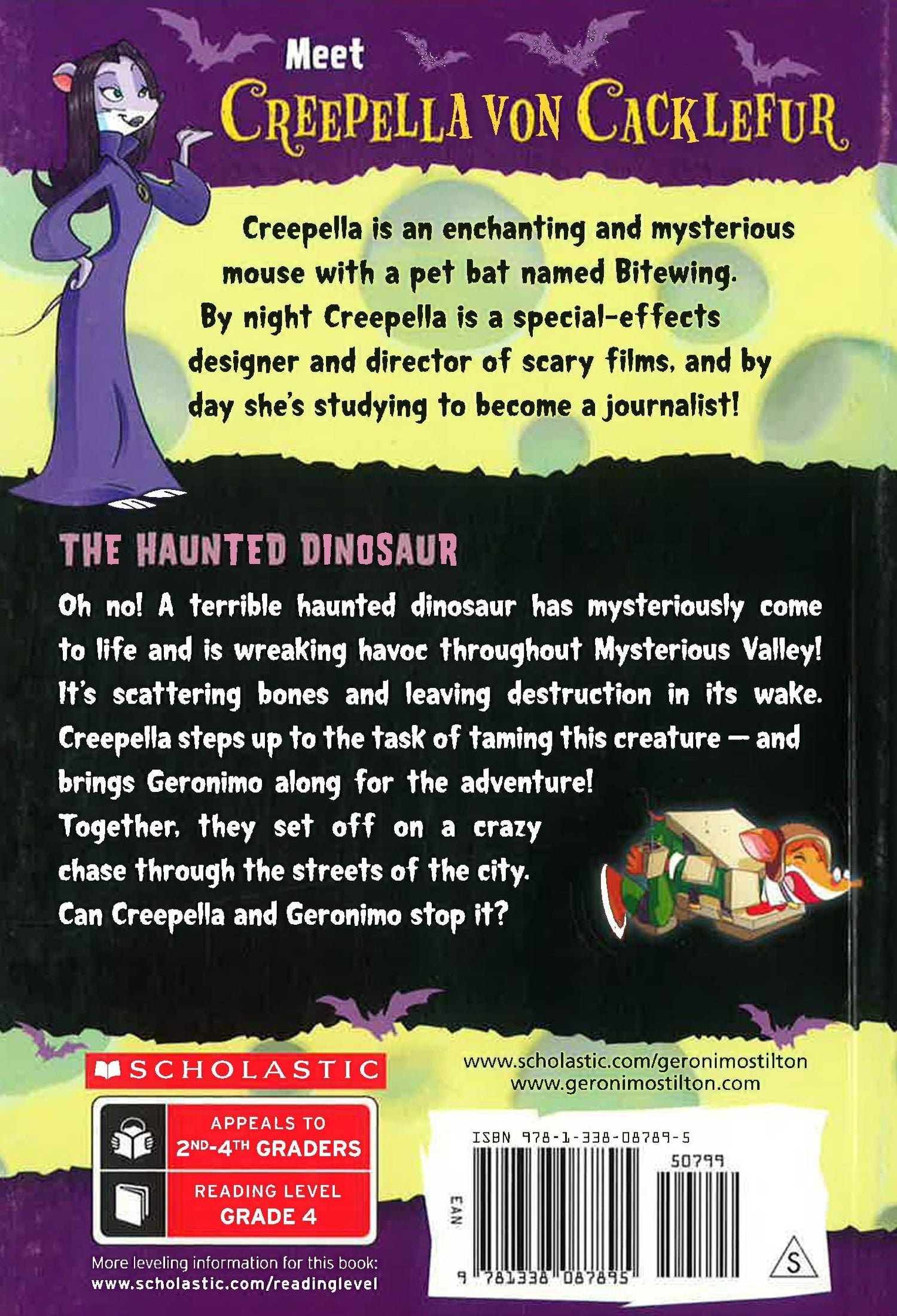 Get ready for a fur-raising adventure with Creepella von Cacklefur! A terrible haunted dinosaur is wreaking havoc throughout Mysterious Valley! He's scattering bones and leaving destruction in his wake. Creepella steps up to the task of taming this creature -- and brings Geronimo along for the adventure!