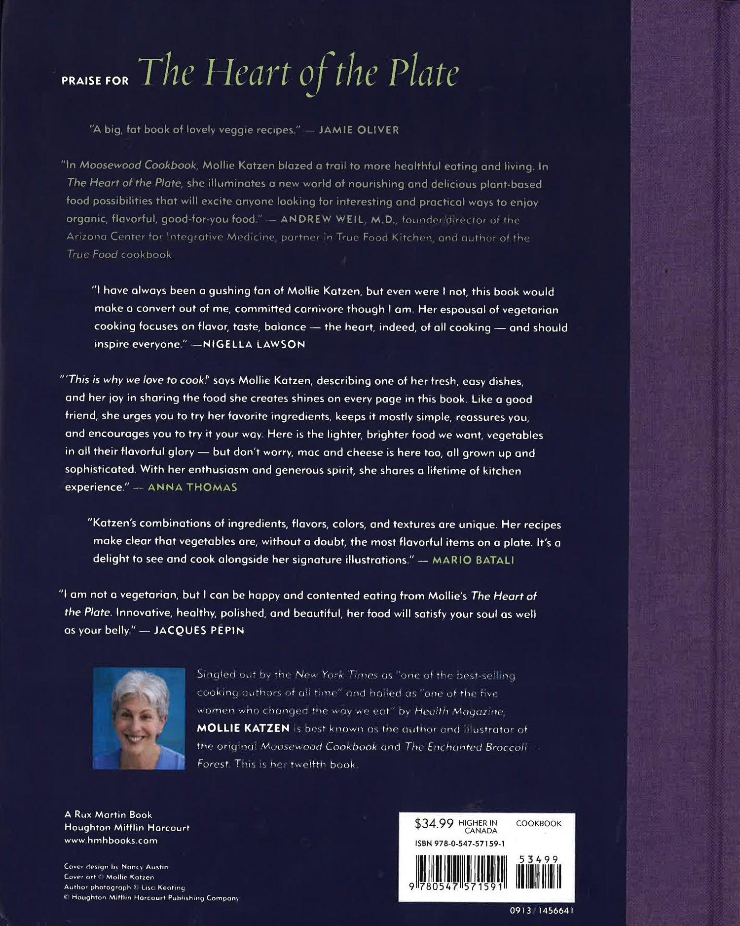 With The Moosewood Cookbook, Mollie Katzen changed the way a generation cooked and brought vegetarian cuisine into the mainstream. In The Heart of the Plate, she completely reinvents the vegetarian repertoire, unveiling a collection of beautiful, healthful, and unfussy dishes -- her "absolutely most loved." Her new cuisine is light, sharp, simple, and modular; her inimitable voice is as personal, helpful, clear, and funny as ever. Whether it's a salad of kale and angel hair pasta with orange chili oil or a seasonal autumn lasagna, these dishes are celebrations of vegetables. They feature layered dishes that juxtapose colors and textures: orange rice with black beans, or tiny buttermilk corn cakes on a Peruvian potato stew. Suppers from the oven, like vegetable pizza and mushroom popover pie, are comforting but never stodgy. Burgers and savory pancakes -- from eggplant Parmesan burgers to zucchini ricotta cloud cakes -- make weeknight dinners fresh and exciting. "Optional Enhancements" allow cooks to customize every recipe. The Heart of the Plate is vibrantly illustrated with photographs and original watercolors by the author herself.