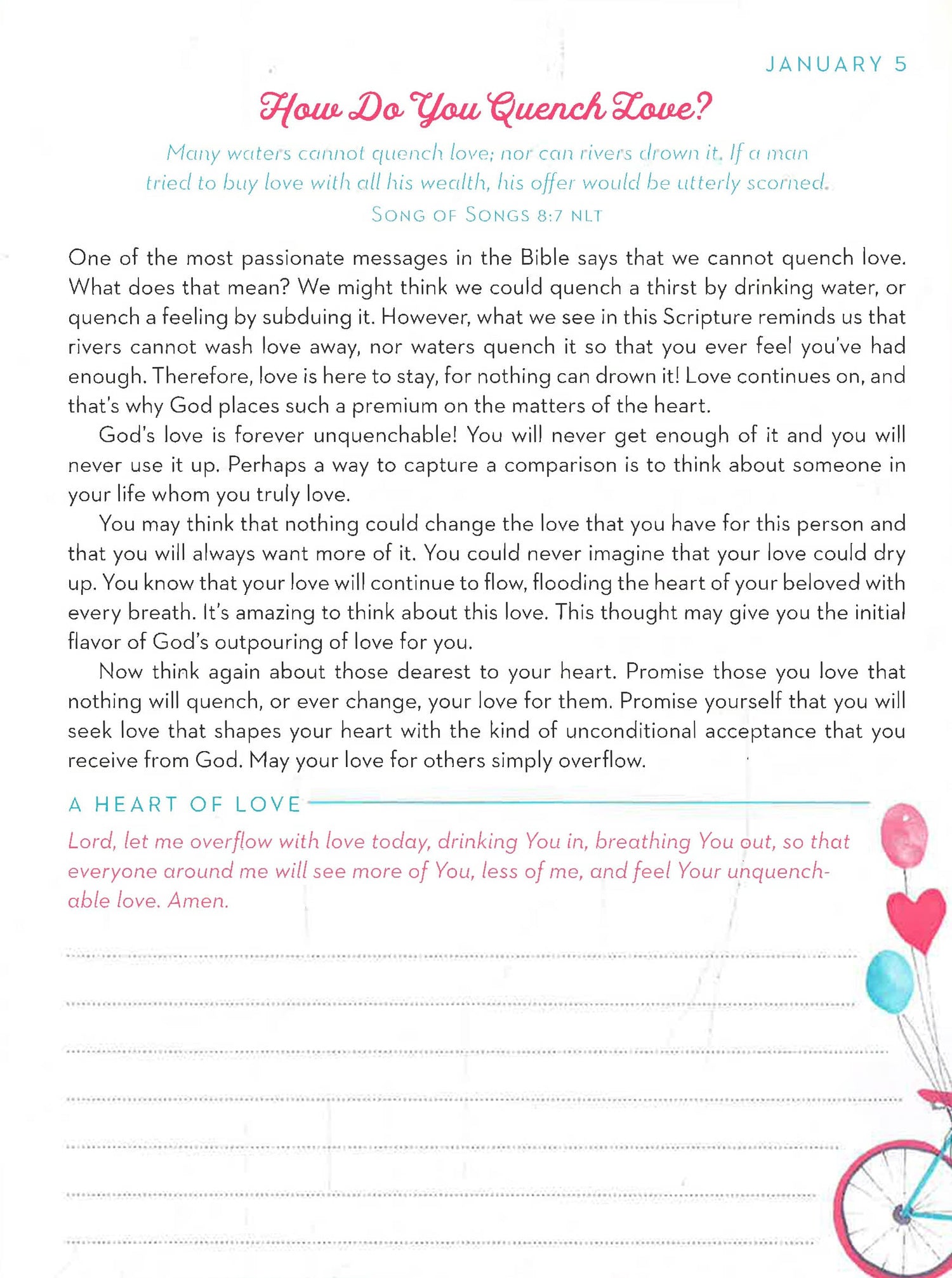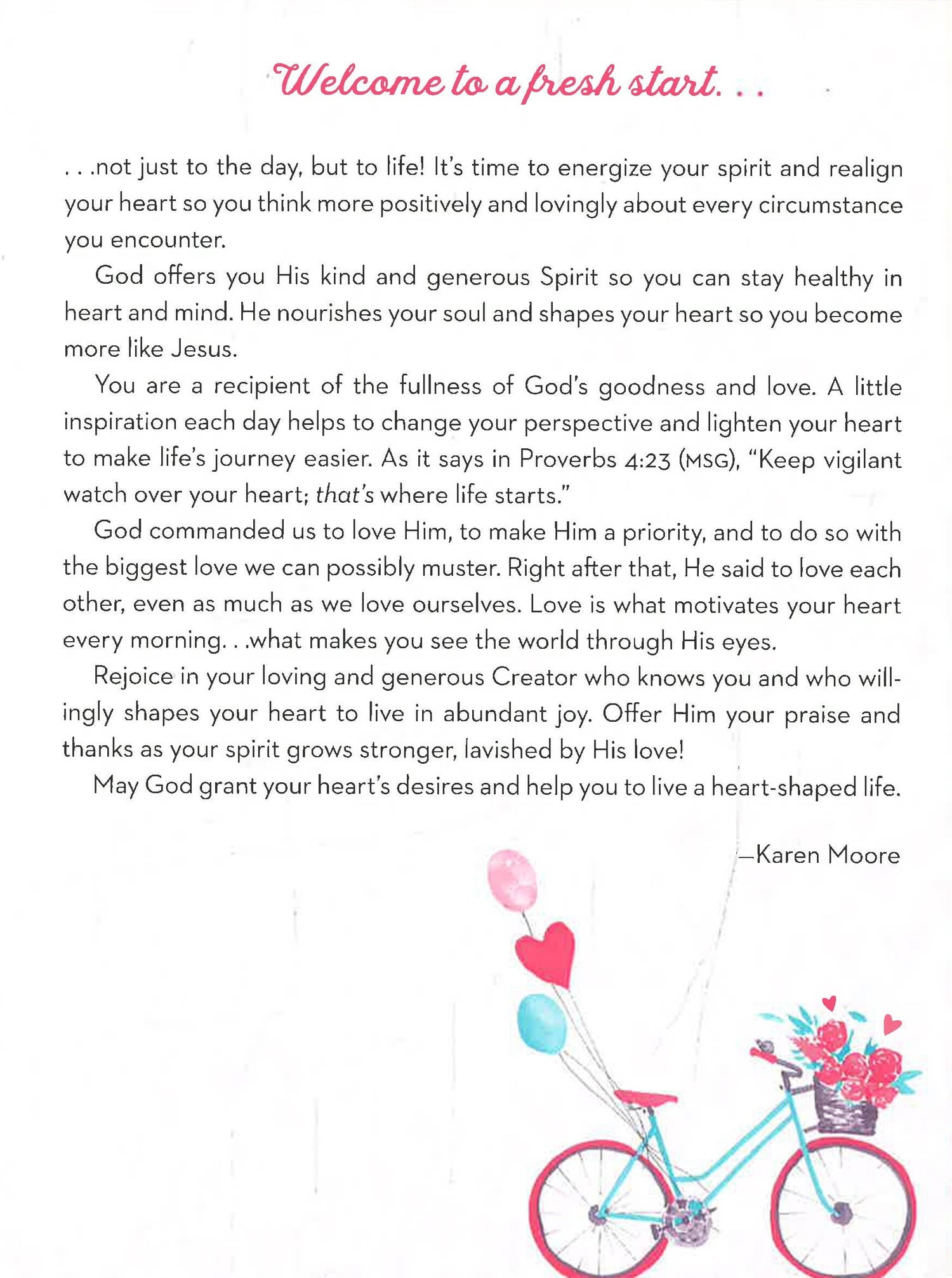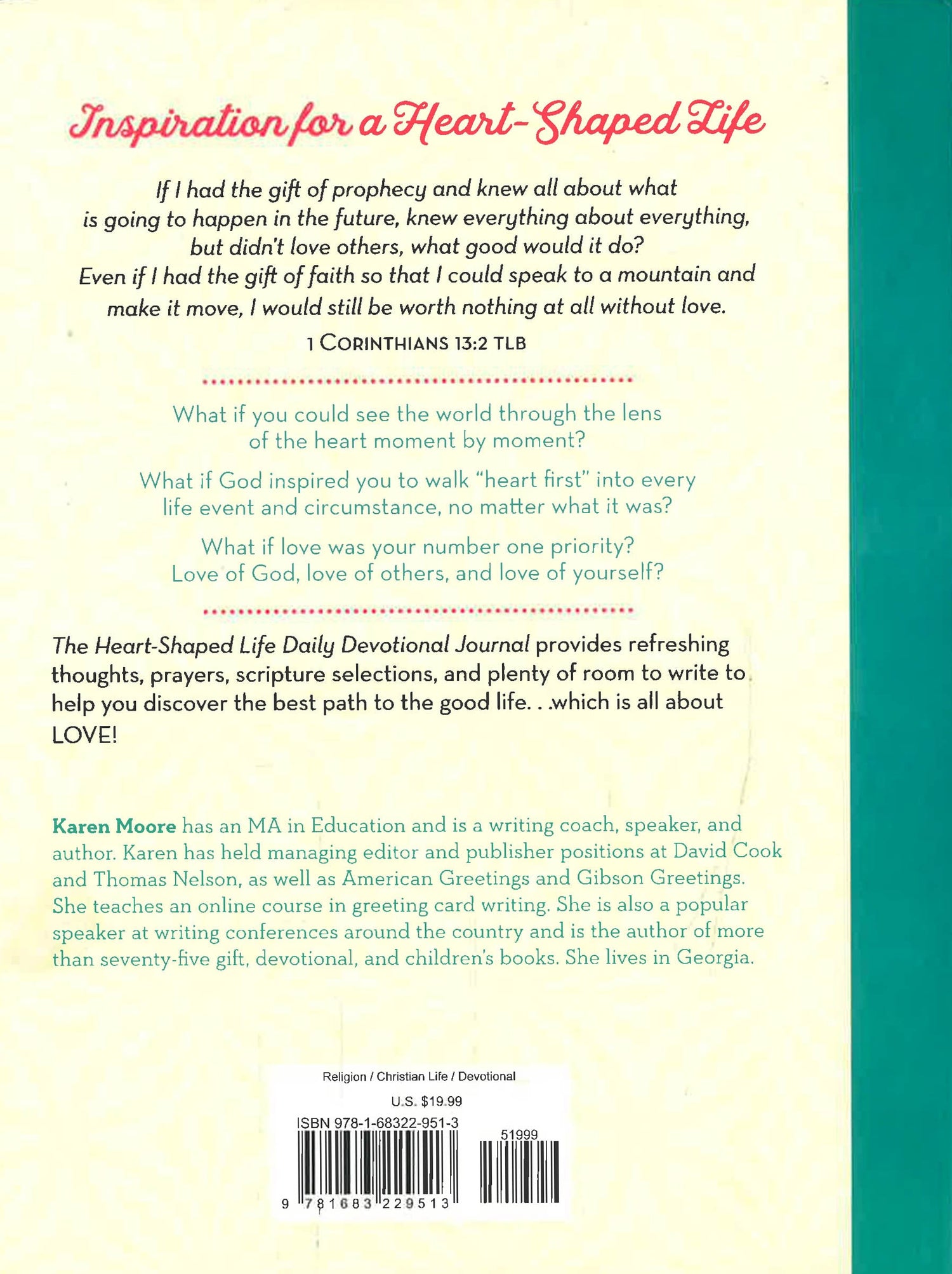 The Heart-Shaped Life Daily Devotional Journal provides refreshing thoughts, prayers, scripture selections, and plenty of room to write to help you discover the best path to the good life. . .which is all about LOVE!