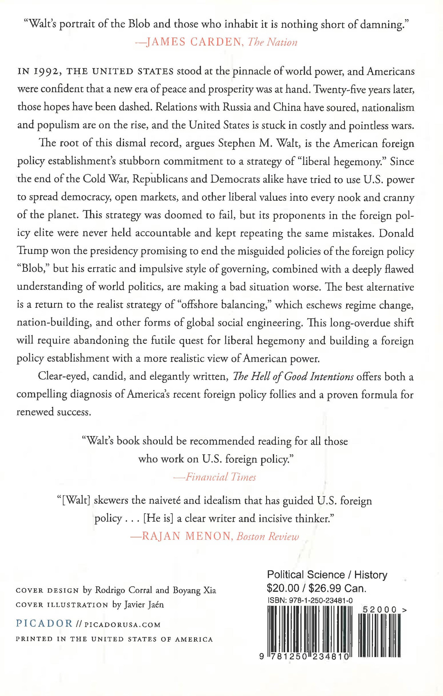 Clear-eyed, candid, and elegantly written, Stephen M. Walt’s The Hell of Good Intentions offers both a compelling diagnosis of America’s recent foreign policy follies and a proven formula for renewed success.