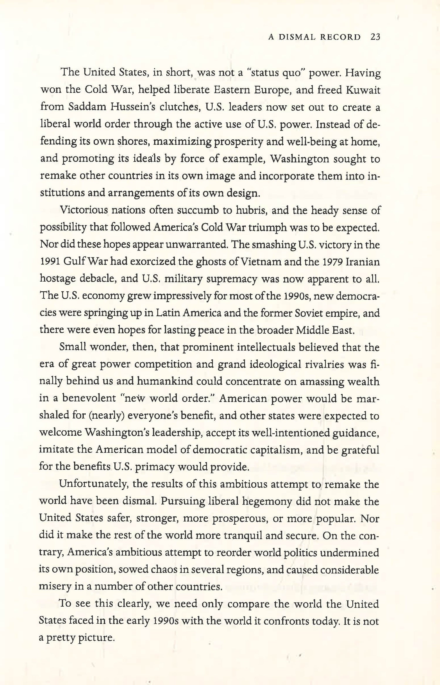 The root of this dismal record, Walt argues, is the American foreign policy establishment’s stubborn commitment to a strategy of “liberal hegemony.” Since the end of the Cold War, Republicans and Democrats alike have tried to use U.S. power to spread democracy, open markets, and other liberal values into every nook and cranny of the planet. This strategy was doomed to fail, but its proponents in the foreign policy elite were never held accountable and kept repeating the same mistakes.