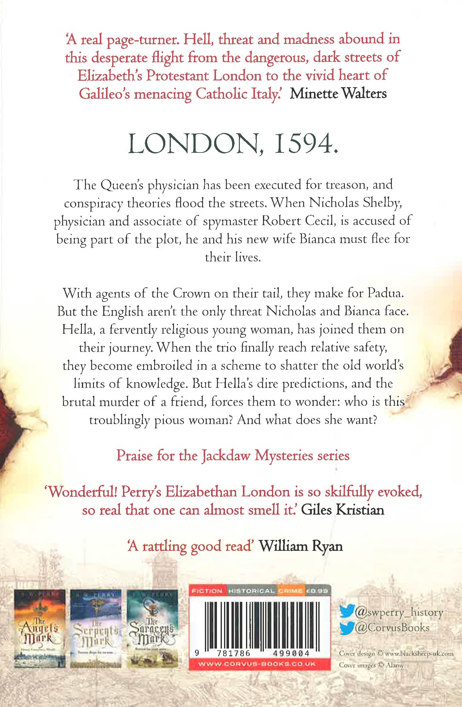 With agents of the Crown on their tail, they make for Padua, following the ancient pilgrimage route, the Via Francigena. But the pursuing English aren't the only threat Nicholas and Bianca face. Hella, a strange and fervently religious young woman, has joined them on their journey. When the trio finally reach relative safety, they become embroiled in a radical and dangerous scheme to shatter the old world's limits of knowledge. But Hella's dire predictions of an impending apocalypse, and the brutal murder of a friend of Bianca's forces them to wonder: who is this troublingly pious woman? And what does she want?