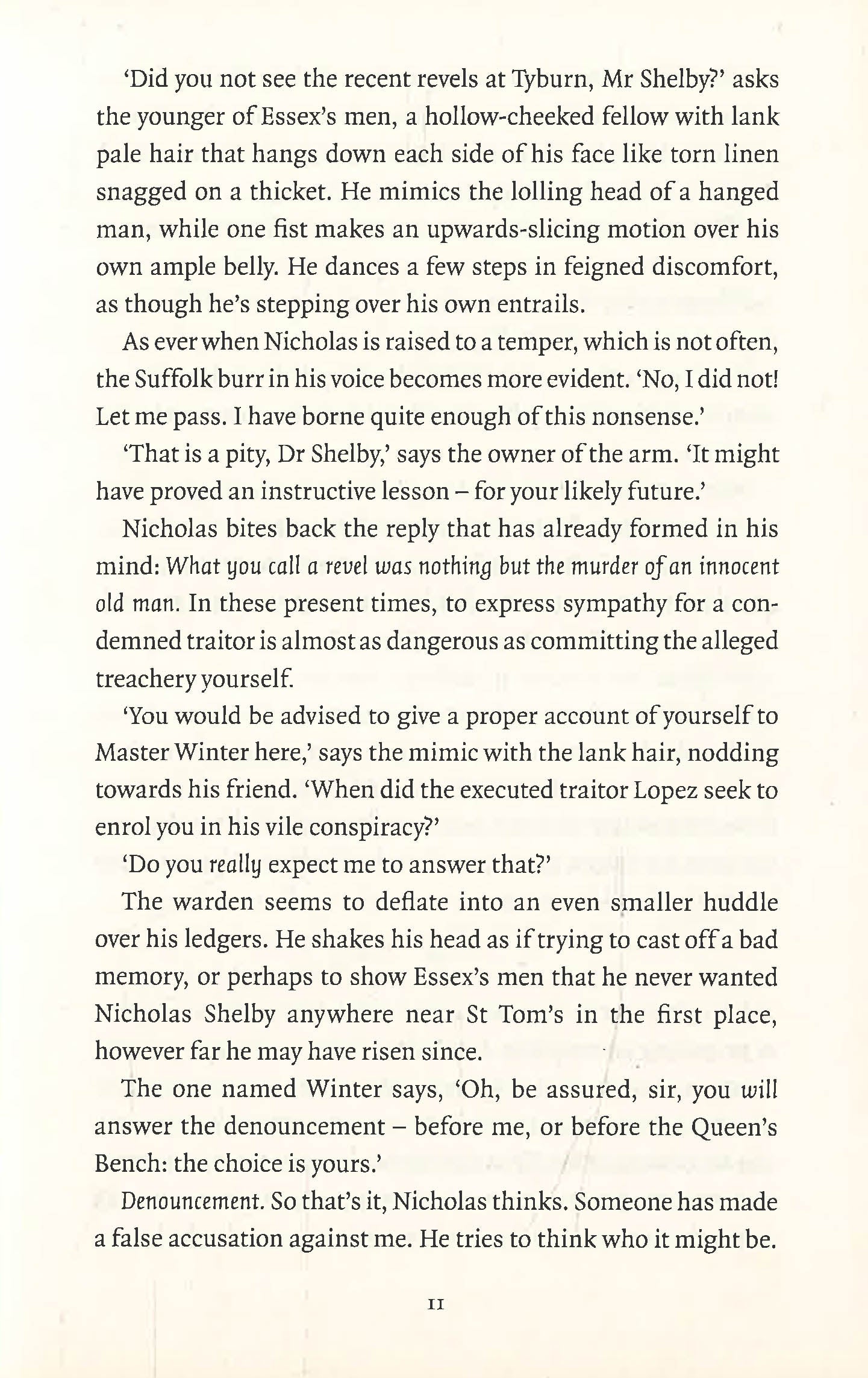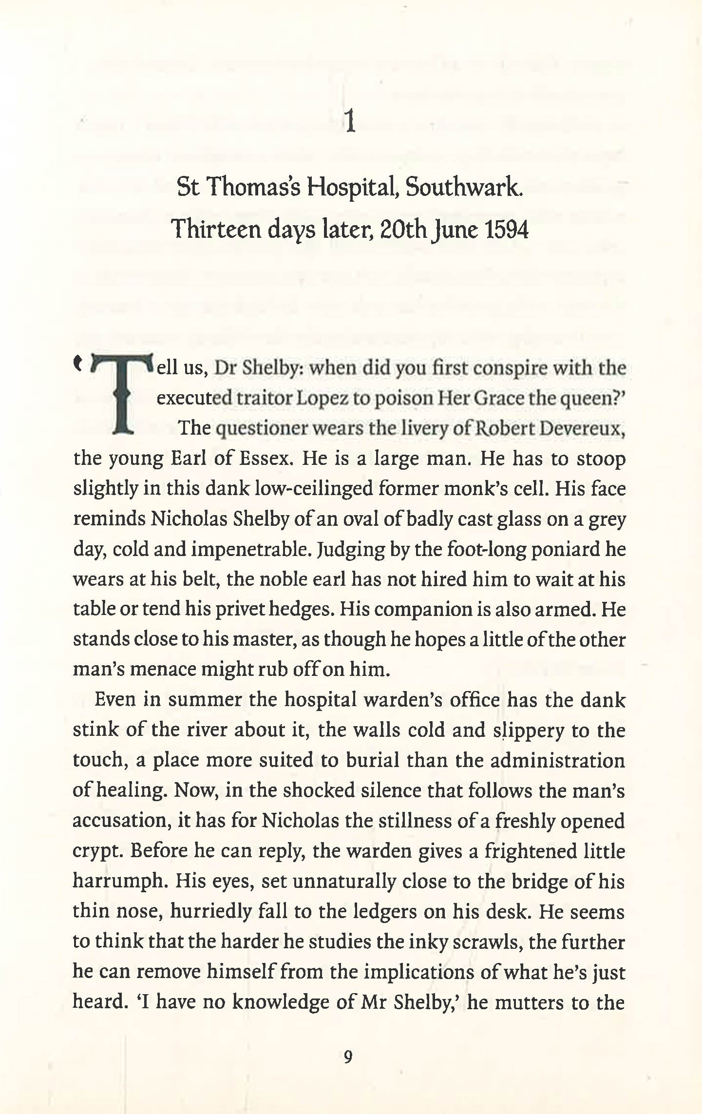 London, 1594. The Queen's physician has been executed for treason, and conspiracy theories flood the streets. When Nicholas Shelby, unorthodox physician and unwilling associate of spymaster Robert Cecil, is accused of being part of the plot, he and his new wife Bianca must flee for their lives.