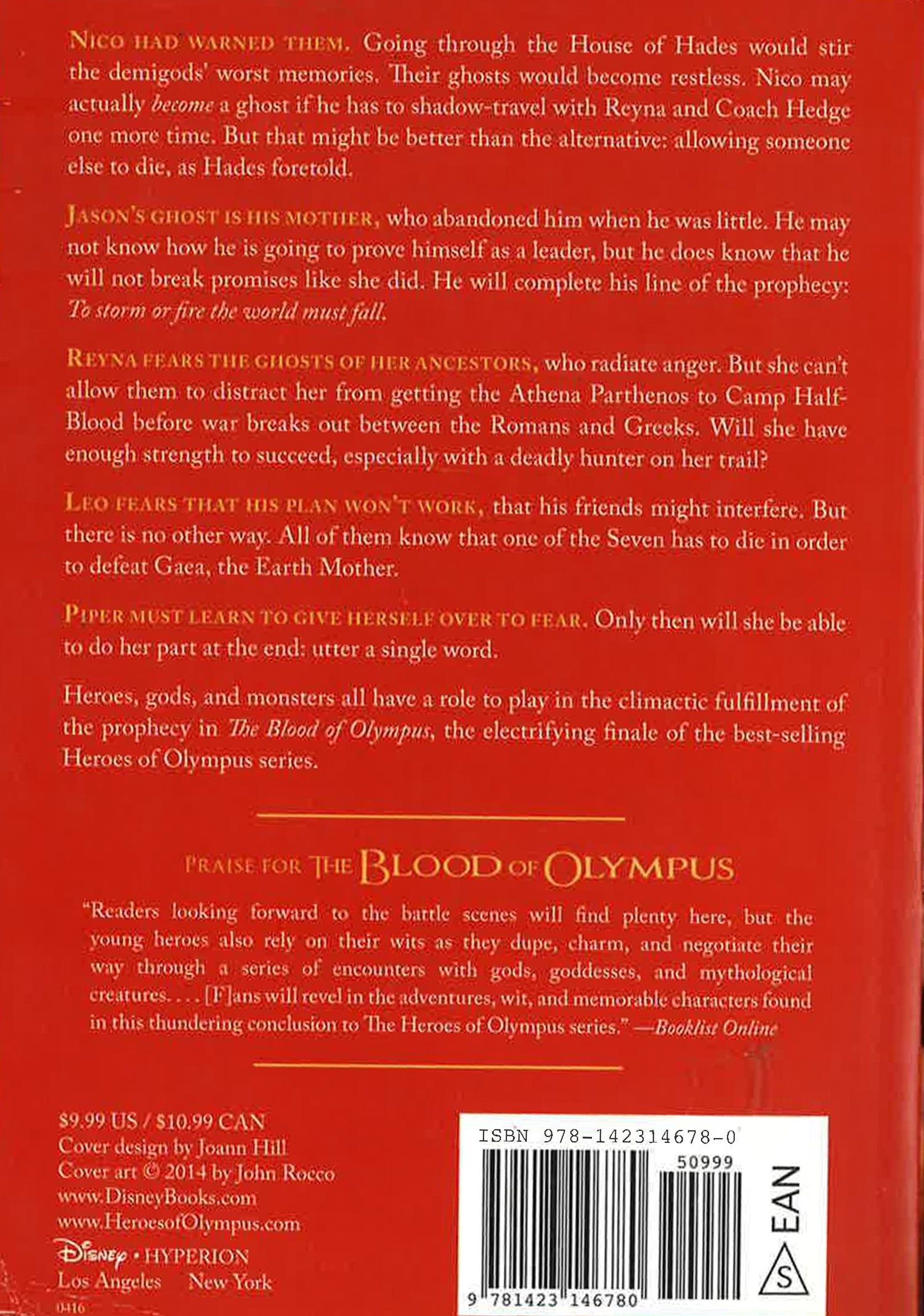 Though the Greek and Roman crewmembers of the Argo II have made progress in their many quests, they still seem no closer to defeating the earth mother, Gaea. Her giants have risen-all of them-and they're stronger than ever. They must be stopped before the Feast of Spes, when Gaea plans to have two demigods sacrificed in Athens. She needs their blood-the blood of Olympus-in order to wake. The demigods are having more frequent visions of a terrible battle at Camp Half-Blood. The Roman legion from Camp Jupiter, led by Octavian, is almost within striking distance. Though it is tempting to take the Athena Parthenos to Athens to use as a secret weapon, the friends know that the huge statue belongs back on Long Island, where it might be able to stop a war between the two camps. The Athena Parthenos will go west; the Argo II will go east. The gods, still suffering from multiple personality disorder, are useless. How can a handful of young demigods hope to persevere against Gaea's army of powerful giants? As dangerous as it is to head to Athens, they have no other option. They have sacrificed too much already. And if Gaea wakes, it is game over.