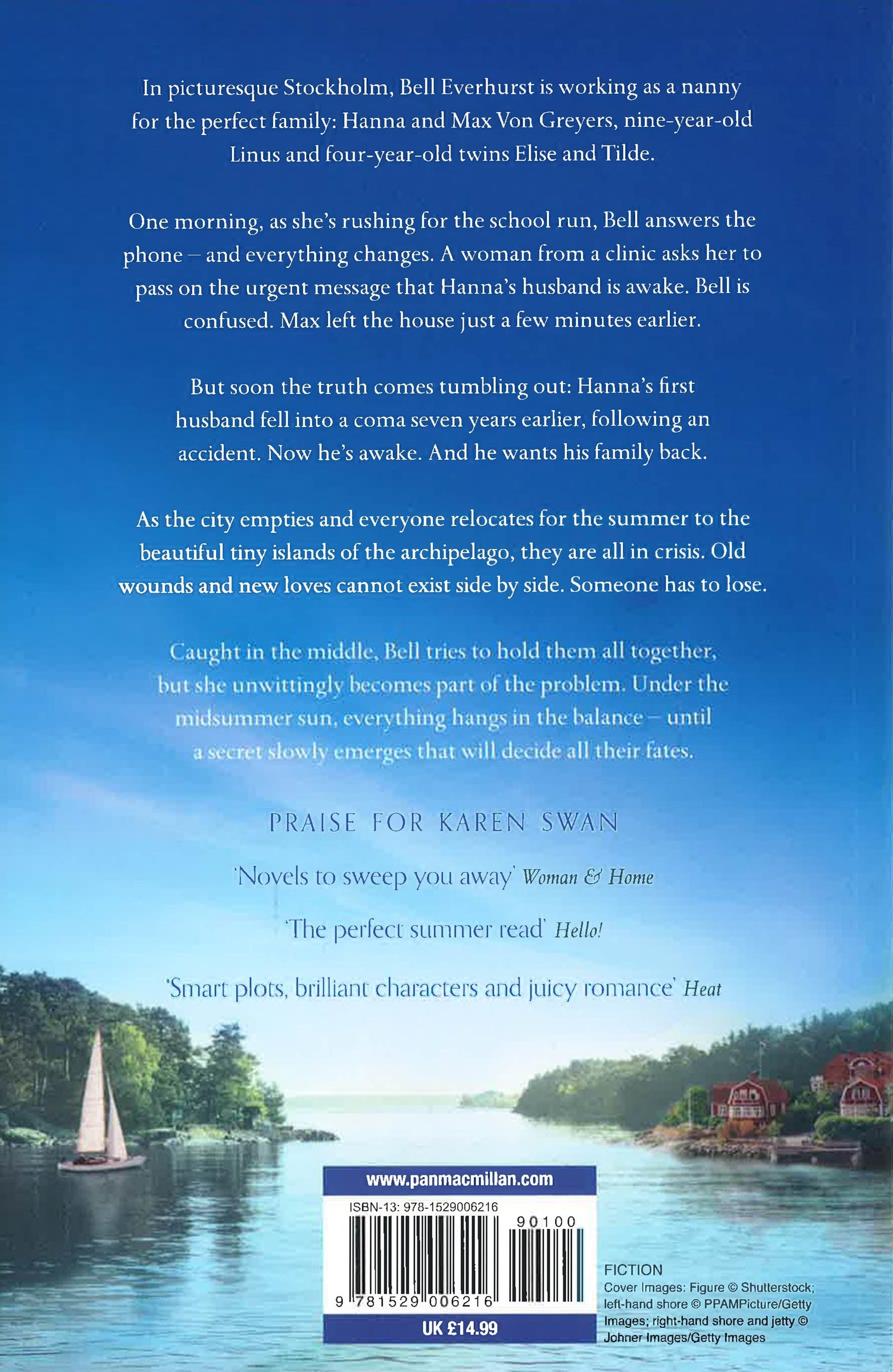 From internationally bestselling author Karen Swan comes The Hidden Beach, an addictive story of heartbreak, loyalty and hope, set in the historic city of Stockholm and along the beautiful archipelagos of the Swedish coast. In the oldest part of Stockholm, Bell Everhurst is working as a nanny for an affluent family. Hanna and Max Mogert are parents to 7 year-old Linus, and 5-year old twins Ellinor and Tilde, and Bell has been with the family for over two years.One early Spring morning, as she's rushing out to take the children to school, she answers the phone - and everything changes. A woman from a clinic she's never heard of asks her to pass on the message that Hanna's husband is awake.Bell is confused. She clearly just saw Max walking out of the house a few minutes earlier, but the woman mentioned Hanna by name...When she gets hold of her employer, the truth is revealed: Hanna's first husband fell into a coma seven years earlier, following a terrible accident. He has been in a Persistent Minimally Conscious State since and there was very little hope of further improvement. But now he's awake. And life is going to change for them all.