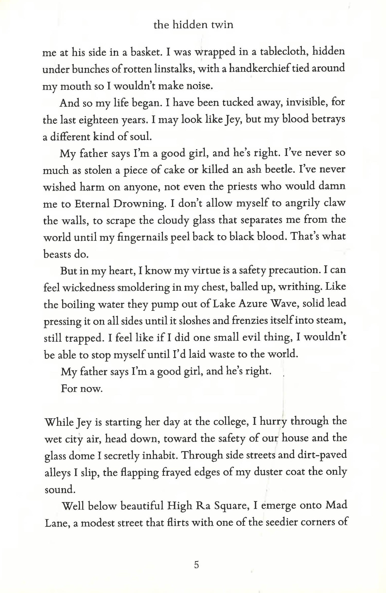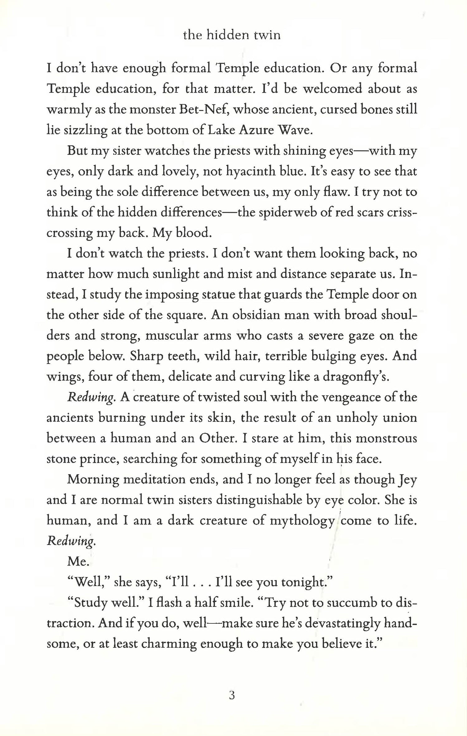 For eighteen years a girl with no name, a Redwing, has been hidden away in a small attic room within a city of hissing pipes and curving temples perched on the side of the great volcano, Mol, while her sister, Jey - identical except for her eyes - has lived her life in public as an only child. Their father had hoped the hidden girl would one day grow up to be a normal human girl and not the wicked creature mythology has promised, so he secretly spared her life as an infant. But when she switches places with her sister, striking up a flirtation with the son of the Empress while working in the royal gardens and gets attacks by two suspicious priests on her journey home, she is forced to call forth fire to protect herself, unleashing her previously dormant powers and letting her secret out. She soon catches the attention of a cult with a thousand year old grudge as well as a group of underground rebels, both seeking her for their own gain. But when her sister goes missing and the Redwing uncovers a great plot to awaken Mol and bring fiery destruction upon them all, she is forced to embrace her powers. In Adi Rule's stunning new novel, The Hidden Twin, the girl with no name, must finally choose a name and a path for herself, drawing a line between myth and history to prove herself more than a monster if she is to save both her sister and her home.