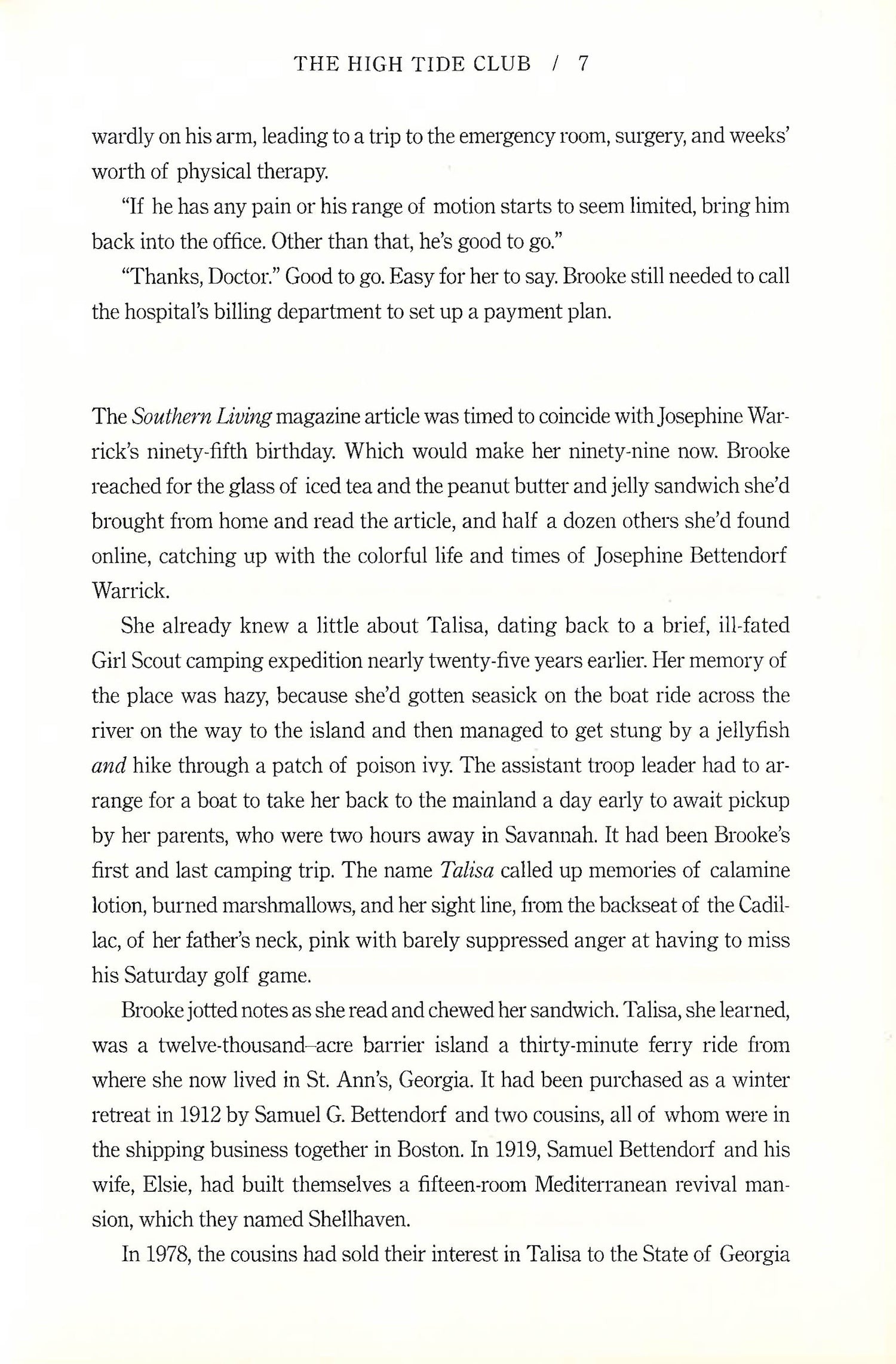 Eccentric heiress Josephine Warrick is a notorious recluse - reigning over a crumbling pink mansion on a private island, she is rarely seen but often whispered about. So when Brooke Trappnell, a struggling young lawyer, is summoned to the island, she has no idea what's in store. As she listens to Josephine recount a story of old friendship, dark secrets, and a mysterious murder, it becomes clear that Brooke is there for two reasons: to help protect Josephine's beloved island, and to make amends with her old friends, the skinny-dipping, secret-keeping girls of the The High Tide Club.