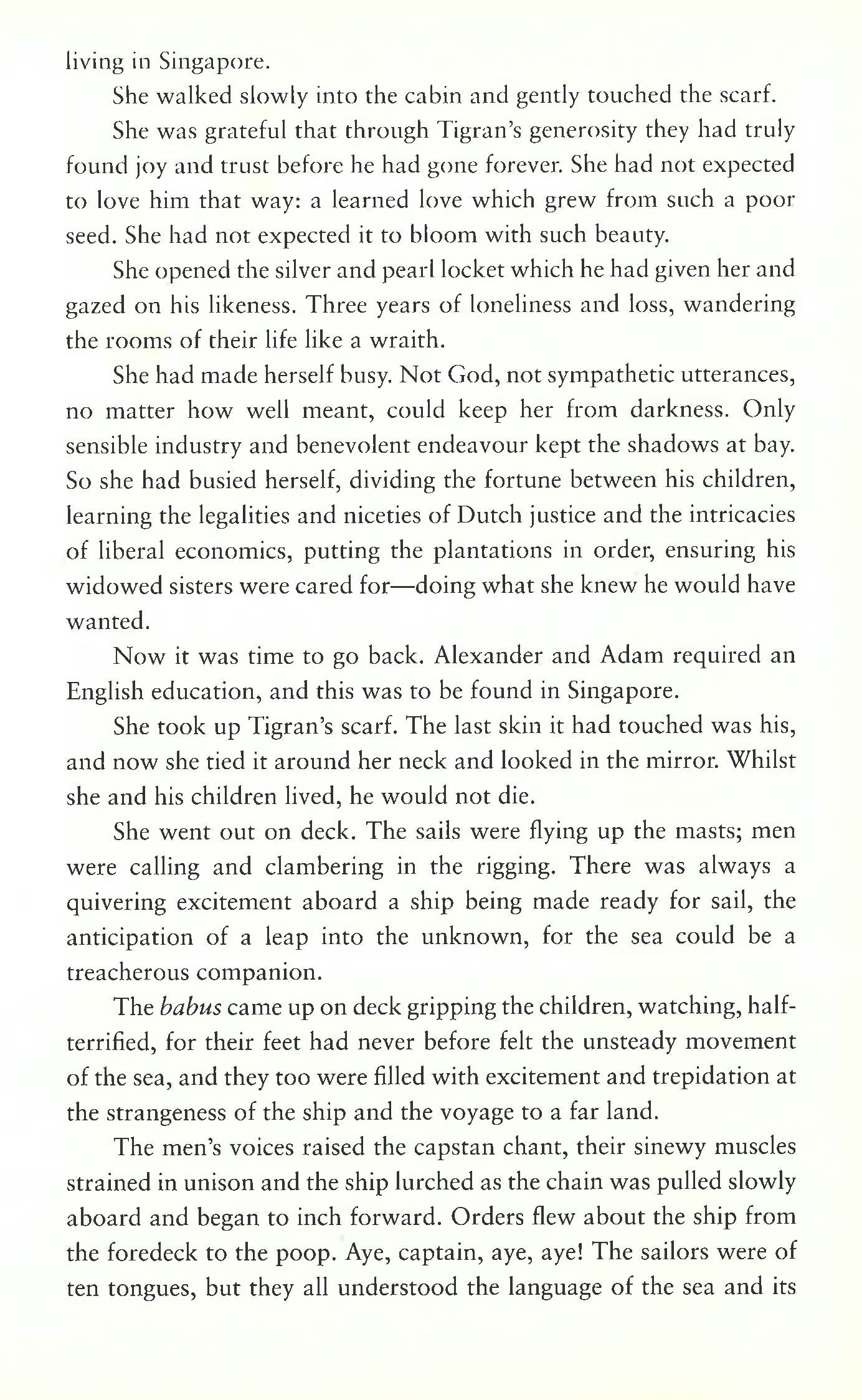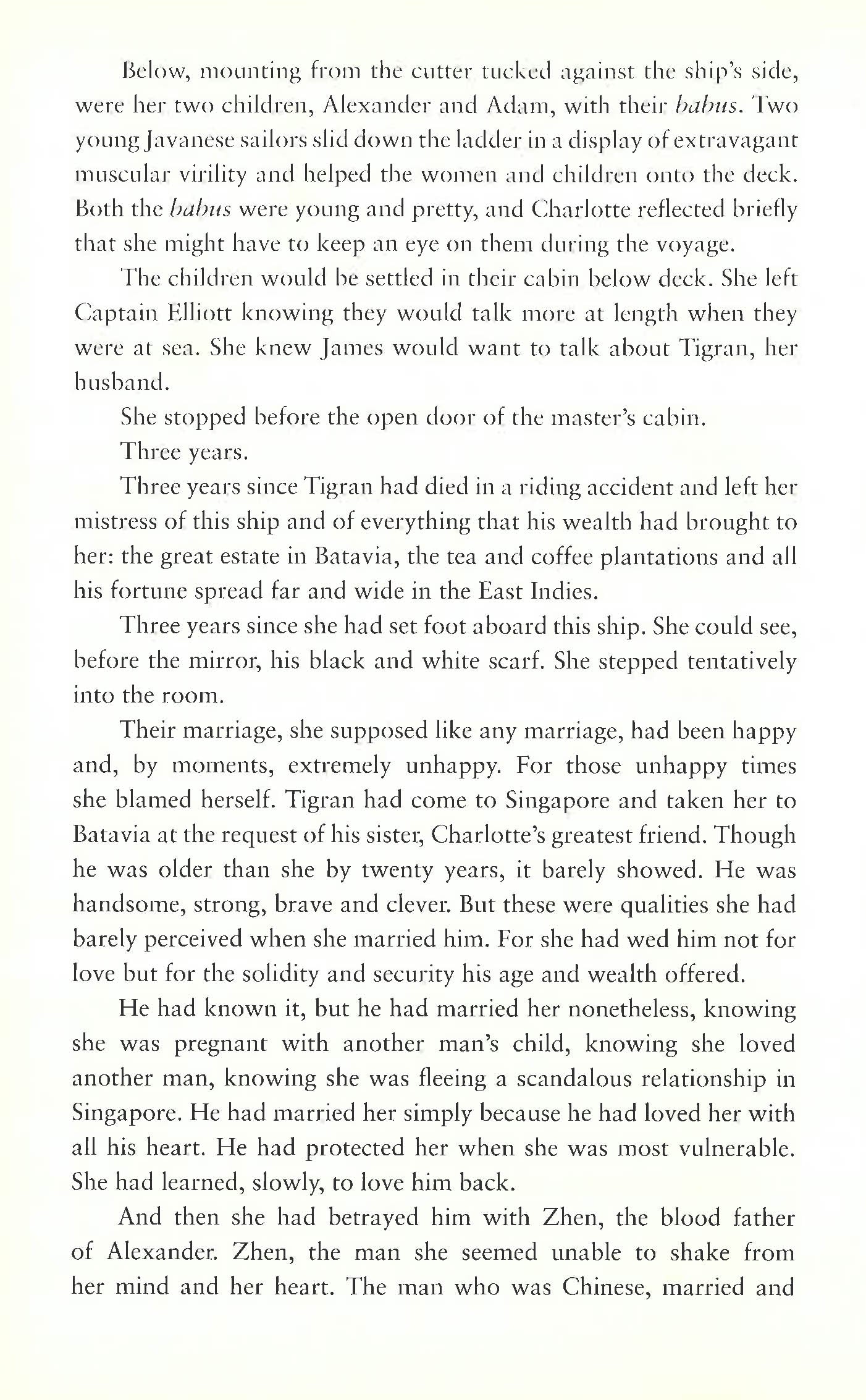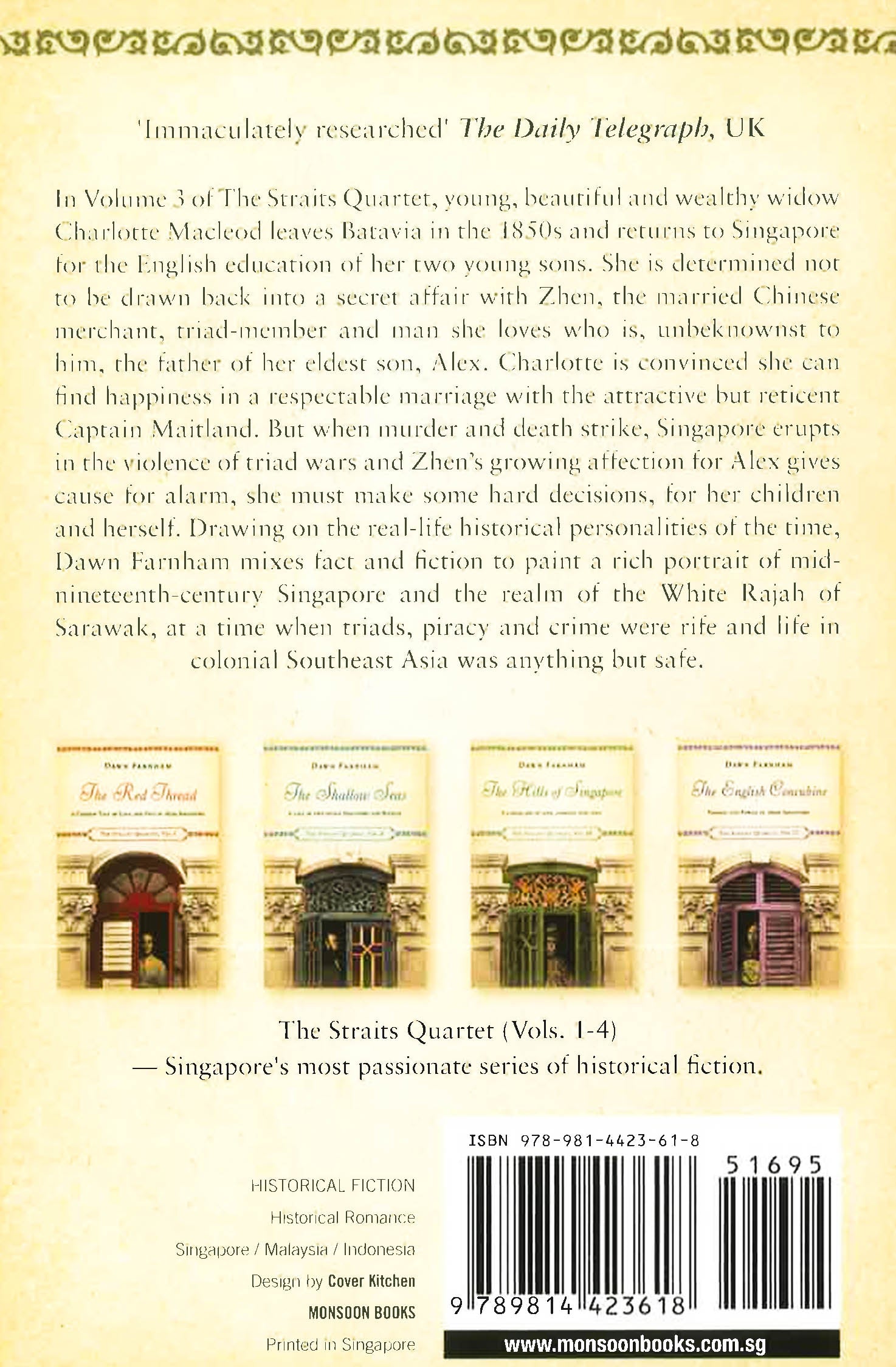 In Volume 3 of The Straits Quartet, young, beautiful and wealthy widow Charlotte Macleod leaves Batavia in the 1850s and returns to Singapore for the English education of her two young sons. She is determined not to be drawn back into a secret affair with Zhen, the married Chinese merchant, triadmember and man she loves.