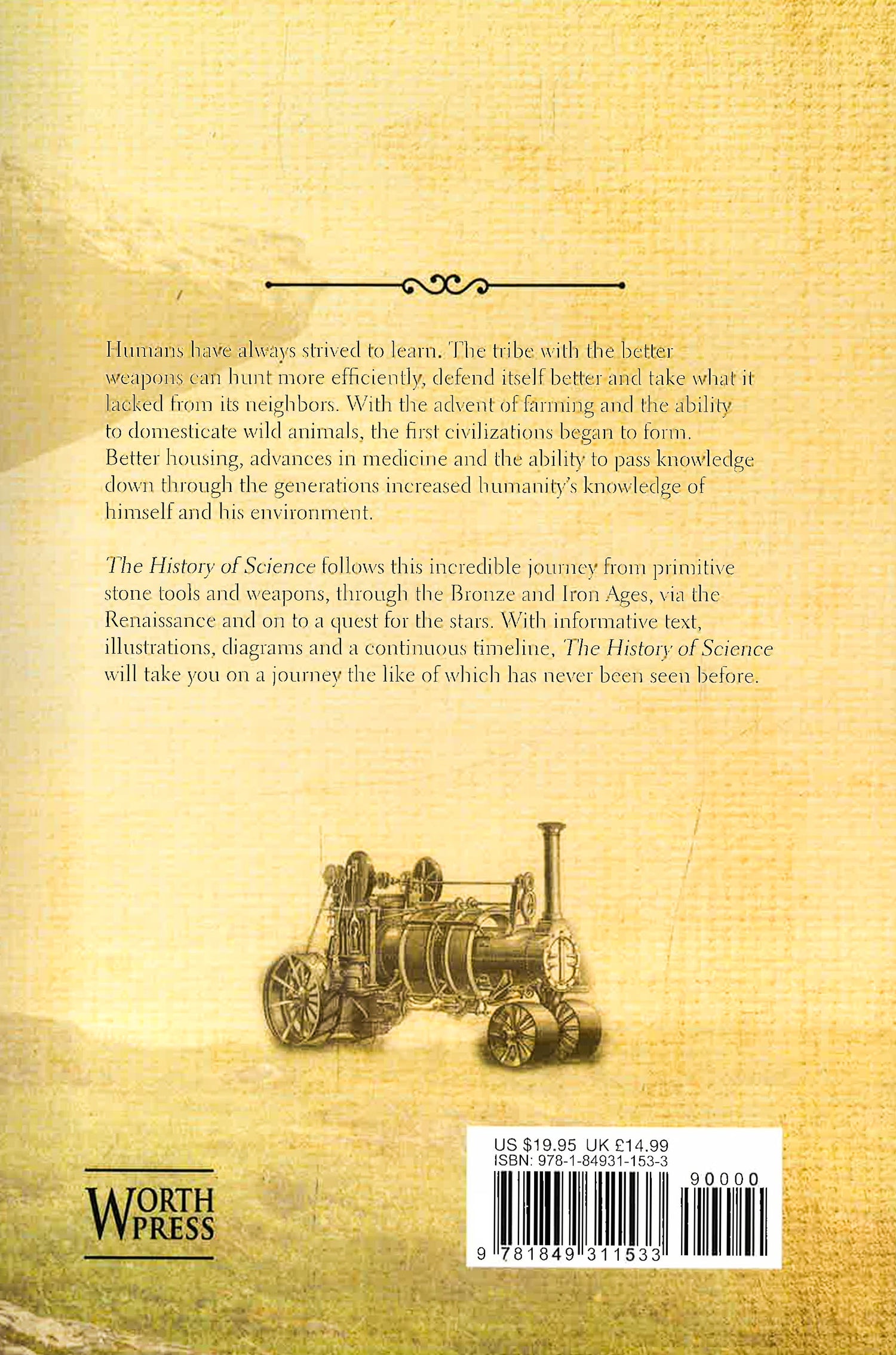 Mankind has forever strived to learn. The tribe with the better weapons can hunt more efficiently, defend itself better and take what it lacked from their neighbours. With the advent of farming and the ability to domesticate wild animals, the first civilisations began to form. Better housing, advances in medicine and the ability to pass knowledge down through the generations increased mankind s knowledge of himself and his environment. The History of Science follows mankind s journey from primitive stone tools and weapons, through the bronze and iron ages, through the Renaissance and on to a quest for the stars. With informative text, illustrations, diagrams and maps and a continuous timeline The History of Science will take you on a journey the like of which has never been seen before. Contents: Stone Age Technology The Bronze Age The Iron Age Science in the Classical World Age of Alchemy Golden Ages Copernicus Moves the Earth Galileo s New View Baconian Revolutions Newton s Laws Using Engine Power Collecting electricity Classifying life Pneumatic chemists Electric currents Atoms and elements Studying light Electromagnetism The Age of Earth Discovering Energy Cell theory and Darwinism James Clerk Maxwell The Periodic Table Standard Time Radioactivity and radiation An Expanding Universe Classifying stars Relativity Quantum Physics An Expanding Universe Antibiotics Electronics Echoes of the Big Bang The Standard Model Superconductors Genetic modification Dark Energy From the Higgs Boson to Gravity waves The Future