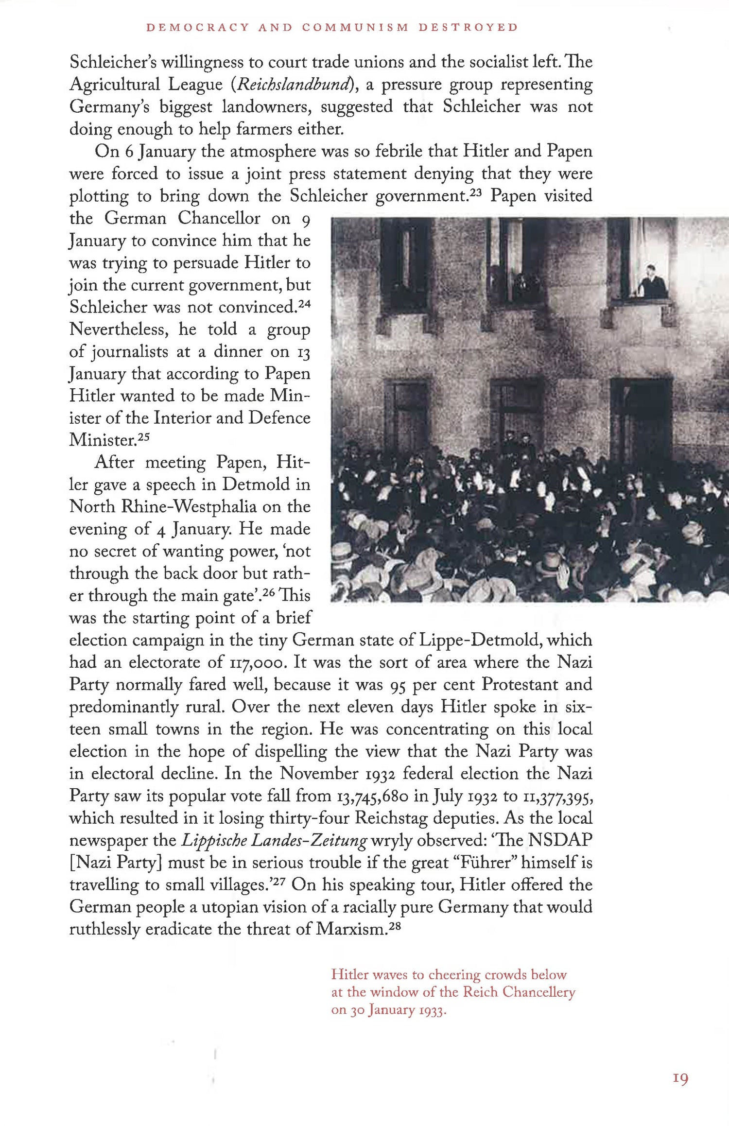 On January 30th, 1933, Adolf Hitler was appointed the German Chancellor of a coalition government by President Hindenburg. Within a few months he had installed a dictatorship, jailing and killing his leftwing opponents, terrorizing the rest of the population and driving Jews out of public life. He embarked on a crash program of militaristic Keynesianism, reviving the economy and achieving full employment through massive public works, vast armaments spending and the cancellations of foreign debts. After the grim years of the Great Depression, Germany seemed to have been reborn as a brutal and determined European power.