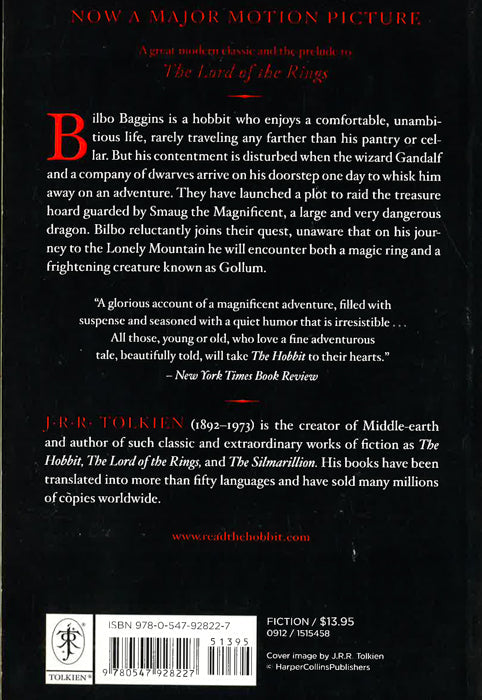 A great modern classic and the prelude to The Lord of the Rings. Bilbo Baggins is a hobbit who enjoys a comfortable, unambitious life, rarely traveling any farther than his pantry or cellar. But his contentment is disturbed when the wizard Gandalf and a company of dwarves arrive on his doorstep one day to whisk him away on an adventure. They have launched a plot to raid the treasure hoard guarded by Smaug the Magnificent, a large and very dangerous dragon. Bilbo reluctantly joins their quest, unaware that on his journey to the Lonely Mountain he will encounter both a magic ring and a frightening creature known as Gollum. "A glorious account of a magnificent adventure, filled with suspense and seasoned with a quiet humor that is irresistible . . . All those, young or old, who love a fine adventurous tale, beautifully told, will take The Hobbit to their hearts." - New York Times Book Review