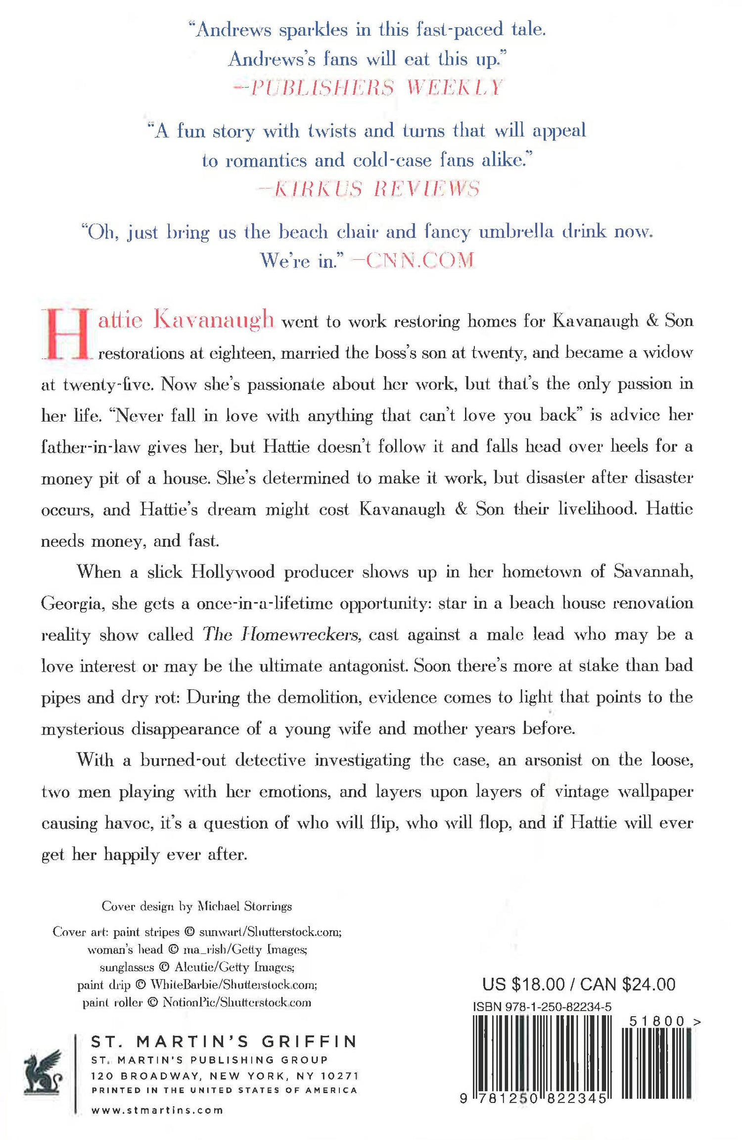 Hattie Kavanaugh went to work restoring homes for Kavanaugh & Son Restorations at eighteen, married the boss’s son at twenty, and became a widow at twenty-five. Now, she’s passionate about her work, but that’s the only passion in her life. “Never love something that can’t love you back,” is advice her father-in-law gives her, but Hattie doesn’t follow it and falls head-over-heels for a money pit of a house. She’s determined to make it work, but disaster after disaster occurs, and Hattie’s dream might cost Kavanaugh & Son their livelihood. Hattie needs money, and fast. When a slick Hollywood producer shows up in her hometown of Savannah, Georgia, she gets a once-in-a-lifetime opportunity: star in a beach house renovation reality show called The Homewreckers, cast against a male lead who may be a love interest, or may be the ultimate antagonist. Soon, there’s more at stake than bad pipes and dry rot: during the demolition, evidence comes to light that points to the mysterious disappearance of a young wife and mother years before. With a burned out detective investigating the case, an arsonist on the loose, two men playing with her emotions, and layers upon layers of vintage wallpaper causing havoc, it's a question of who will flip, who will flop, and if Hattie will ever get her happily-ever-after.