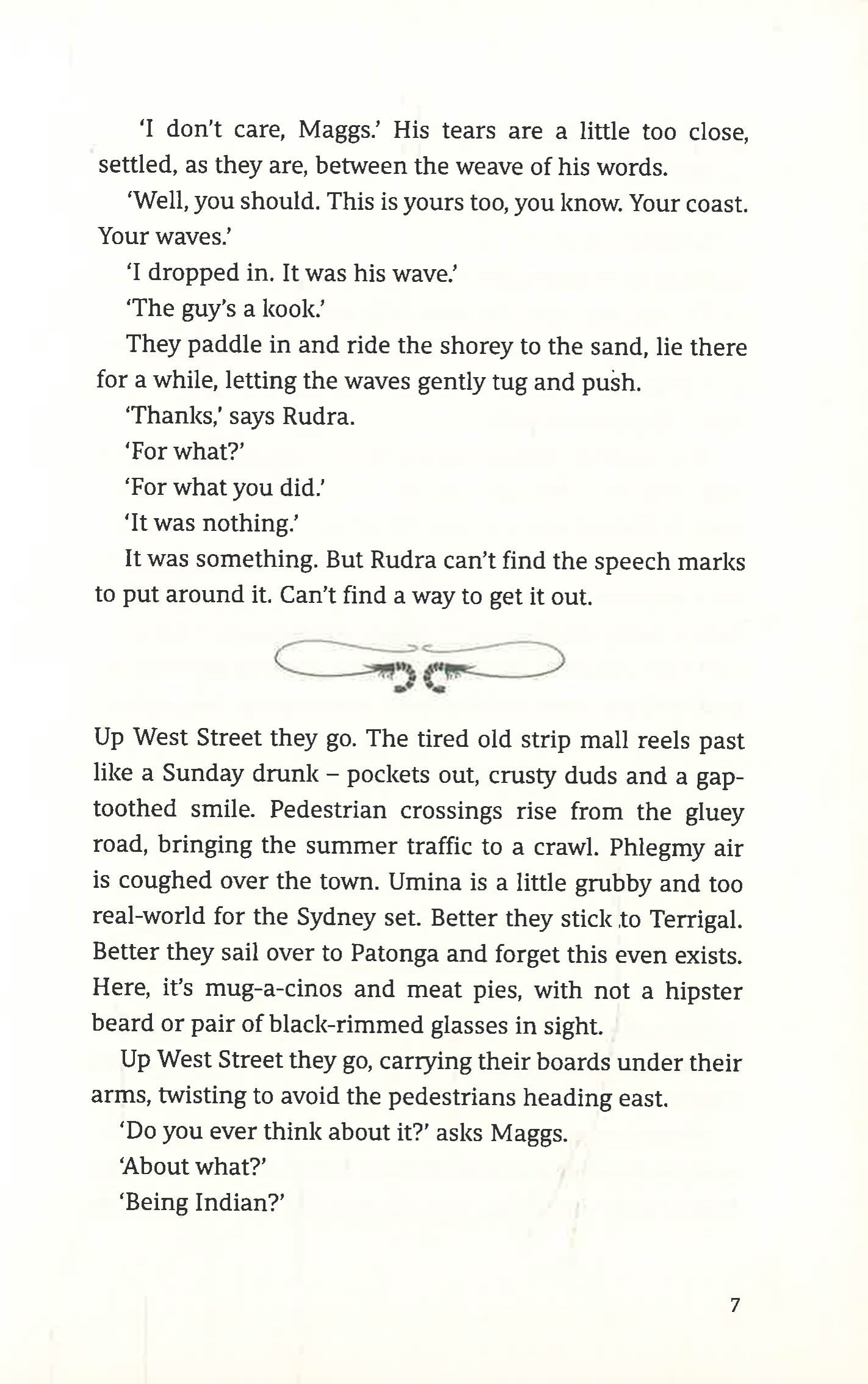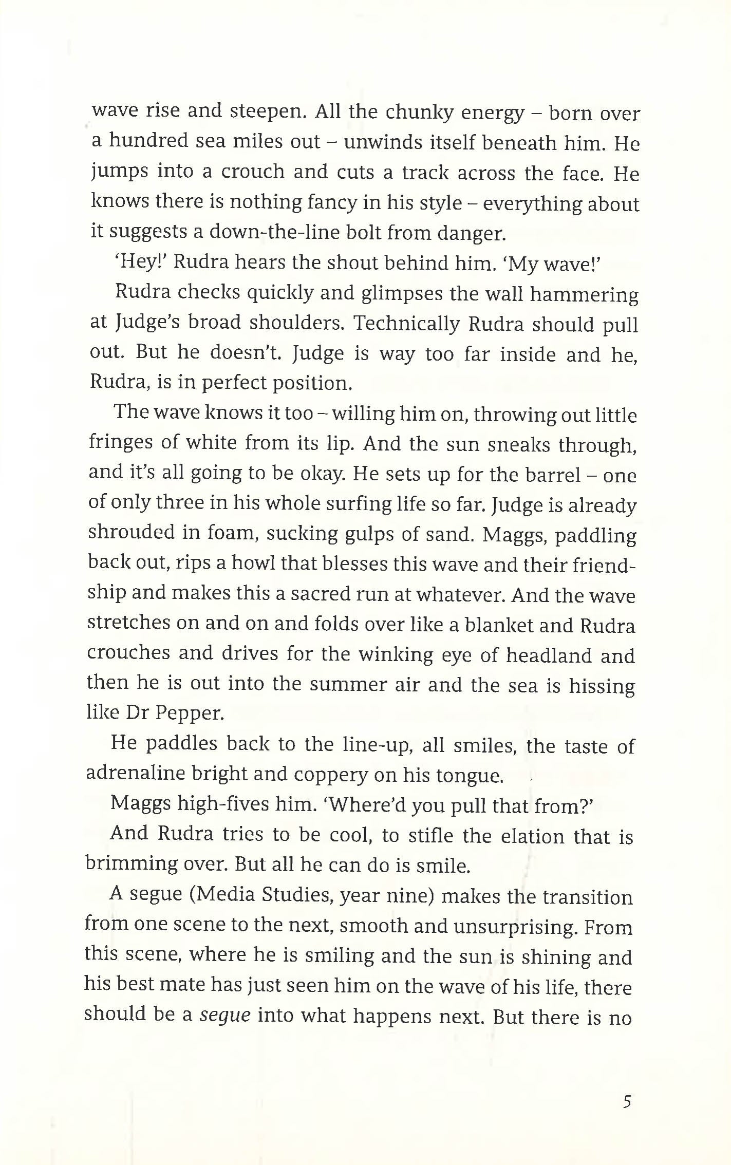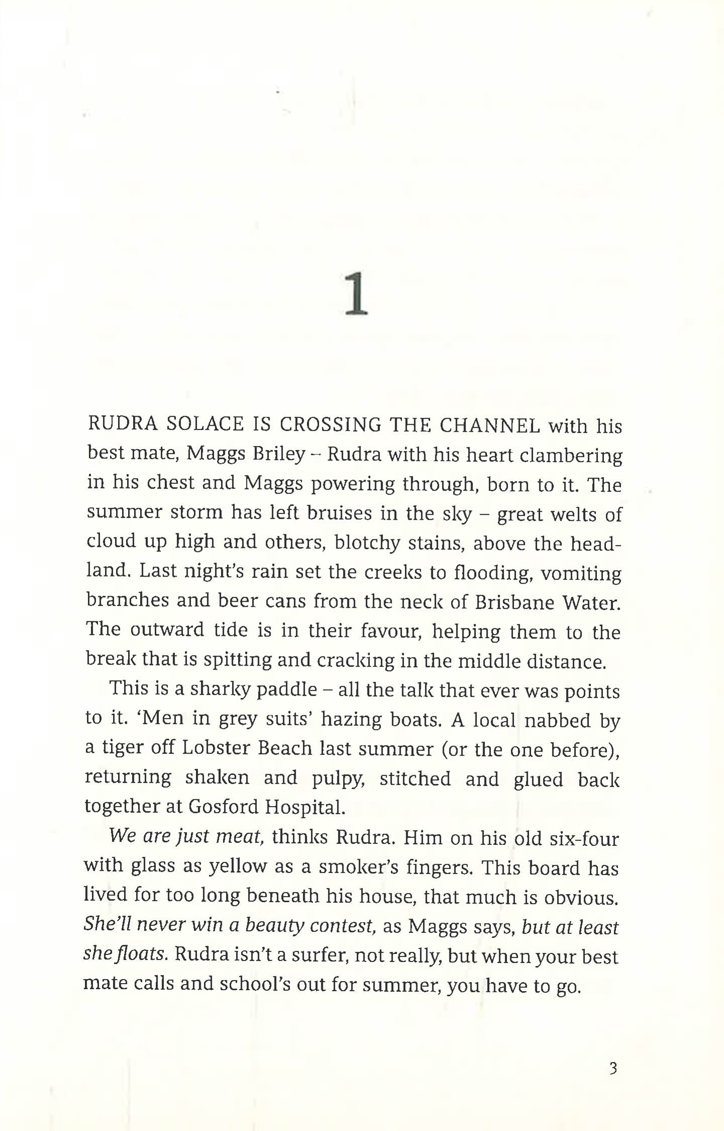 The seas is inside his blood. Cursed, or blessed, on both sides. When sixteen-year-old Rudra Solace dredges up a long-hidden secretfin his father' trawl net, his life in the sleepy fishing village of Patonga shifts dramatically. It is not long before Rudra is leaving Australia behind, bound for India on a journey of discovery and danger. A wonderfully compelling tale of belonging and loss, of saltwater and mangroves, of migration and accepting change; a story of decisions that, once made, break through family histories like a cyclone swell.