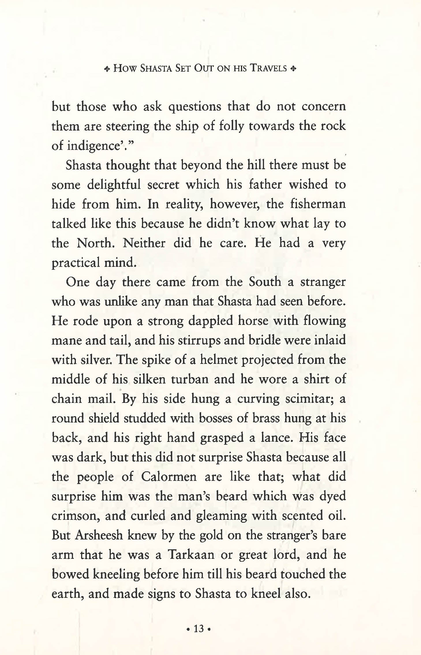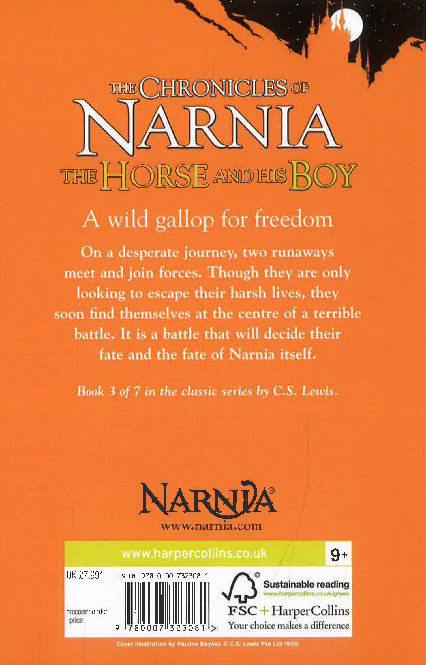 A beautiful paperback edition of The Horse and His Boy, book three in the classic fantasy series, The Chronicles of Narnia. This edition is complete with cover and interior art by the original illustrator, Pauline Baynes.On a desperate journey, two runaways meet and join forces. Though they are only looking to escape their harsh and narrow lives, they soon find themselves at the centre of a terrible battle. It is a battle that will decide their fate and the fate of Narnia itself.The Horse and His Boy is the third book in C. S. Lewis’s classic fantasy series that has drawn readers of all ages into a magical land where horses talk and destiny awaits for over sixty years. This is a novel that stands on its own, but if you would like to return to Narnia, read Prince Caspian, the fourth book in The Chronicles of Narnia.