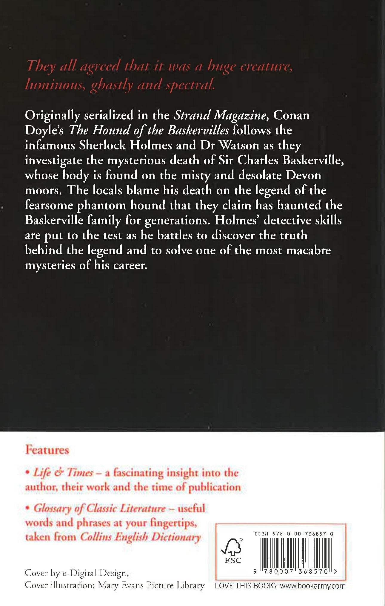 Originally serialized in The Strand Magazine, Conan Doyle's The Hound of the Baskervilles follows the infamous Sherlock Holmes and Dr Watson as they investigate the mysterious death of Sir Charles Baskerville, whose dead body is found on the misty and desolate Devon moors. The locals blame his death on the legend of the fearsome phantom hound that they claim has haunted the Baskerville family for generations. When the heir to the Baskerville fortune, Sir Henry, also comes under threat Holmes' detective skills are put to the test as he battles to discover the truth behind the legend and to solve one of the most macabre mysteries of his career.