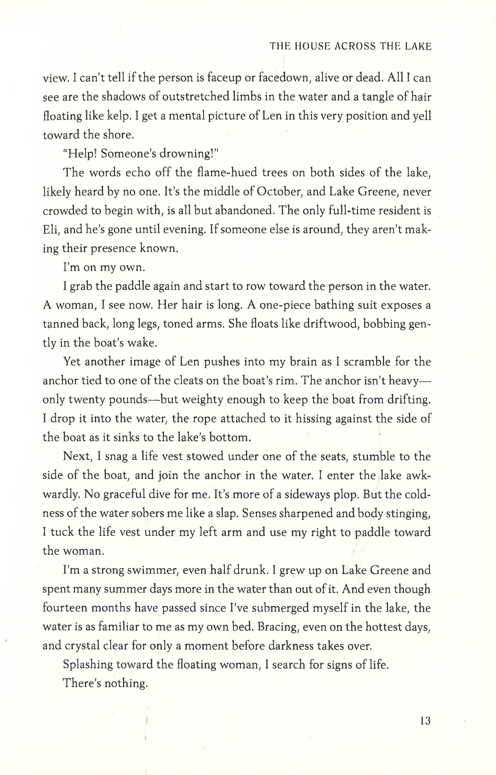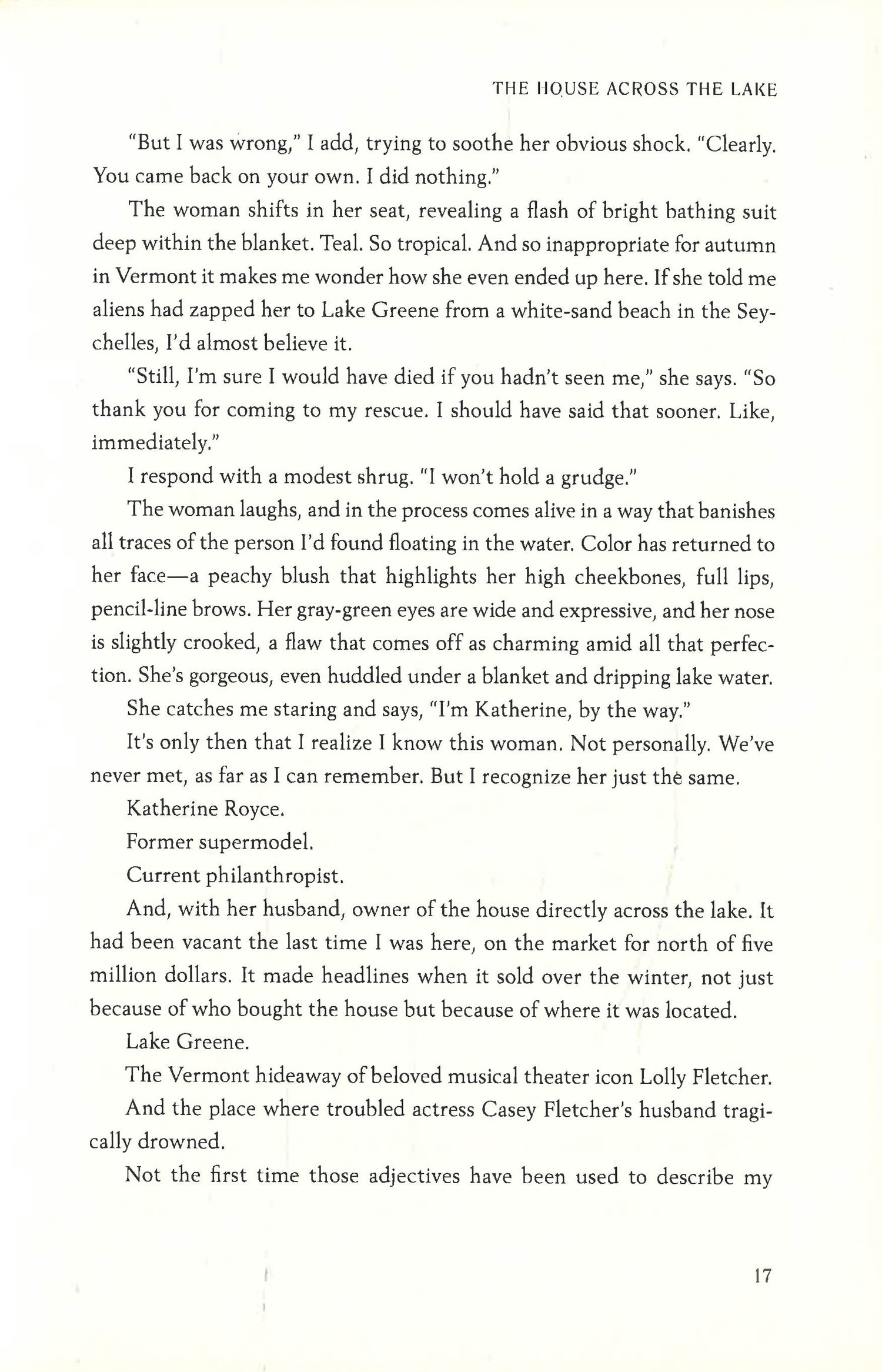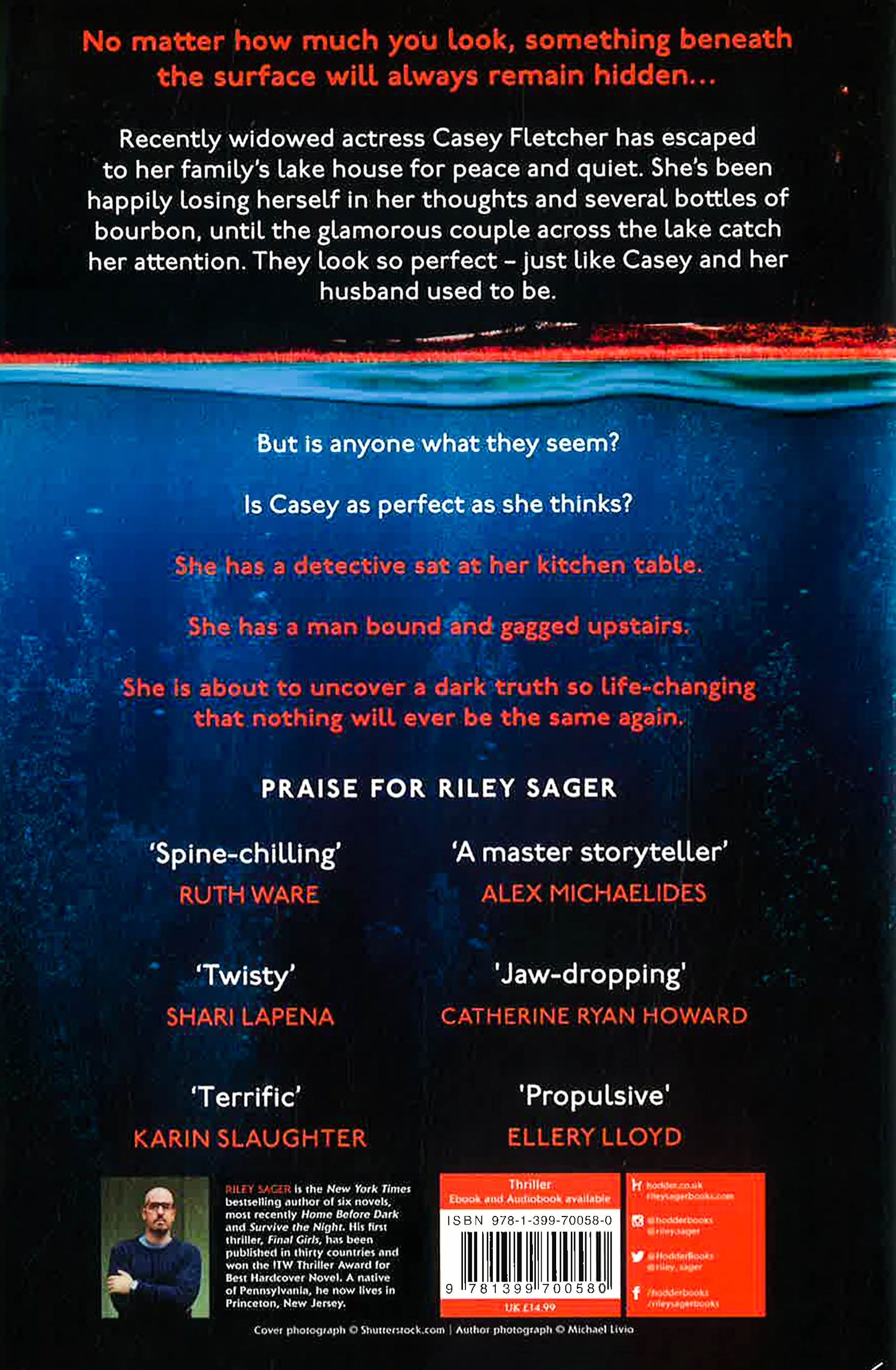 Recently widowed actress Casey Fletcher has escaped to her family's lake house for peace and quiet. She's been happily losing herself in her thoughts and several bottles of bourbon, until the glamorous couple across the lake catch her attention. They look so perfect - just like Casey and her husband used to be. But is anyone what they seem? Casey has a detective sat at her kitchen table. She has a man bound and gagged upstairs. Casey will uncover dark truths so life-changing that nothing will ever be the same again. International bestselling sensation Riley Sager is back with his most ambitious thriller yet. With his trademark blend of sharp characters, psychological suspense and gasp-worthy twists, The House Across the Lake will shock readers from the first page to the last.