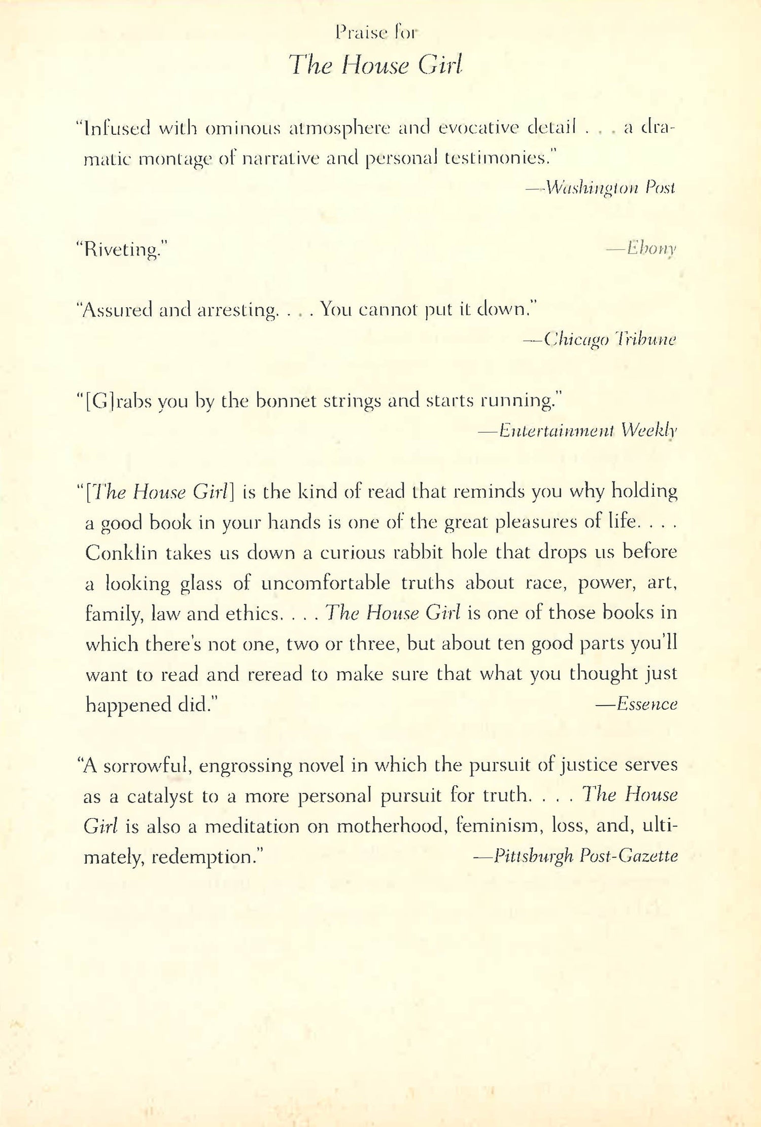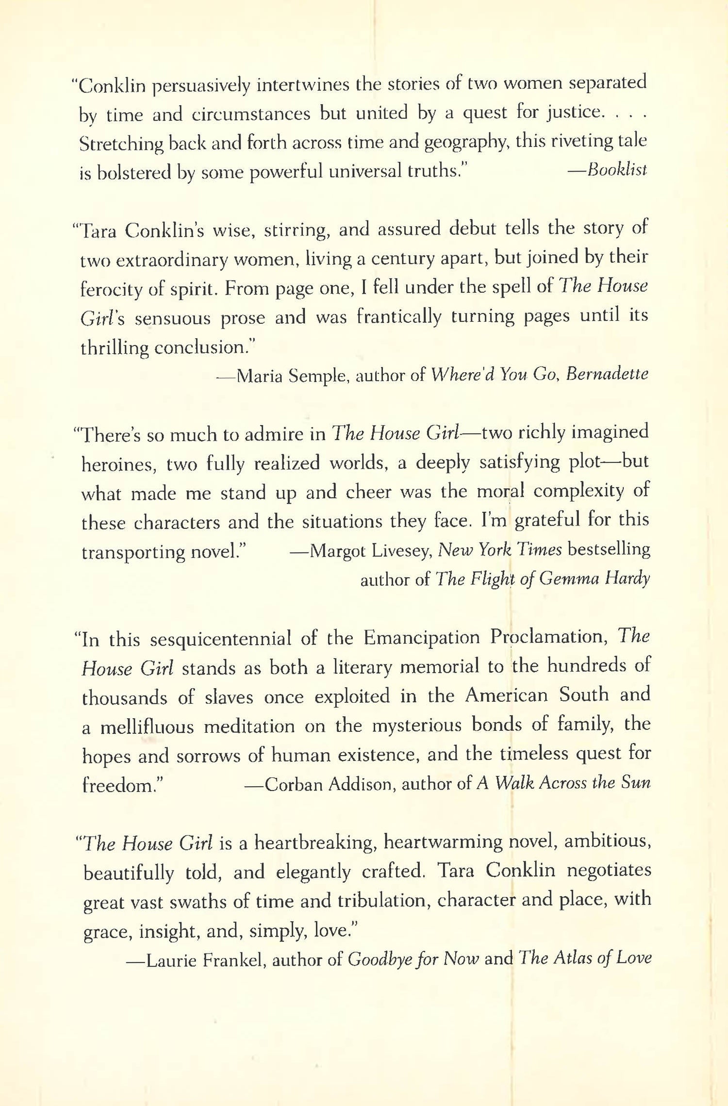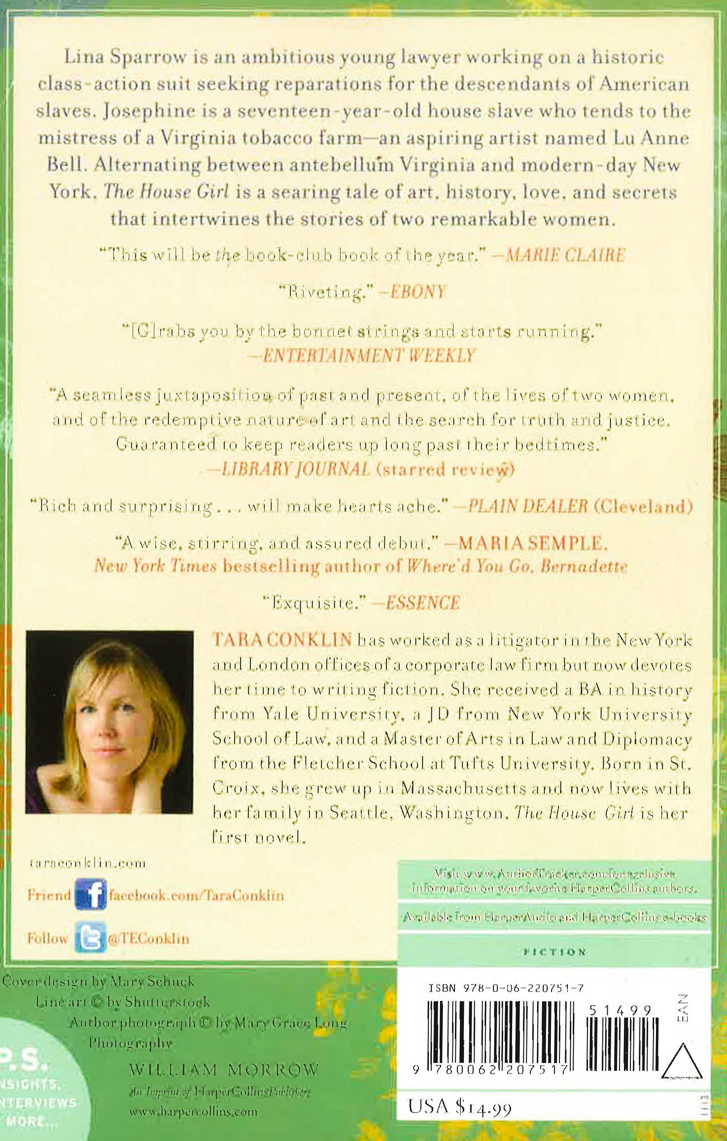 The House Girl, the historical fiction debut by Tara Conklin, is an unforgettable story of love, history, and a search for justice, set in modern-day New York and 1852 Virginia. Weaving together the story of an escaped slave in the pre-Civil War South and a determined junior lawyer, The House Girl follows Lina Sparrow as she looks for an appropriate lead plaintiff in a lawsuit seeking compensation for families of slaves. In her research, she learns about Lu Anne Bell, a renowned prewar artist whose famous works might have actually been painted by her slave, Josephine. Featuring two remarkable, unforgettable heroines, Tara Conklin's The House Girl is riveting and powerful, literary fiction at its very best. *This book may have remainder mark*