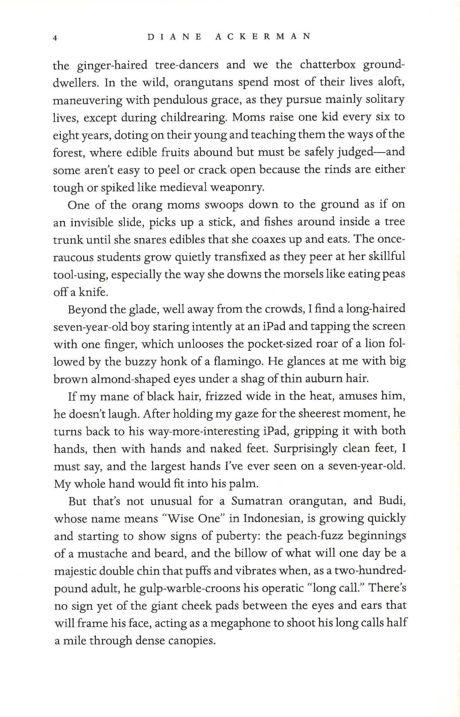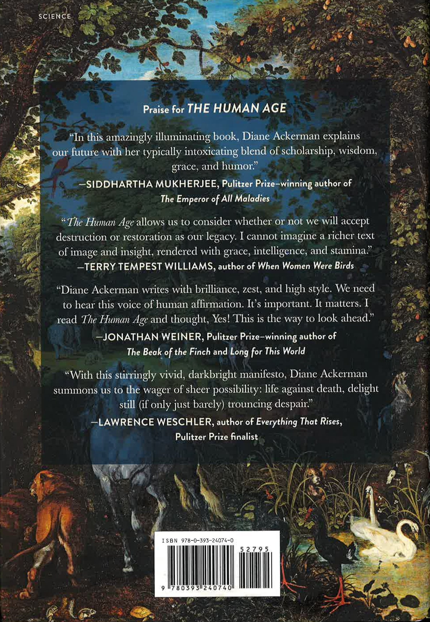 Ackerman is justly celebrated for her unique insight into the natural world and our place in it. In this landmark book, she confronts the unprecedented reality that one prodigiously intelligent and meddlesome creature, Homo sapiens, is now the dominant force shaping the future of planet Earth. Humans have "subdued 75 percent of the land surface, concocted a wizardry of industrial and medical marvels, strung lights all across the darkness." We tinker with nature at every opportunity; we garden the planet with our preferred species of plants and animals, many of them invasive; and we have even altered the climate, threatening our own extinction. Yet we reckon with our own destructive capabilities in extraordinary acts of hope-filled creativity: we collect the DNA of vanishing species in a "frozen ark," equip orangutans with iPads, and create wearable technologies and synthetic species that might one day outsmart us. With her distinctive gift for making scientific discovery intelligible to the layperson, Ackerman takes us on an exhilarating journey through our new reality, introducing us to many of the people and ideas now creating-perhaps saving-our future and that of our fellow creatures. A beguiling, optimistic engagement with the changes affecting every part of our lives, The Human Age is a wise and beautiful book that will astound, delight, and inform intelligent life for a long time to come.
