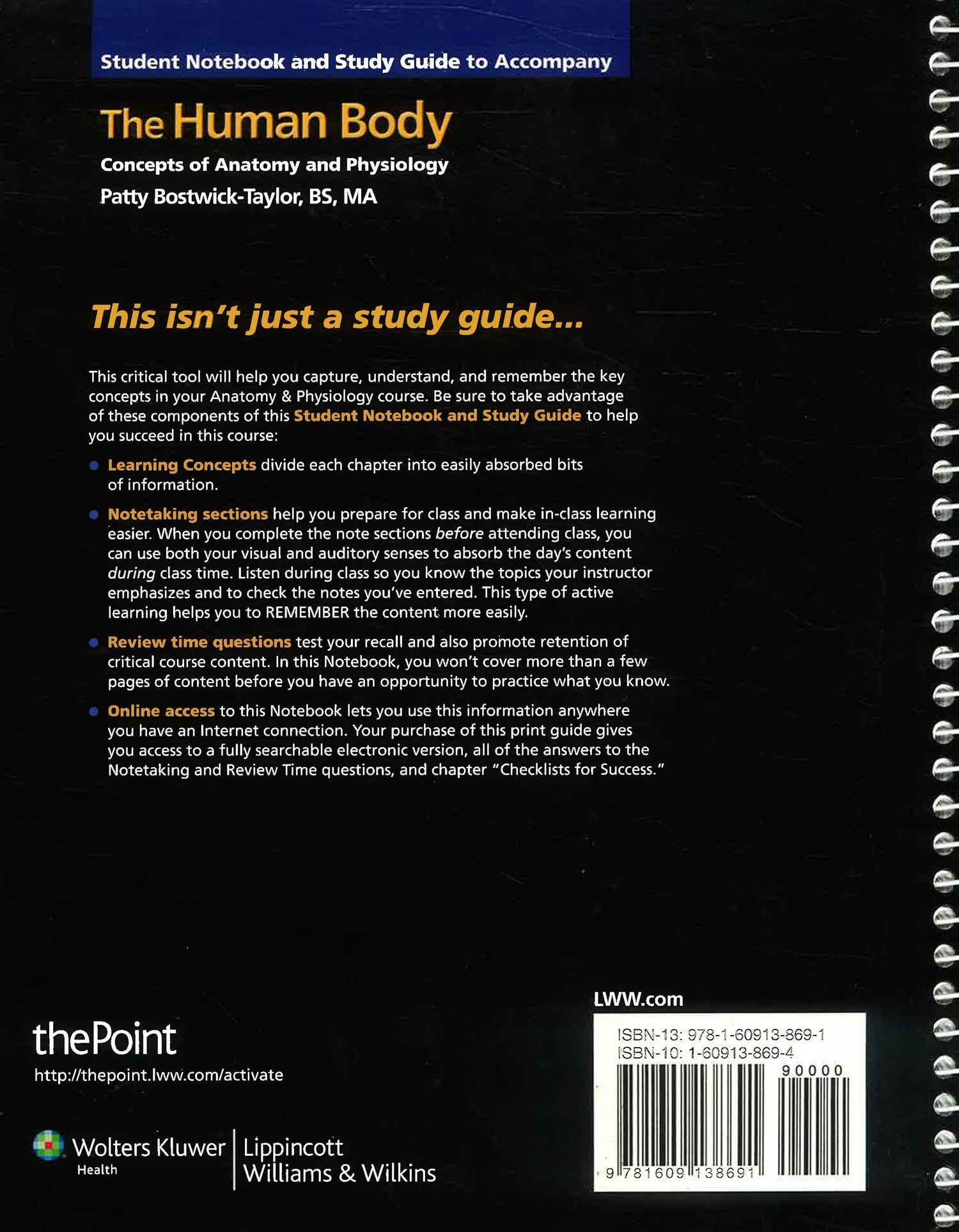This Student Notebook and Study Guide , the ideal companion to Bruce Wingerd's The Human Body , reinvents the traditional study guide by giving students a tool to help grasp information in class and reinforce learning outside of class. Too often, students struggle to both learn the concepts presented and simultaneously record crucial information. The Student Notebook and Study Guide provides a structure for recording in-class material that parallels the text's concept presentation, and includes supplemental questions and activities for assignment outside of the classroom. A complete answer guide for both the in-class and out-of-class materials is available online.