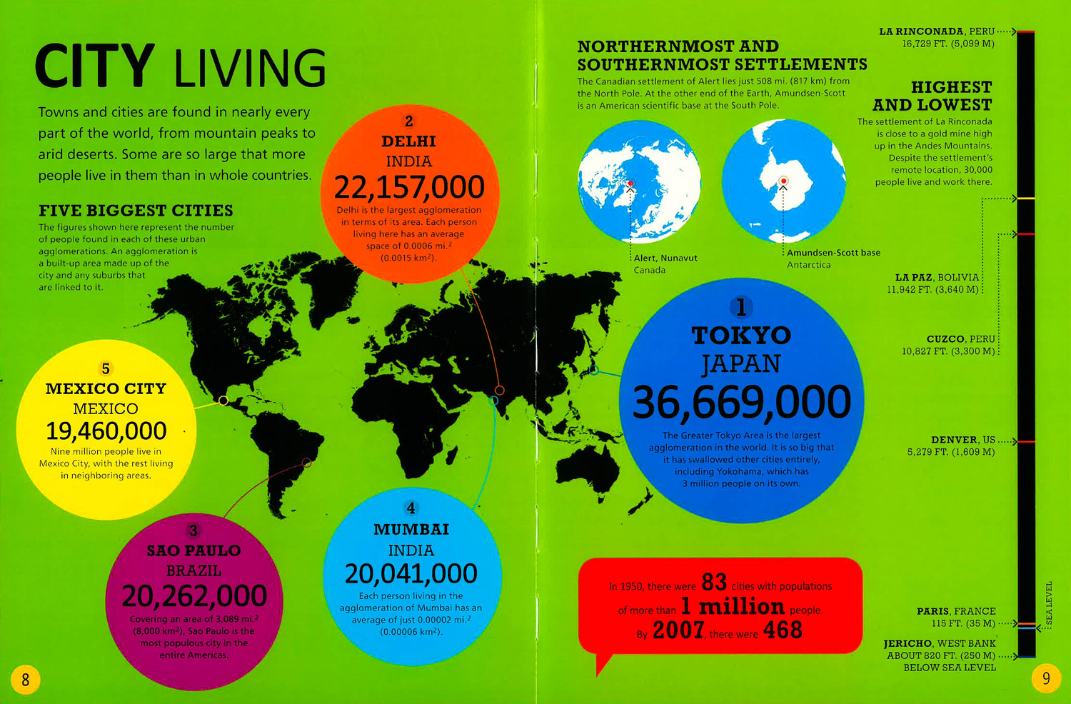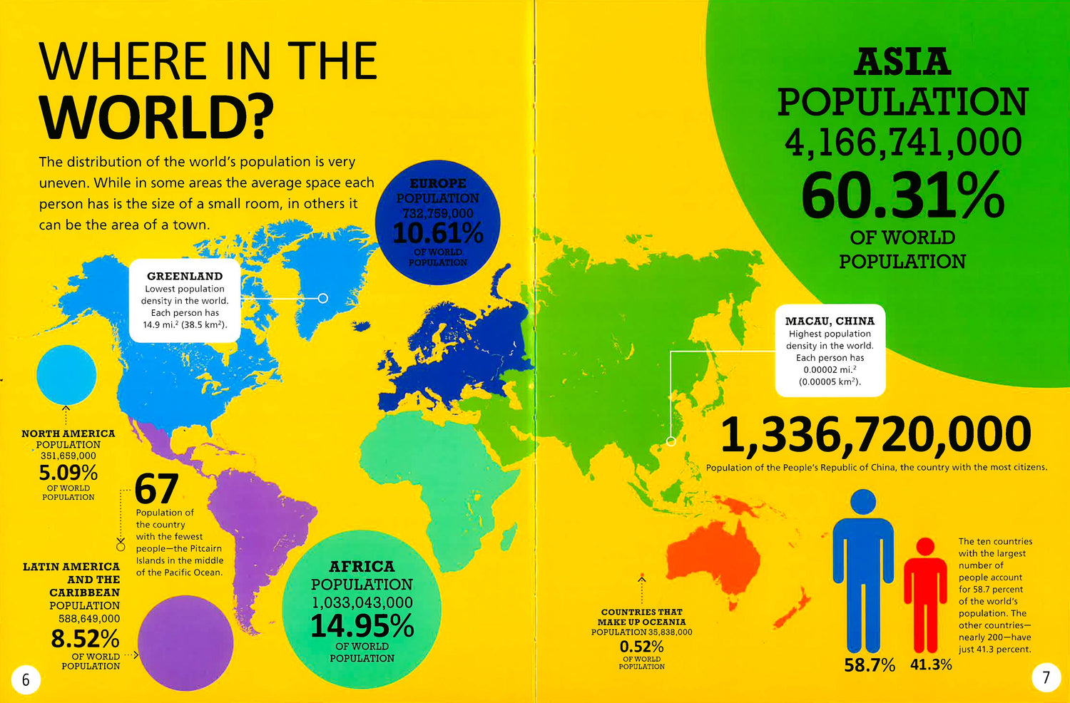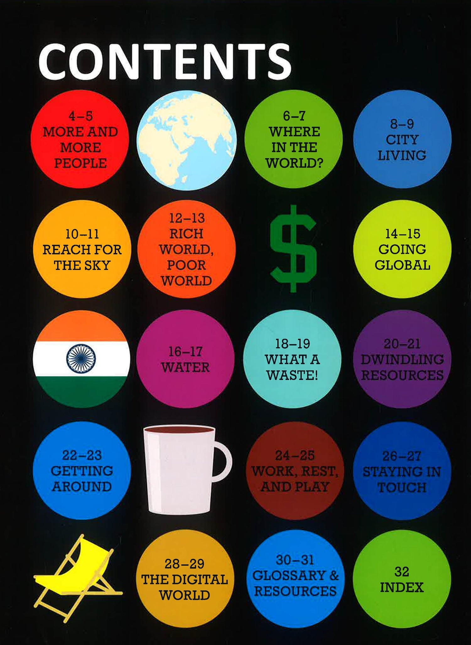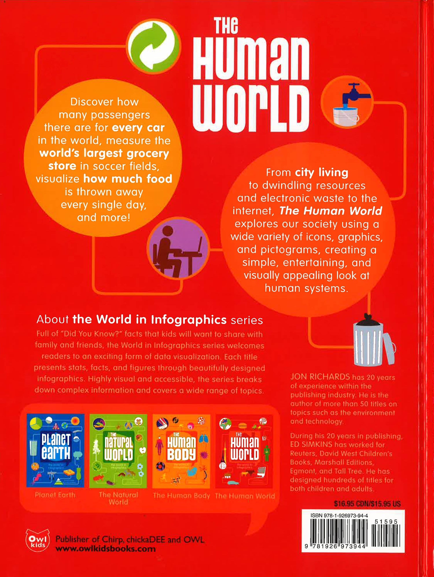 Discover how many passengers there are for every car in the world, measure the world's largest grocery store in soccer fields, visualize how much food is thrown away every single day, and more! From population growth and distribution of wealth to natural resources, access to water, and how we communicate with one another, this book explores our world using a wide variety of icons, graphics, and pictograms.
