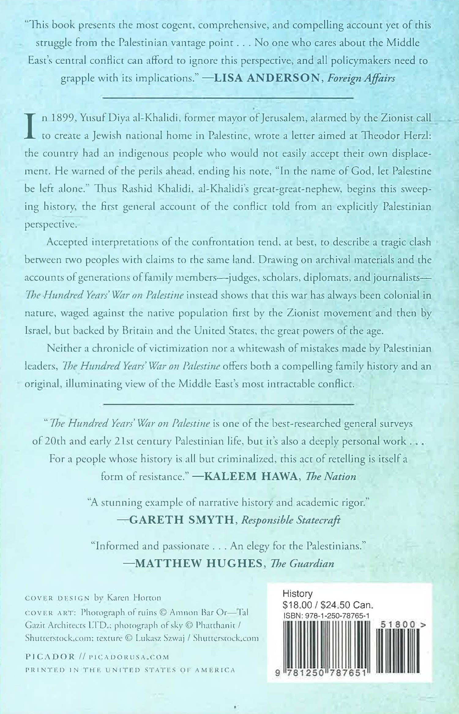 In 1899, Yusuf Diya al-Khalidi, mayor of Jerusalem, alarmed by the Zionist call to create a Jewish national home in Palestine, wrote a letter aimed at Theodore Herzl: the country had an indigenous people who would not easily accept their own displacement. He warned of the perils ahead, ending his note, “in the name of God, let Palestine be left alone.” Thus Rashid Khalidi, al-Khalidi’s great-great-nephew, begins this sweeping history, the first general account of the conflict told from an explicitly Palestinian perspective.
