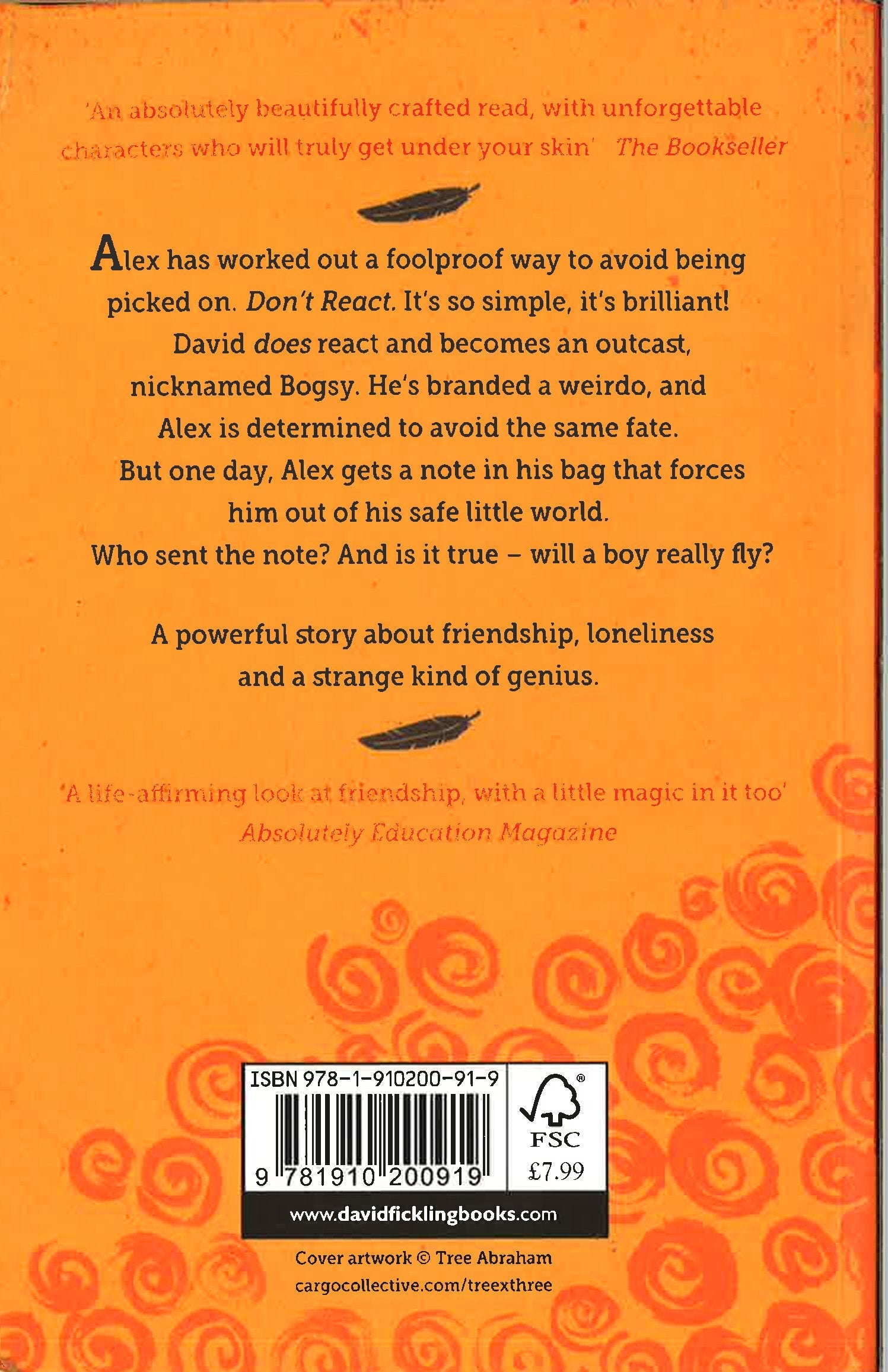 A deeply insightful novel that poignantly deals with bullying, friendship and loneliness. Sally Christie has created a beautifully simple and engaging story that will touch your heart. Alex has worked out a foolproof way to avoid being picked on. Don't React. It's so simple, it's brilliant! David does react and becomes an outcast, nicknamed Bogsy. He's branded a weirdo, and Alex is determined to avoid the same fate. But one day, Alex gets a note in his bag that forces him out of his safe little world. Who sent the note? And is it true - will a boy really fly? A powerful story about friendship, loneliness and a strange kind of genius.