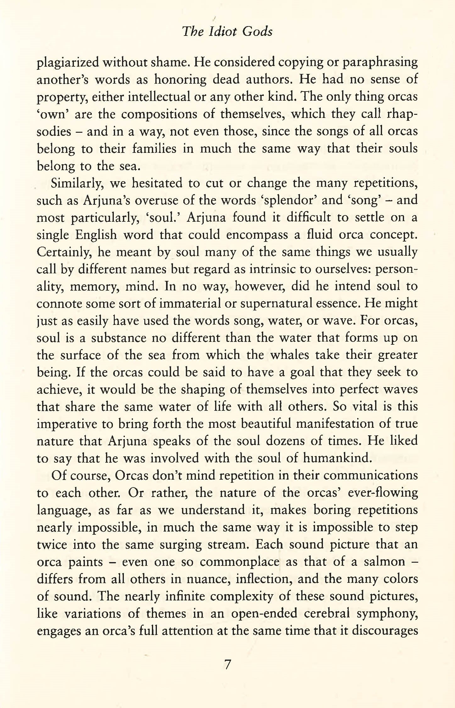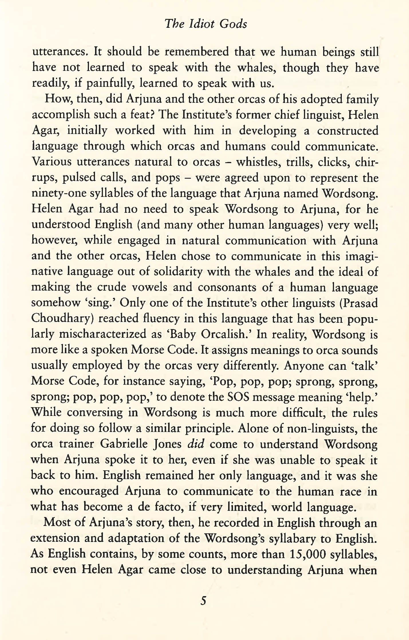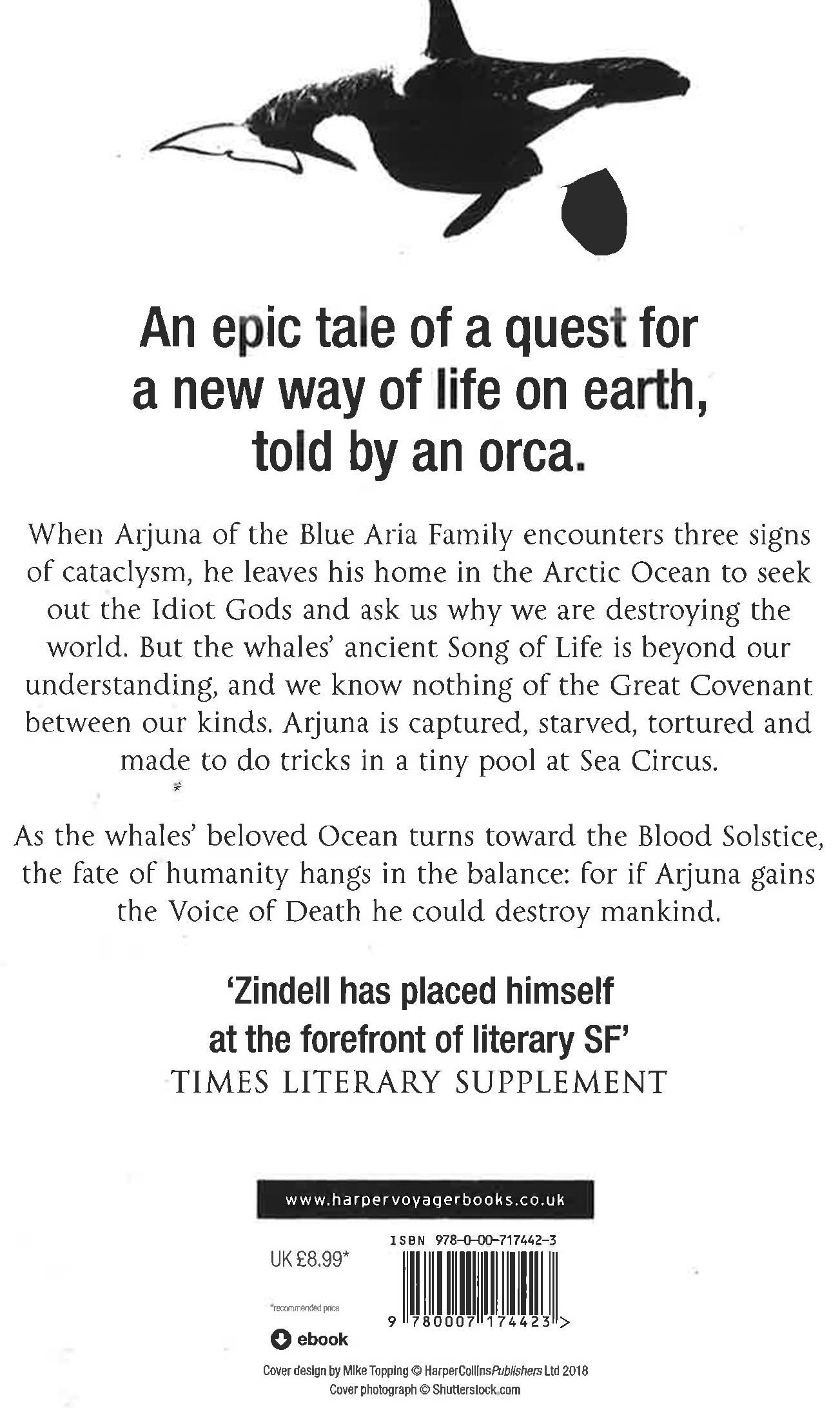 Quite simply the best book about a whale since Moby Dick. The Idiot Gods is an epic tale told by an orca. David Zindell returns to the grand themes of Neverness in this uniquely moving book. An epic tale of a quest for a new way of life on earth, told by an orca. When Arjuna of the Blue Aria Family encounters three signs of cataclysm, he leaves his home in the Arctic Ocean to seek out the Idiot Gods and ask us why we are destroying the world. But the whales' ancient Song of Life is beyond our understanding, and we know nothing of the Great Covenant between our kinds. Arjuna is captured, starved, tortured and made to do tricks in a tiny pool at Sea Circus. His love for a human linguist gives him hope, even as he despairs that other people twist his words and continue the worldwide slaughter. As the whales' beloved Ocean turns toward the Blood Solstice the fate of humanity hangs in the balance: for if Arjuna gains the Voice of Death he could destroy mankind. But if understanding can prevail, he may, through the whales' mysterious power of quenging, create a new Song of Life and enable human evolution to unfold.
