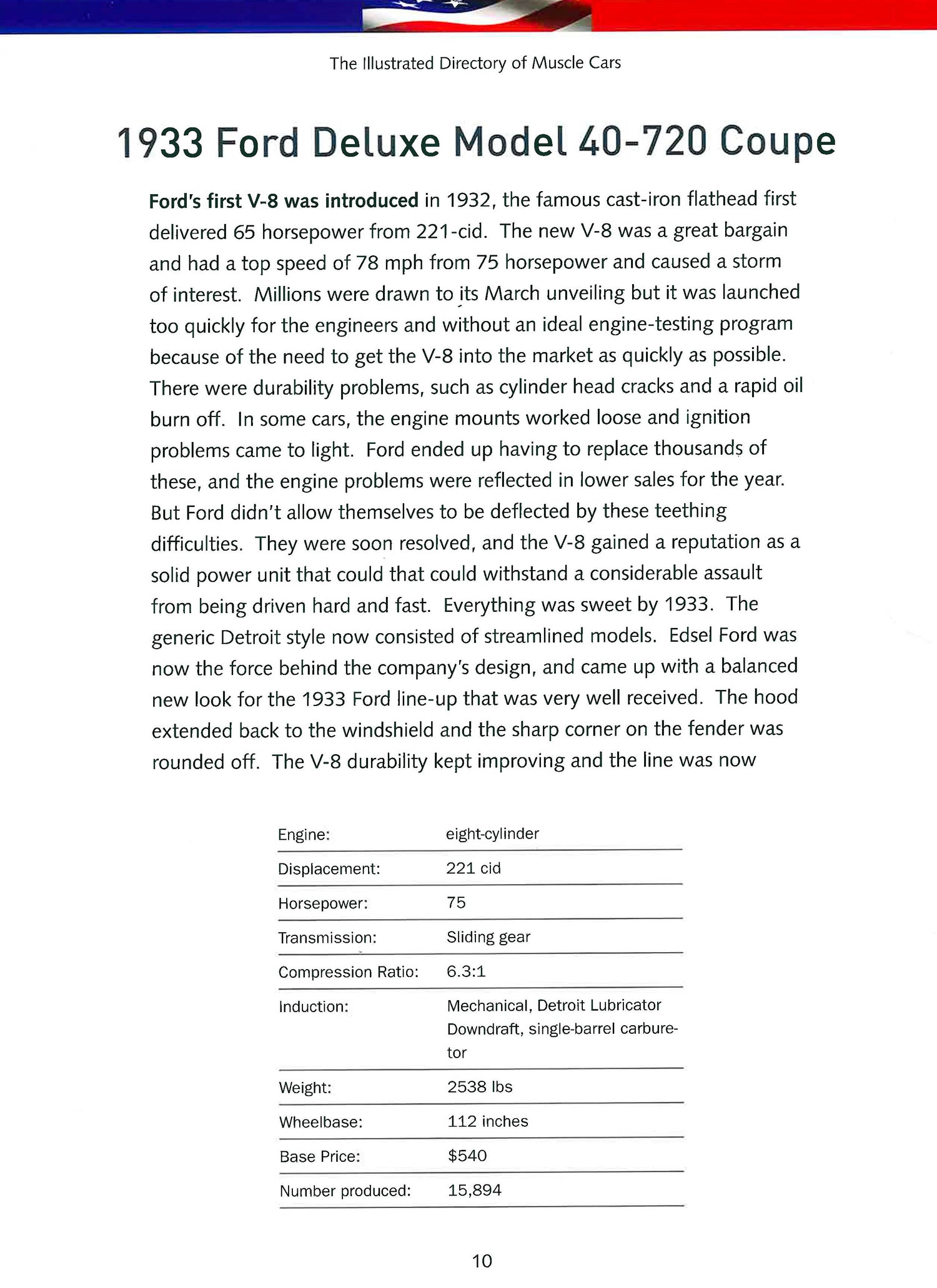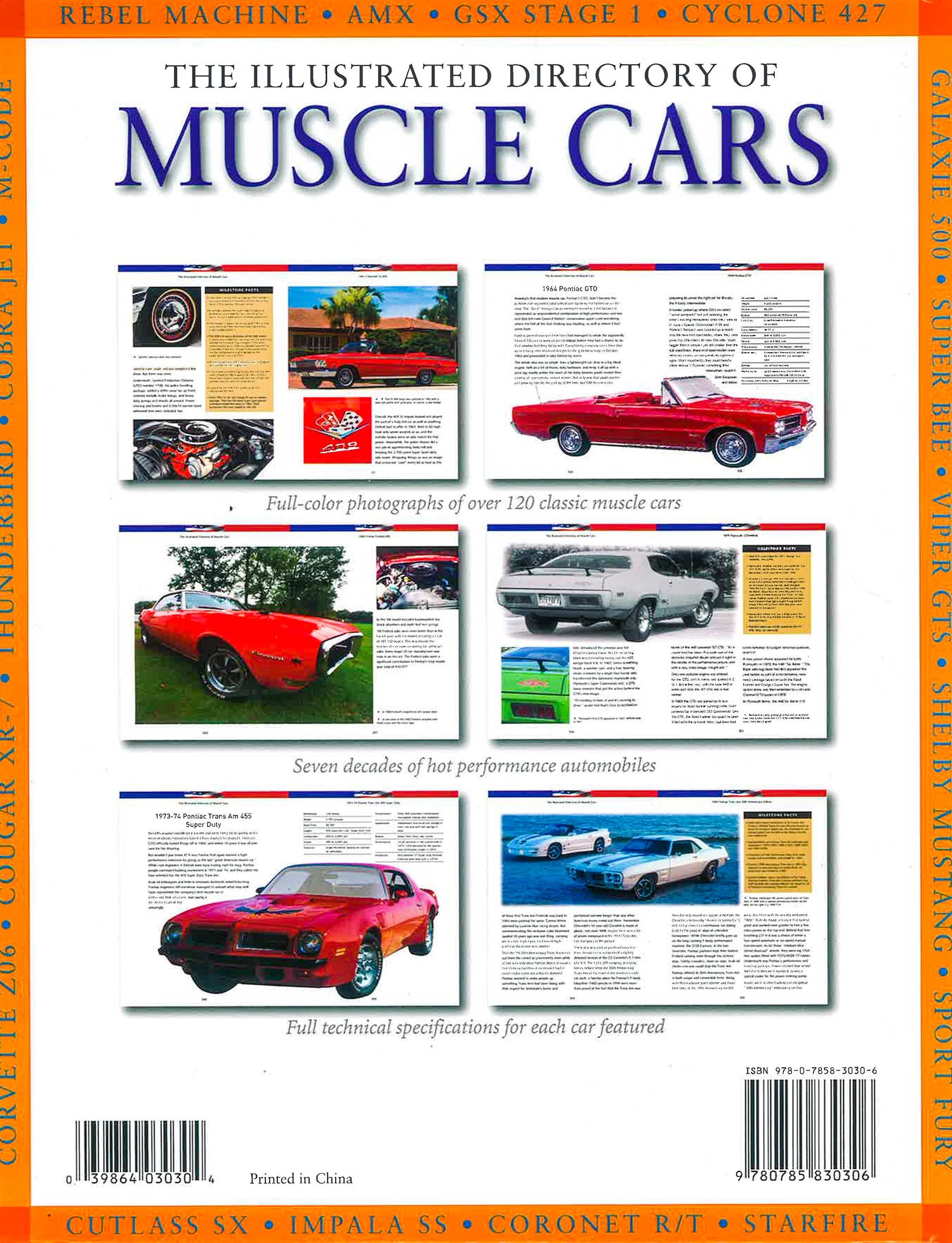 The American public's love for speed and power has inspired generations of muscle cars. The rising popularity of street racing, stock-car races, and quarter-mile drag races in the pre-war years led to the formation of the National Association for Stock Car Auto Racing in 1947 and the National Hot Rod Association in 1951. These organizations and the growing plethora of specialist auto magazines (including Hot Rod and Motor Trend) stimulated America's fascination with speed and performance. In turn, this resulted in the development of the first production muscle cars. These powerful models took their heritage from the street racers of earlier days, with small bodies equipped with large and potent engines."The Illustrated Directory of Muscle Cars" celebrates the complete history of the muscle car, from its earliest inception through to the sophisticated beasts of today. Beautifully illustrated throughout in full color, this book includes full technical specifications for each car featured.