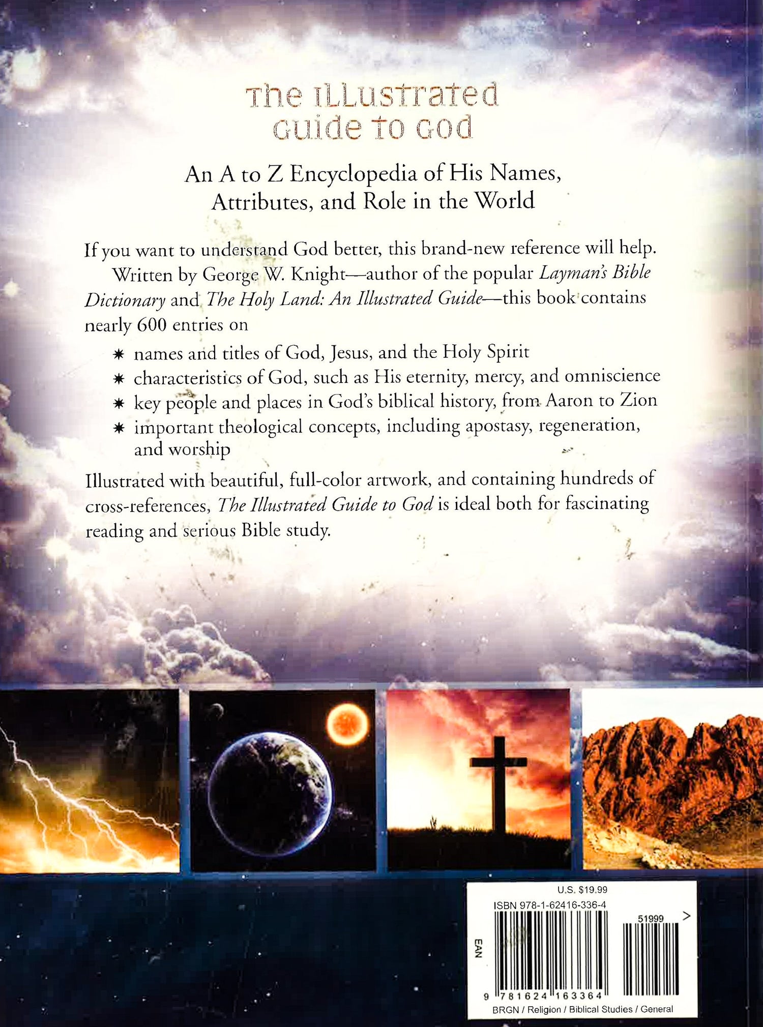 If you want to understand God better, read "The Illustrated Guide to God--An A to Z Encyclopedia of His Names, Attributes, and Role in the World." This brand-new reference from George W. Knight--author of the popular "Layman's Bible Dictionary" and "The Holy Land: An Illustrated Guide--"contains nearly 600 entries on the names of God, Jesus, and the Holy Spirit; characteristics of God, such as His eternity, jealousy, and omniscience; key people and places in God's biblical history, from Aaron to Zion; and important theological concepts, including apostasy, regeneration, and worship. Illustrated with beautiful, full-color artwork, and containing hundreds of cross-Reference, "The Illustrated Guide to God" is ideal both for fascinating reading and serious Bible study.