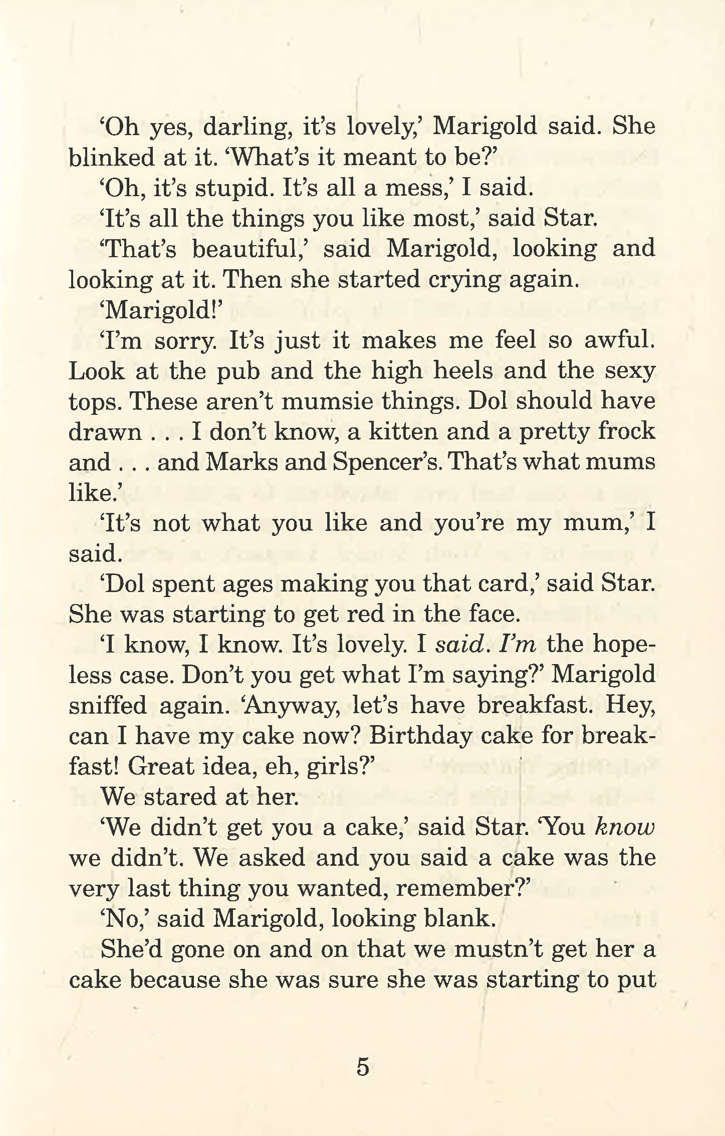 Covered from head to foot with glorious tattoos, Marigold is the brightest, most beautiful mother in the world. That's what Dolphin thinks (she just wishes her beautiful mum wouldn't stay out partying all night or go weird now and then). Her older sister, Star, isn't so sure any more. She loves Marigold too, but sometimes she just can't help wishing she were more normal . . .