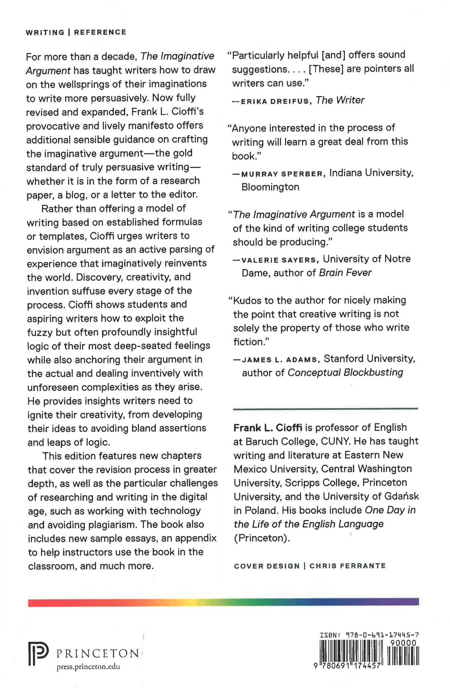 More than merely a writing text, The Imaginative Argument offers writers instruction on how to use their imaginations to improve their prose. Cioffi shows writers how they can enliven argument--the organizing rubric of all persuasive writing--by drawing on emotion, soul, and creativity, the wellsprings of imagination. While Cioffi suggests that argument should become a natural habit of mind for writers, he goes still further, inspiring writers to adopt as their gold standard the imaginative argument: the surprising yet strikingly apt insight that organizes disparate noises into music, that makes out of chaos, chaos theory. Rather than offering a model of writing based on established formulas or templates, Cioffi urges writers to envision argument as an active parsing of experience that imaginatively reinvents the world. Cioffi's manifesto asserts that successful argument also requires writers to explore their own deep-seated feelings, to exploit the fuzzy but often profoundly insightful logic of the imagination. But expression is not all that matters: Cioffi's work anchors itself in the actual. Drawing on Louis Kahn's notion that a good architect never has all the answers to a building's problems before its physical construction, Cioffi maintains that in argument, too, answers must be forged along the way, as the writer inventively deals with emergent problems and unforeseen complexities. Indeed, discovery, imagination, and invention suffuse all stages of the process. The Imaginative Argument offers all the intellectual kindling that writers need to ignite this creativity, from insights on developing ideas to avoiding bland assertions or logical leaps. It cites exemplary nonfiction prose stylists, including William James, Ruth Benedict, and Erving Goffman, as well as literary sources to demonstrate the dynamic of persuasive writing. Provocative and lively, it will prove not only essential reading but also inspiration for all those interested in arguing more imaginatively more successfully. This edition features new chapters that cover the revision process in greater depth, as well as the particular challenges of researching and writing in the digital age, such as working with technology and avoiding plagiarism. The book also includes new sample essays, an appendix to help instructors use the book in the classroom, and much more.