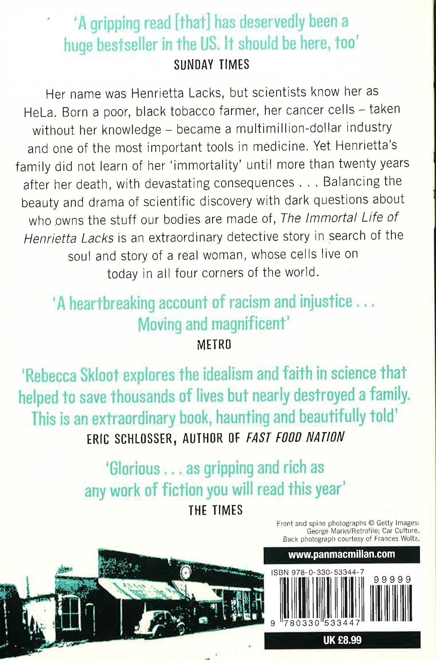 Her name was Henrietta Lacks, but scientists know her as HeLa. Born a poor black tobacco farmer, her cancer cells - taken without her knowledge - became a multimillion-dollar industry and one of the most important tools in medicine. Yet Henrietta's family did not learn of her 'immortality' until more than twenty years after her death, with devastating consequences . . . Rebecca Skloot's fascinating account is the story of the life, and afterlife, of one woman who changed the medical world forever. Balancing the beauty and drama of scientific discovery with dark questions about who owns the stuff our bodies are made of, The Immortal Life of Henrietta Lacks is an extraordinary journey in search of the soul and story of a real woman, whose cells live on today in all four corners of the world.