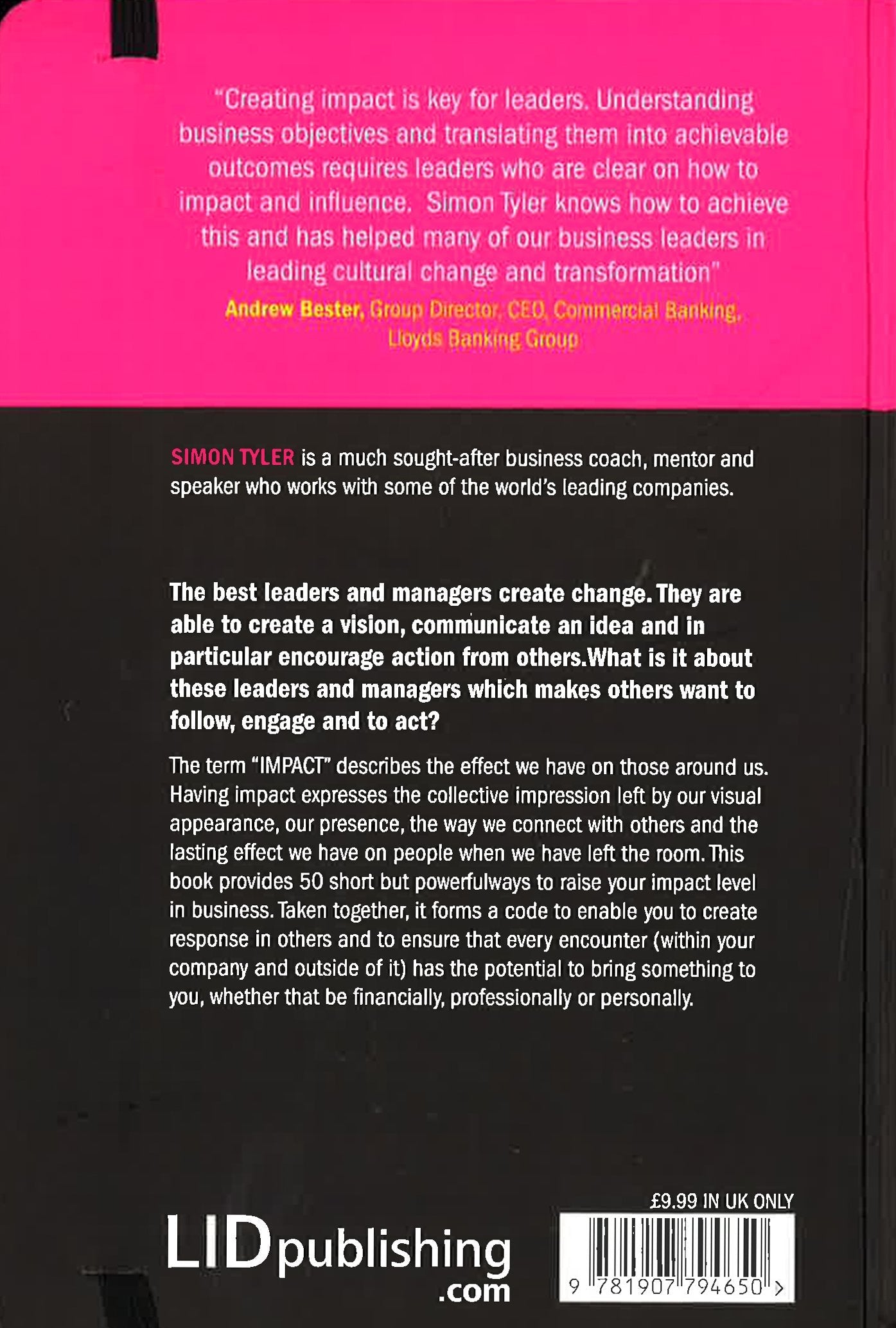 The best leaders and managers create change. They are able to create a vision, communicate an idea and in particular encourage action from others. What is it about these leaders and managers which makes others want to follow, engage and to act? The term "IMPACT" describes the effect we have on those around us. Having impact expresses the collective impression left by our visual appearance, our presence, the way we connect with others and the lasting effect we have on people when we have left the room. This book provides 50 short but powerful ways to raise your impact level in business. Taken together, it forms a code to enable you to create response in others and to ensure that every encounter (within your company and outside of it) has the potential to bring something to you, whether that be financially, professionally or personally.